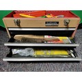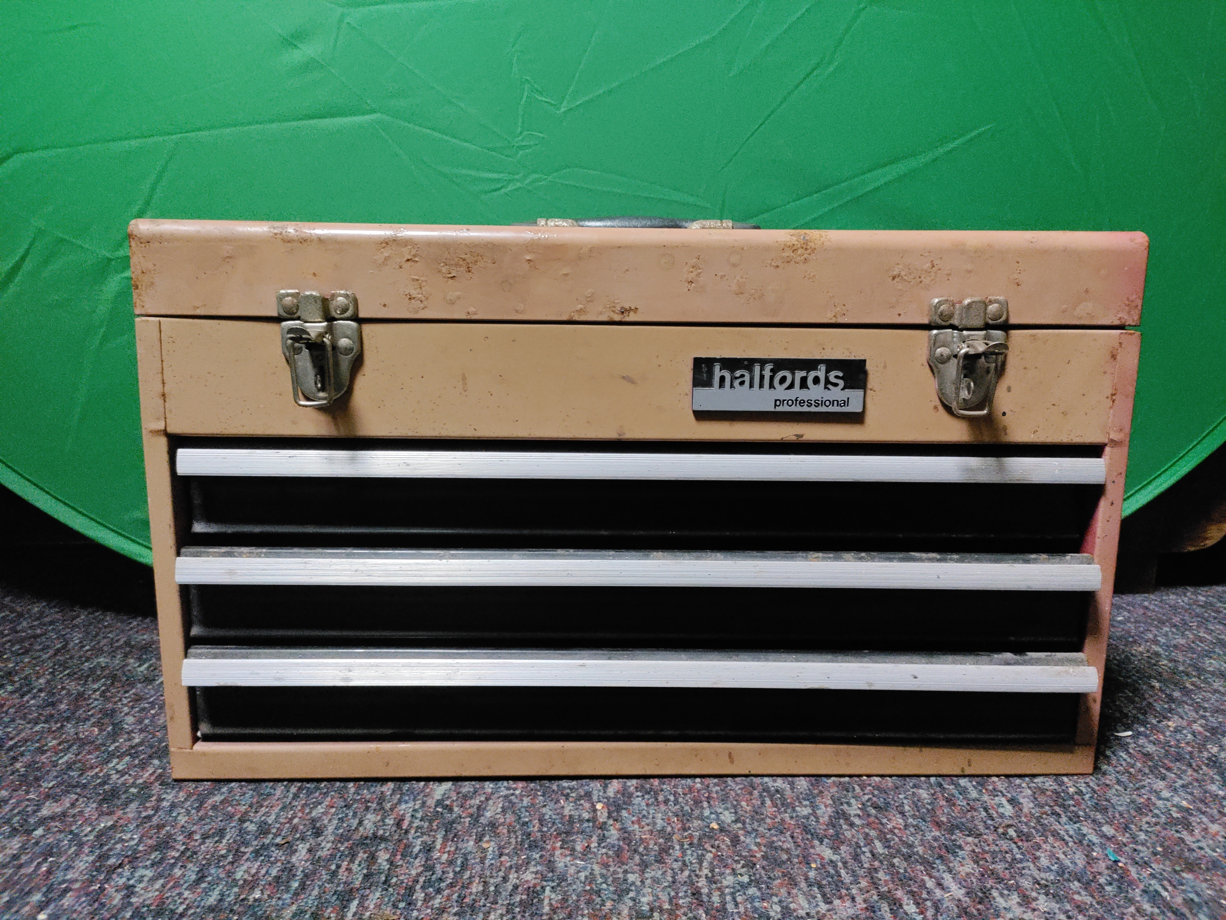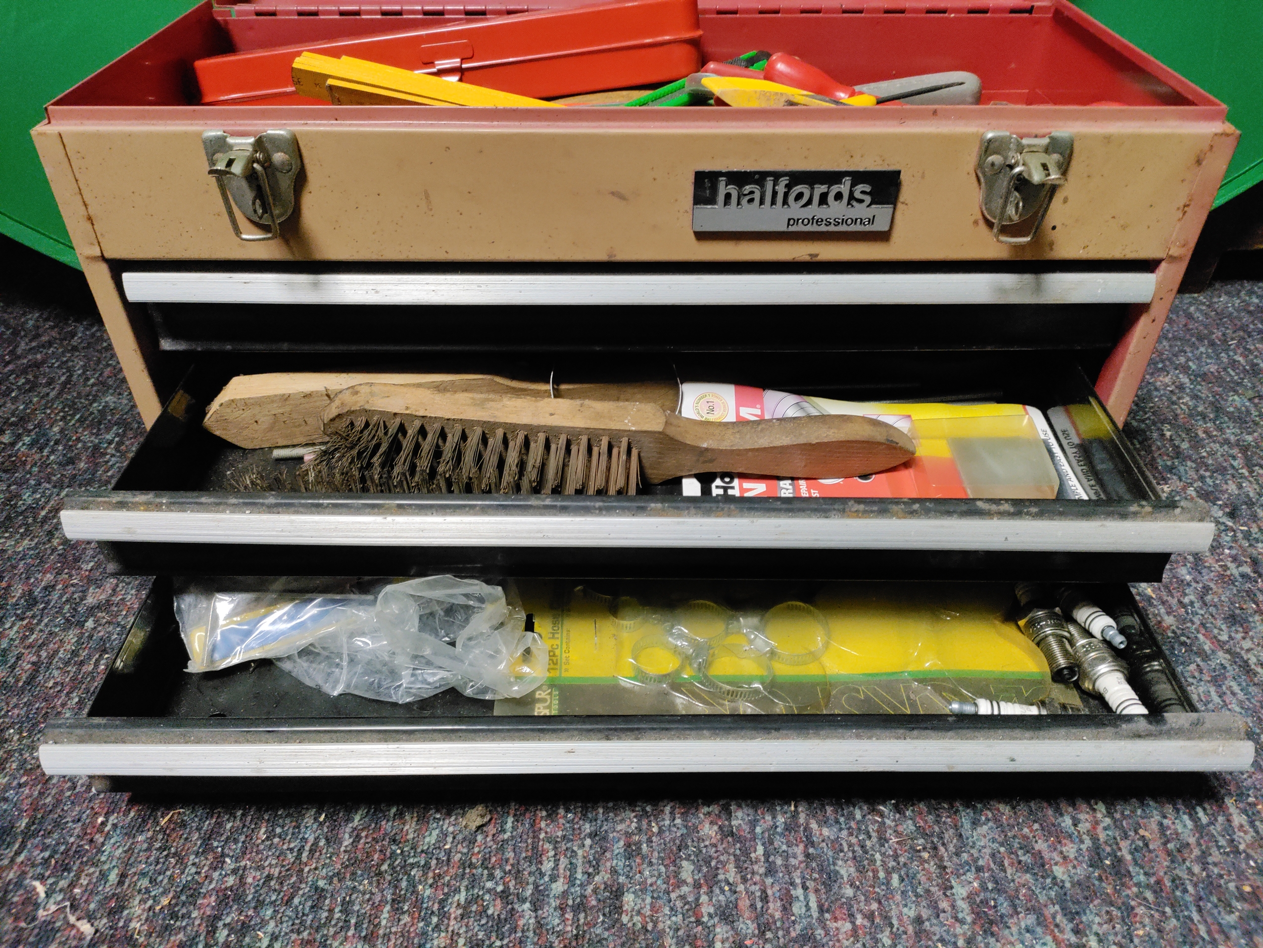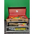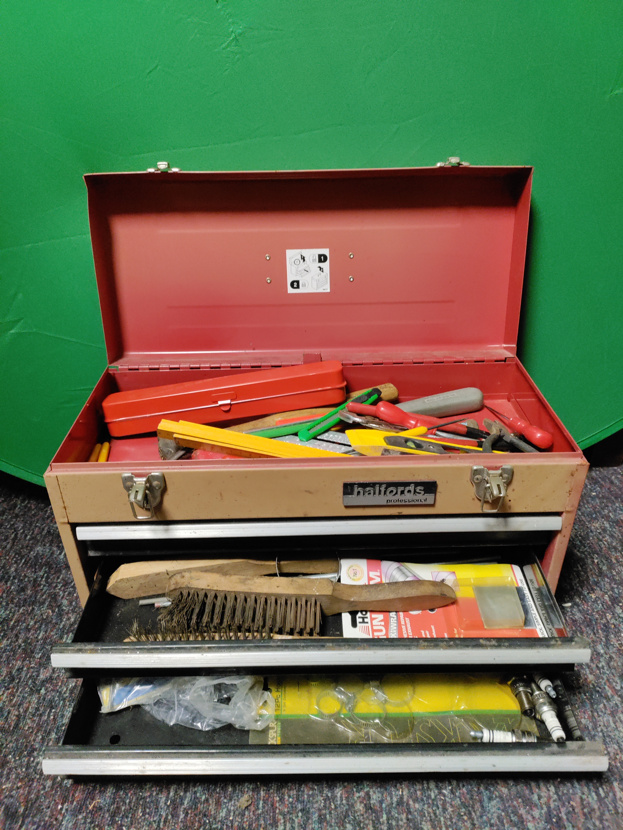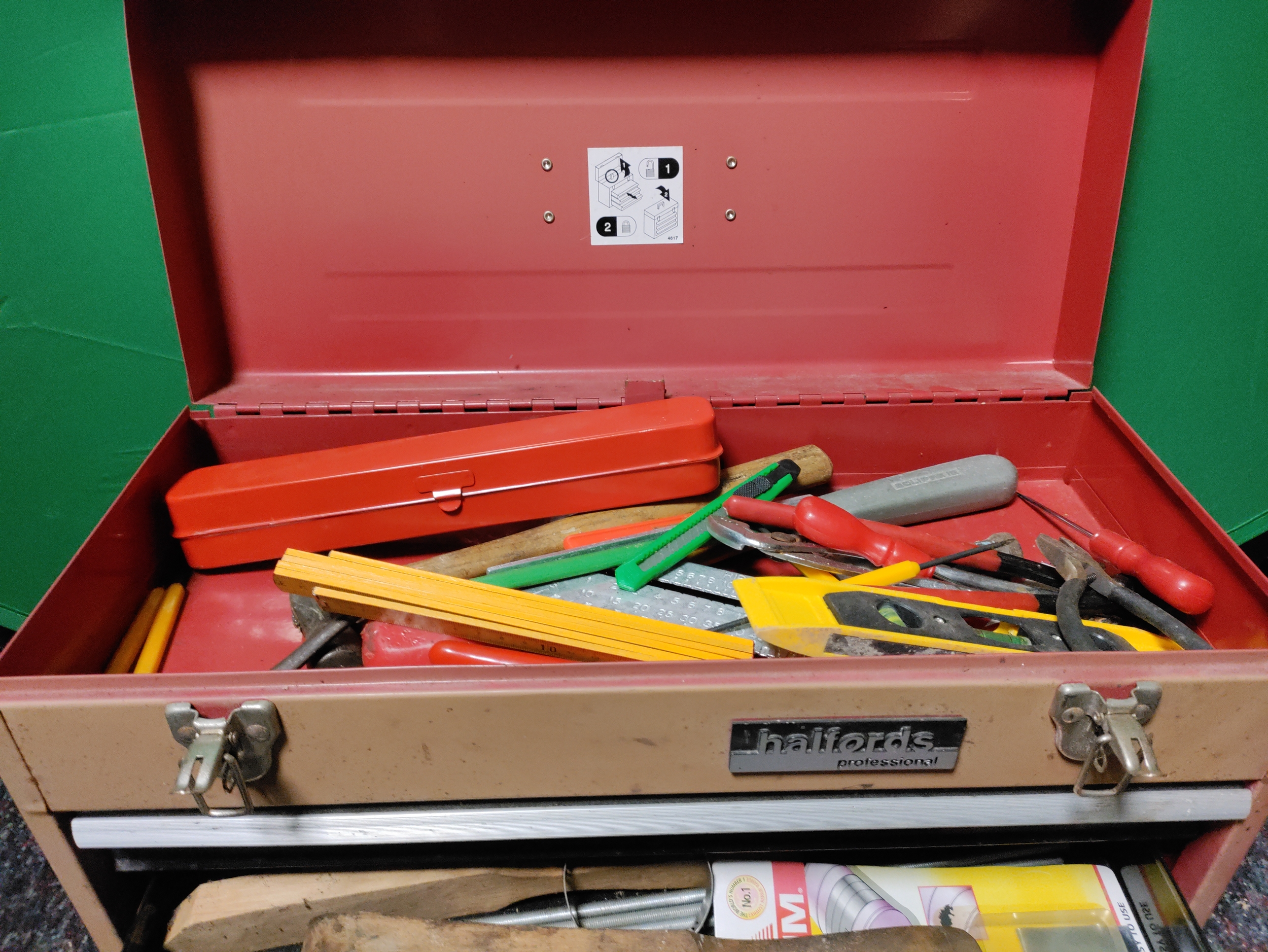 A metal Halfords professional tool box with tools. (H 30 cm x W 51 cm x D 23 cm)