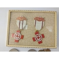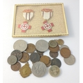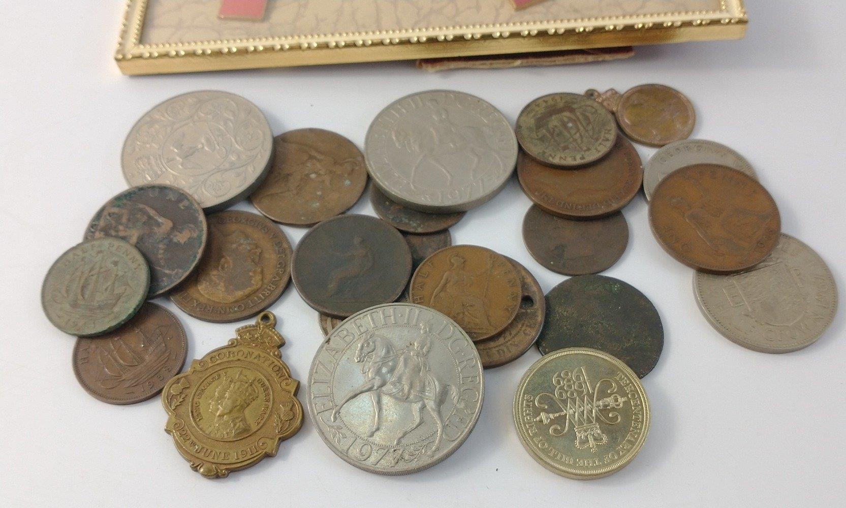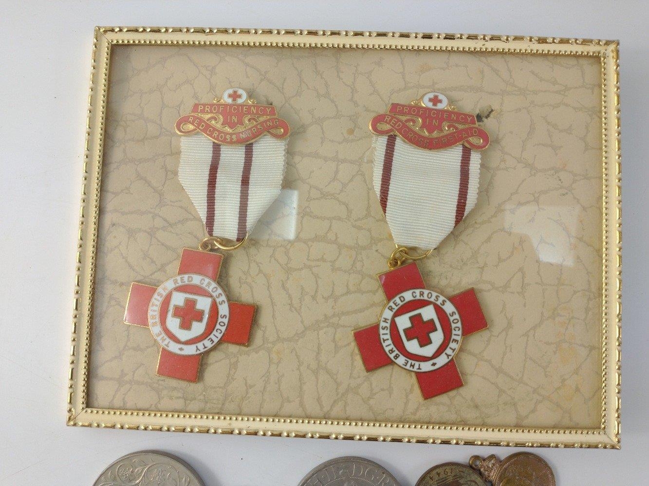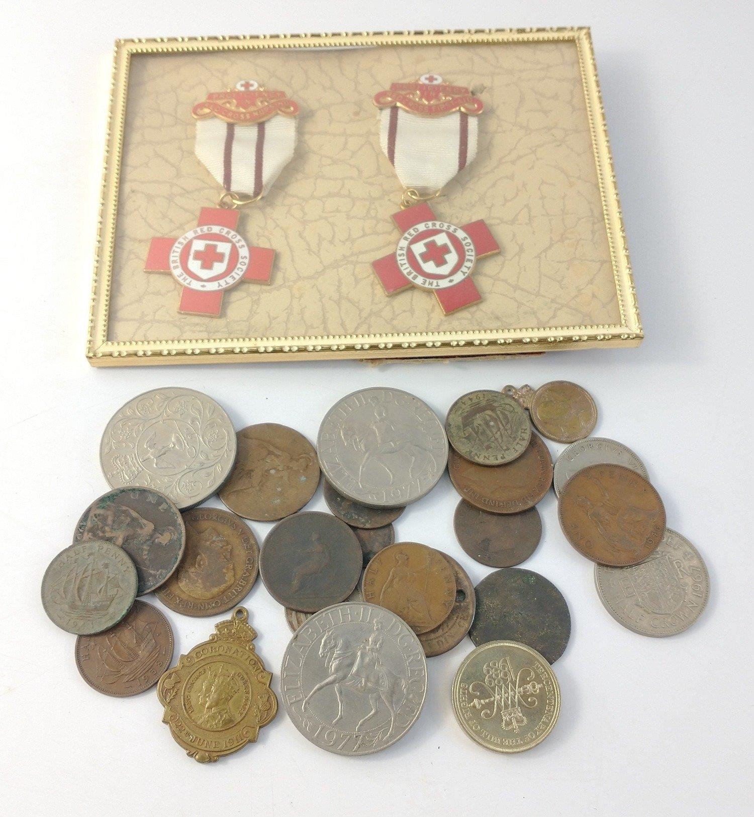 A GEORGE V commemorative medallion with a quantity of old coinage to include Jubilee coins 1977 etc. and a pretty little frame with two Red Cross Nursing Proficiency medals