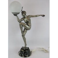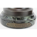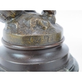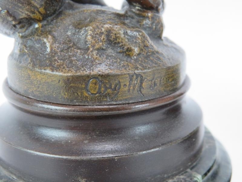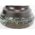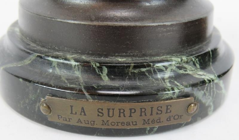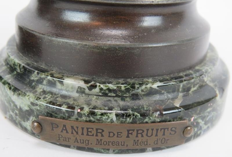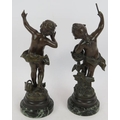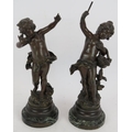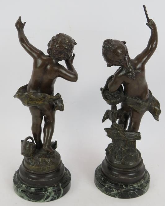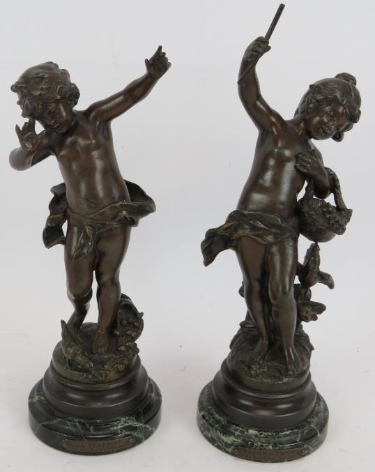 A pair of antique French bronzed figures after Auguste Moreau (1834-1917), Pannier De Fruits' and 'La Surprise'. Mounted on green marble plinths. Height 29cm. (pr).