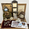 Mixed items including clocks (as found), a picture frame, claret jug etc