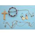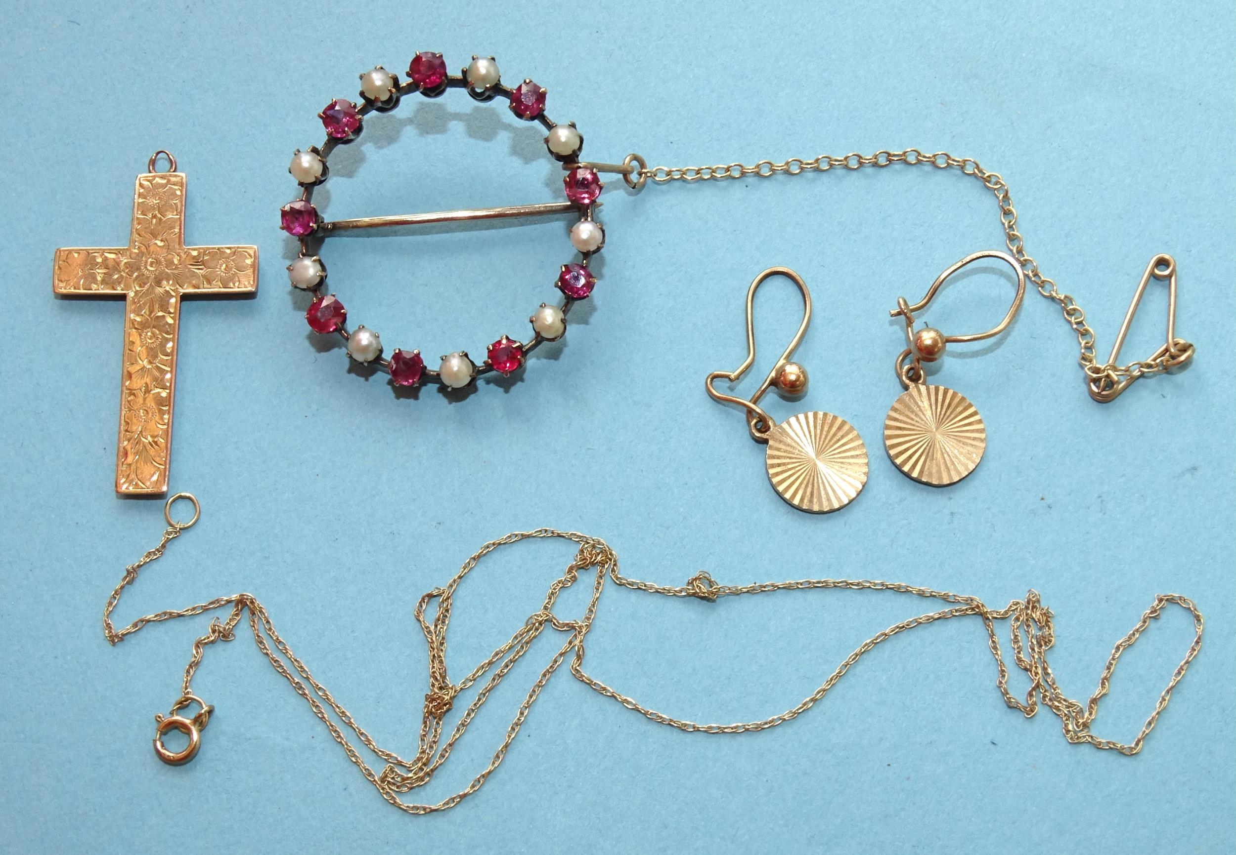 An unmarked wreath brooch set rubies and pearls, 28mm diameter, a 9ct gold cross on chain and a small pair of 9ct gold earrings, gold items 2.8g total weight.
