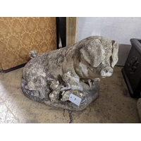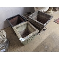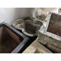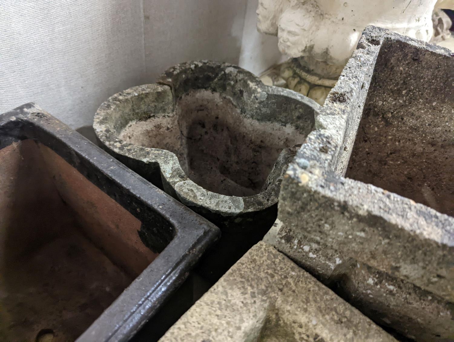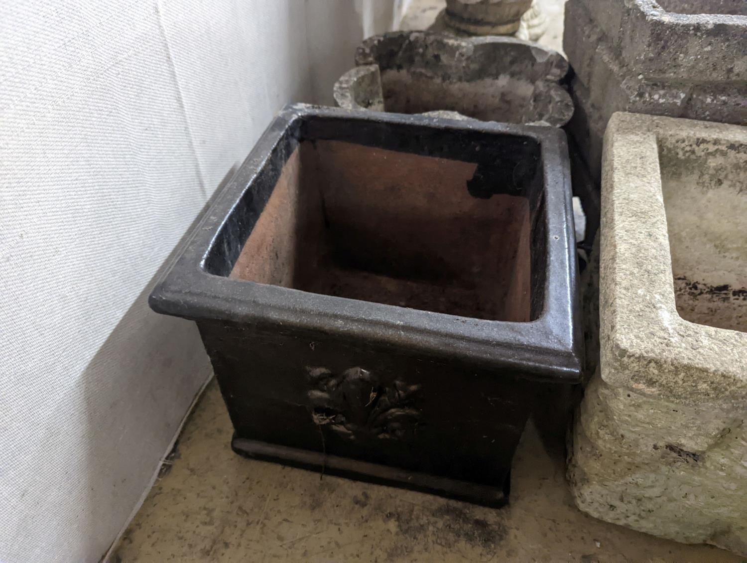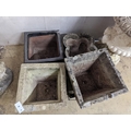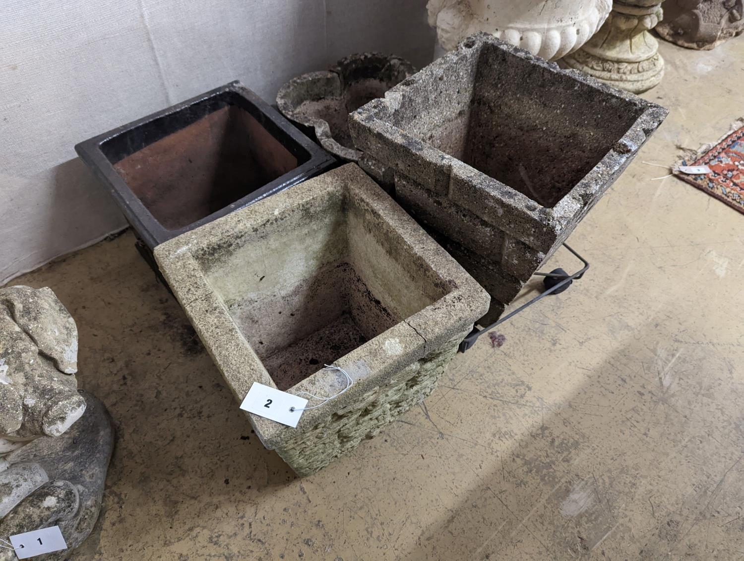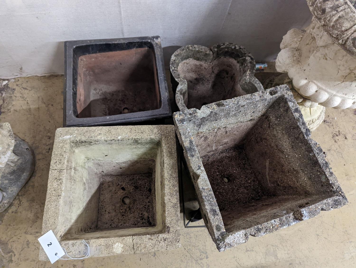 Three reconstituted stone garden planters and a terracotta planter, largest width 36cm, height 35cm