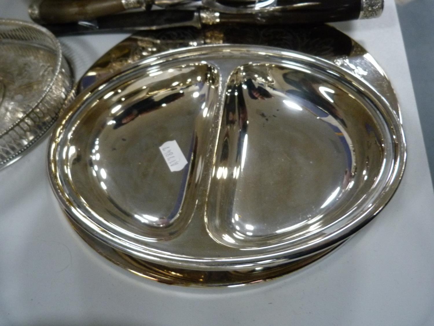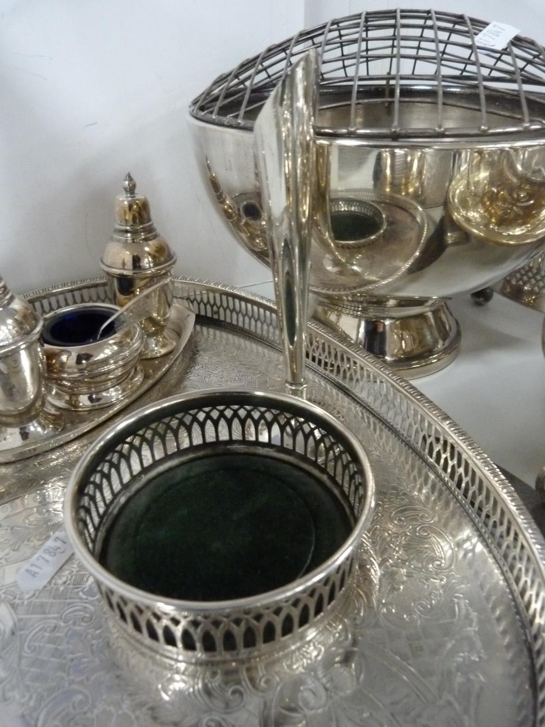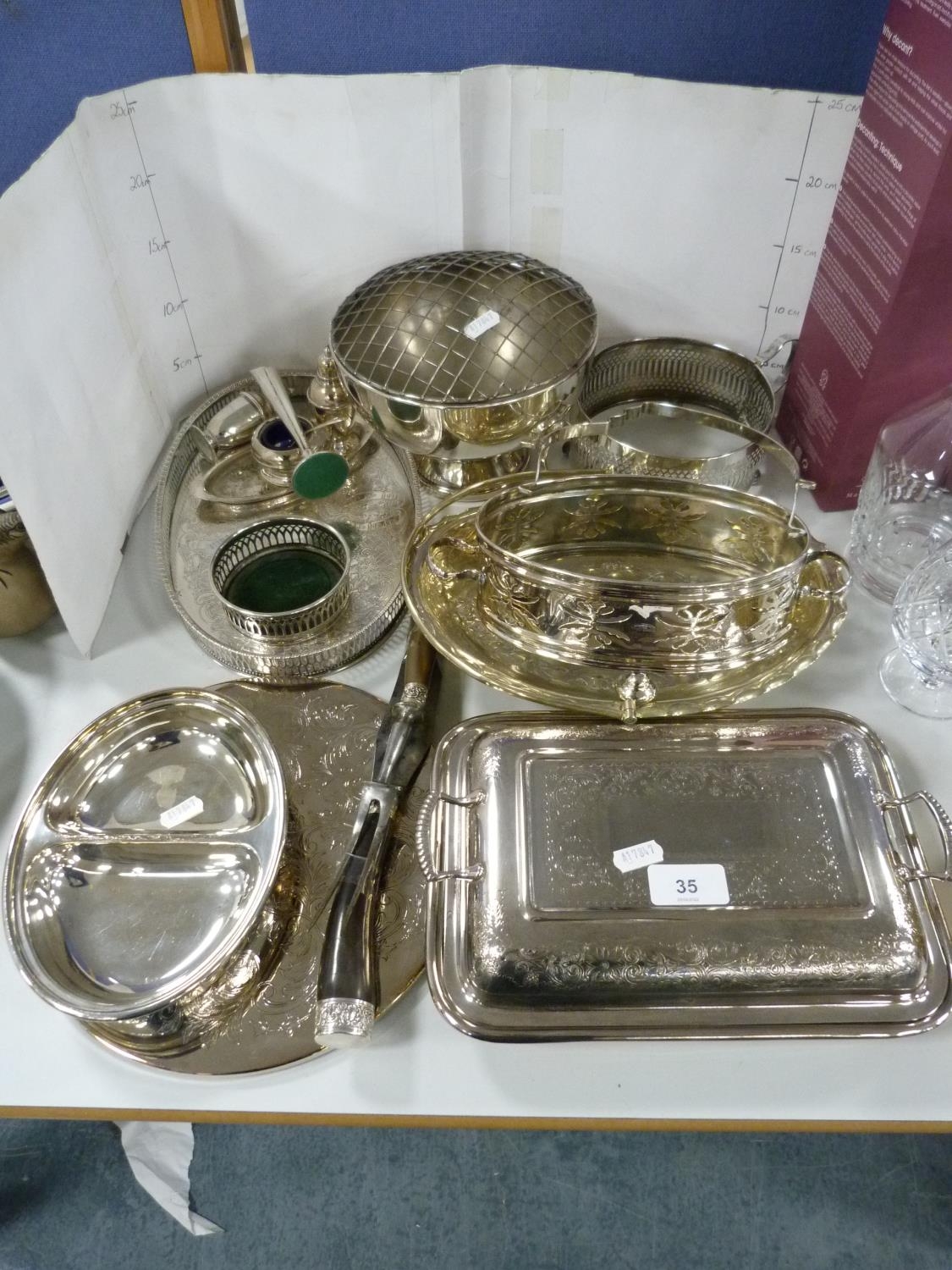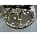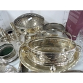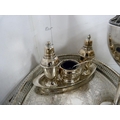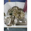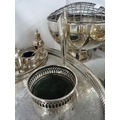 Collection of EP to include entrée dish and cover, cake basket, dish rings, rose bowl with spreader, stand, carving implements, condiments, tray etc.