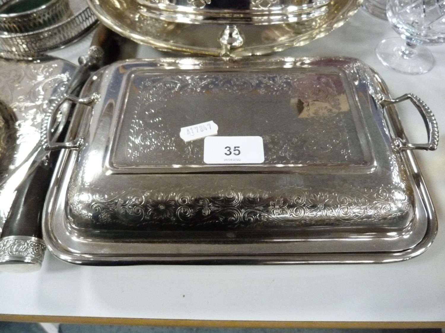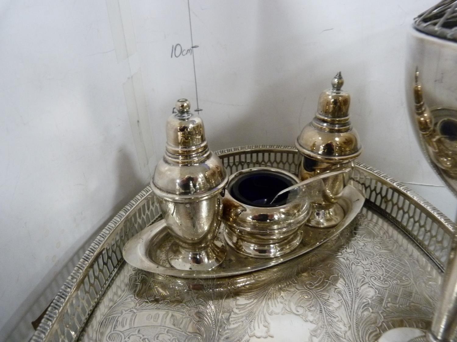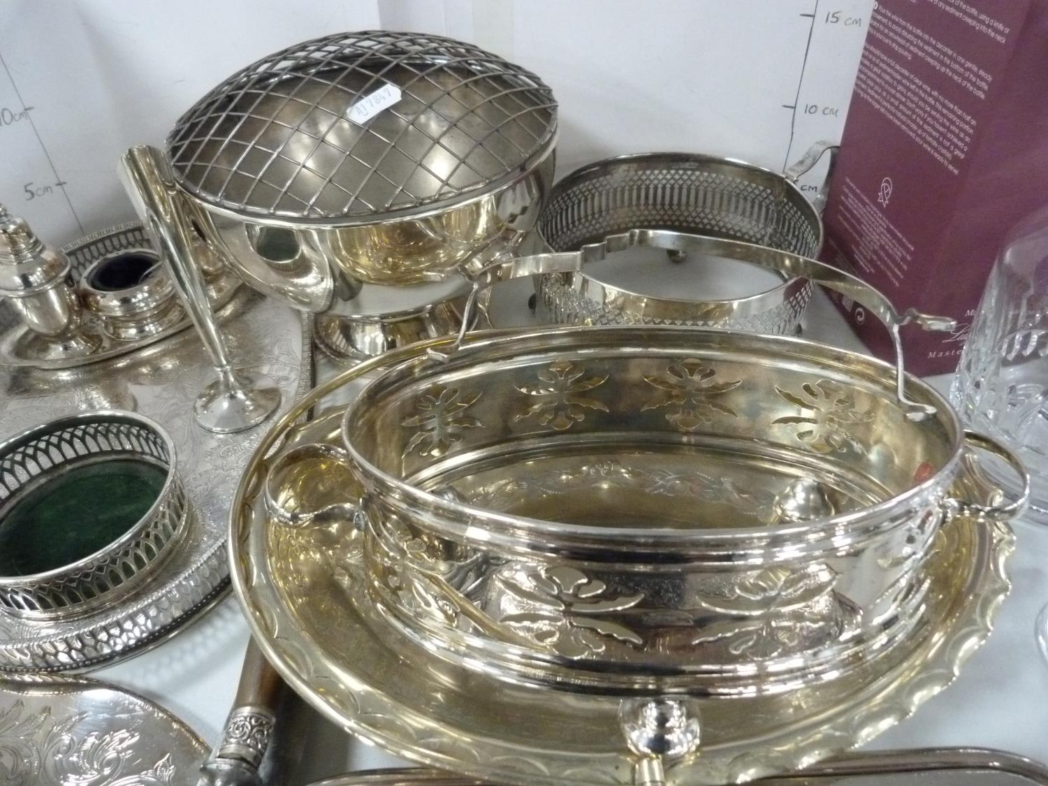 Collection of EP to include entrée dish and cover, cake basket, dish rings, rose bowl with spreader, stand, carving implements, condiments, tray etc.