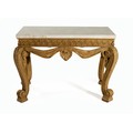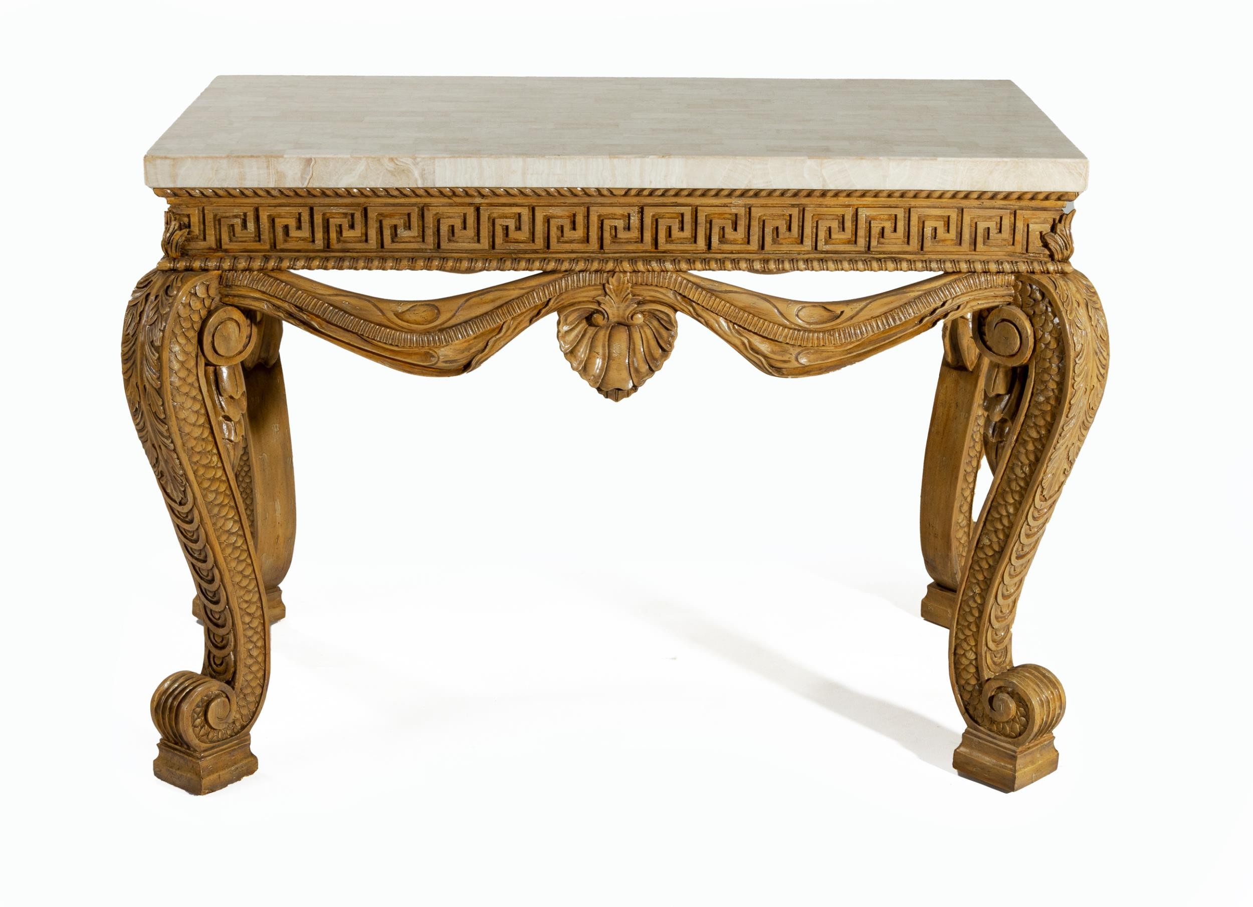 The rectangular marble top above a Greek key lock carved frieze and ribbon and shell-carved apron, on leaf-carved cabriole legs, on scroll and block feet