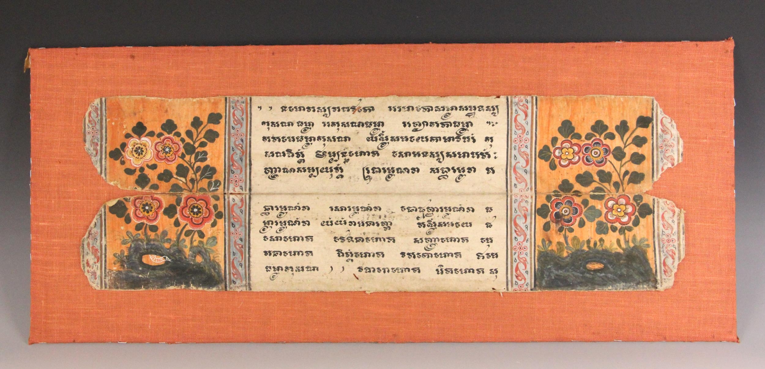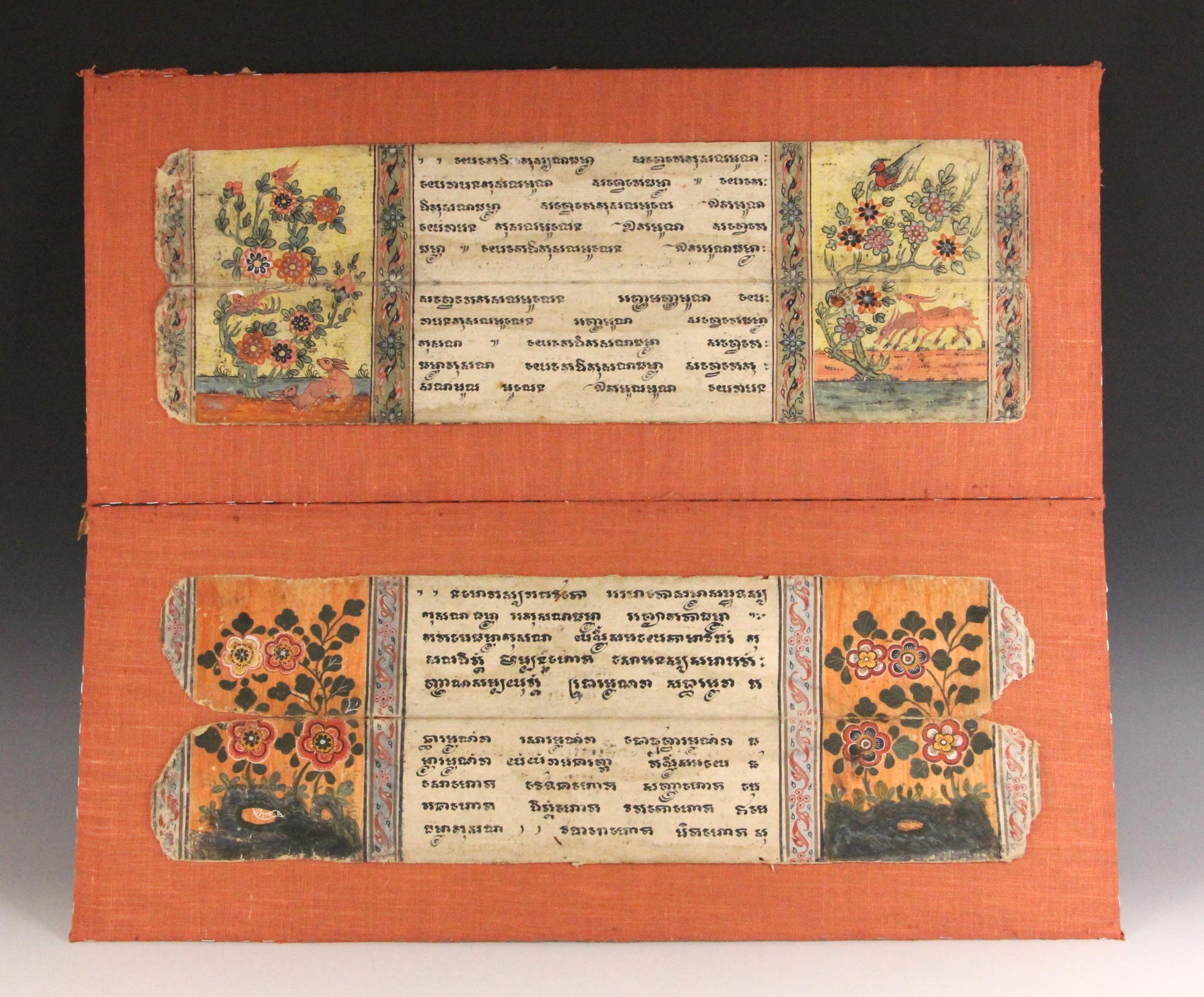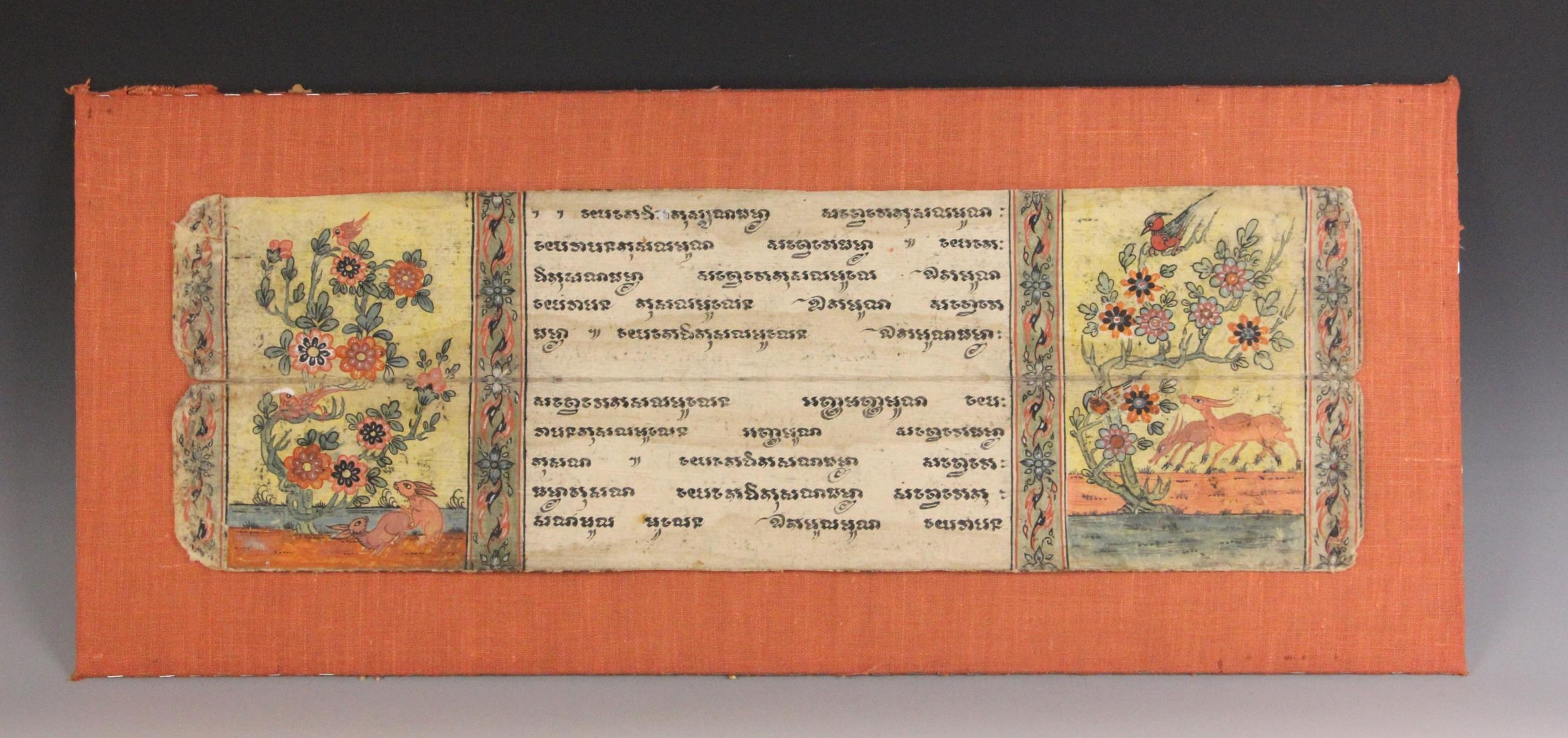 Two South East Asian illustrated manuscript fragments, 19th century, each mounted on board, 30cm x 71.5cm overall (2)