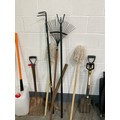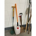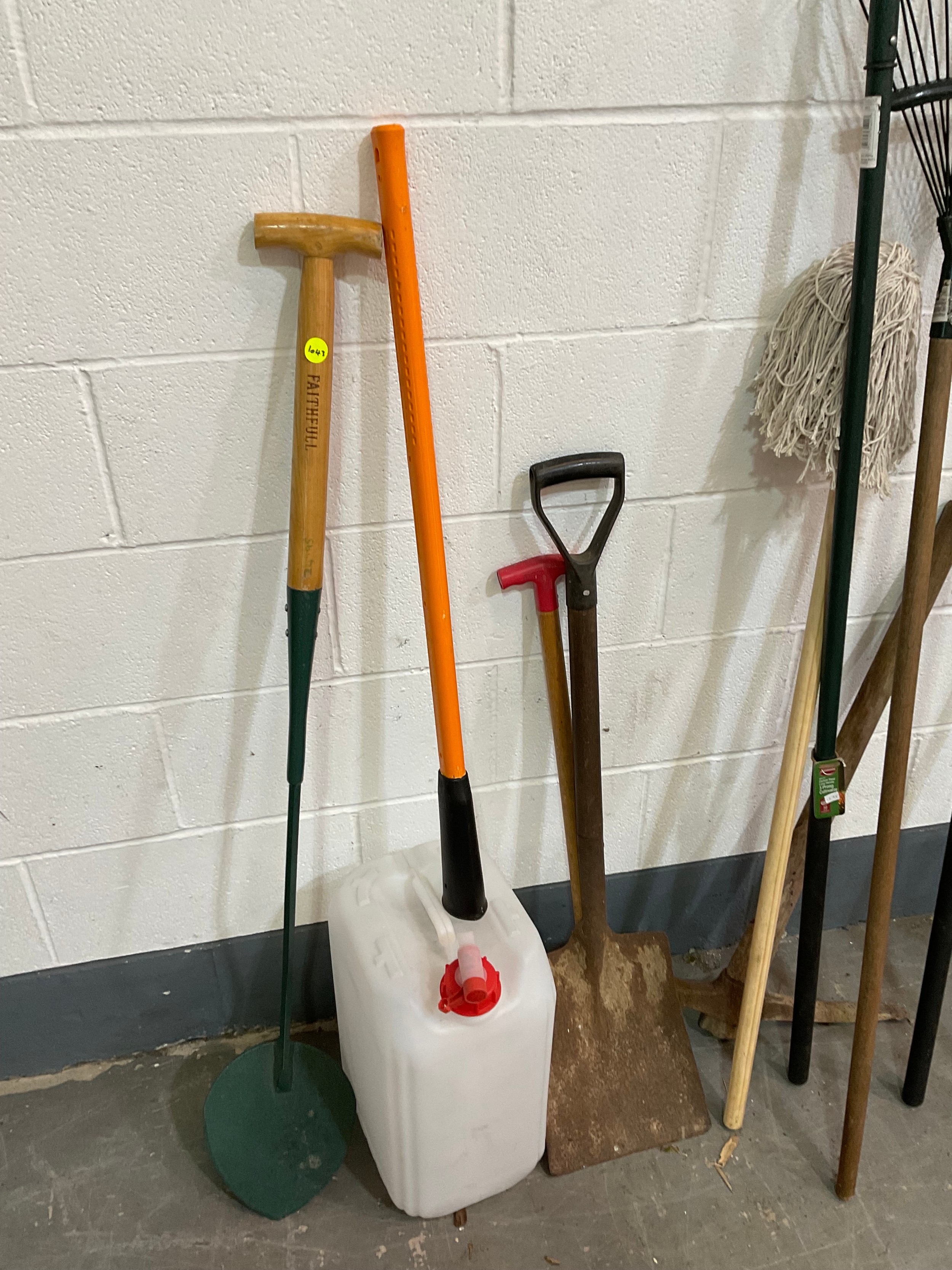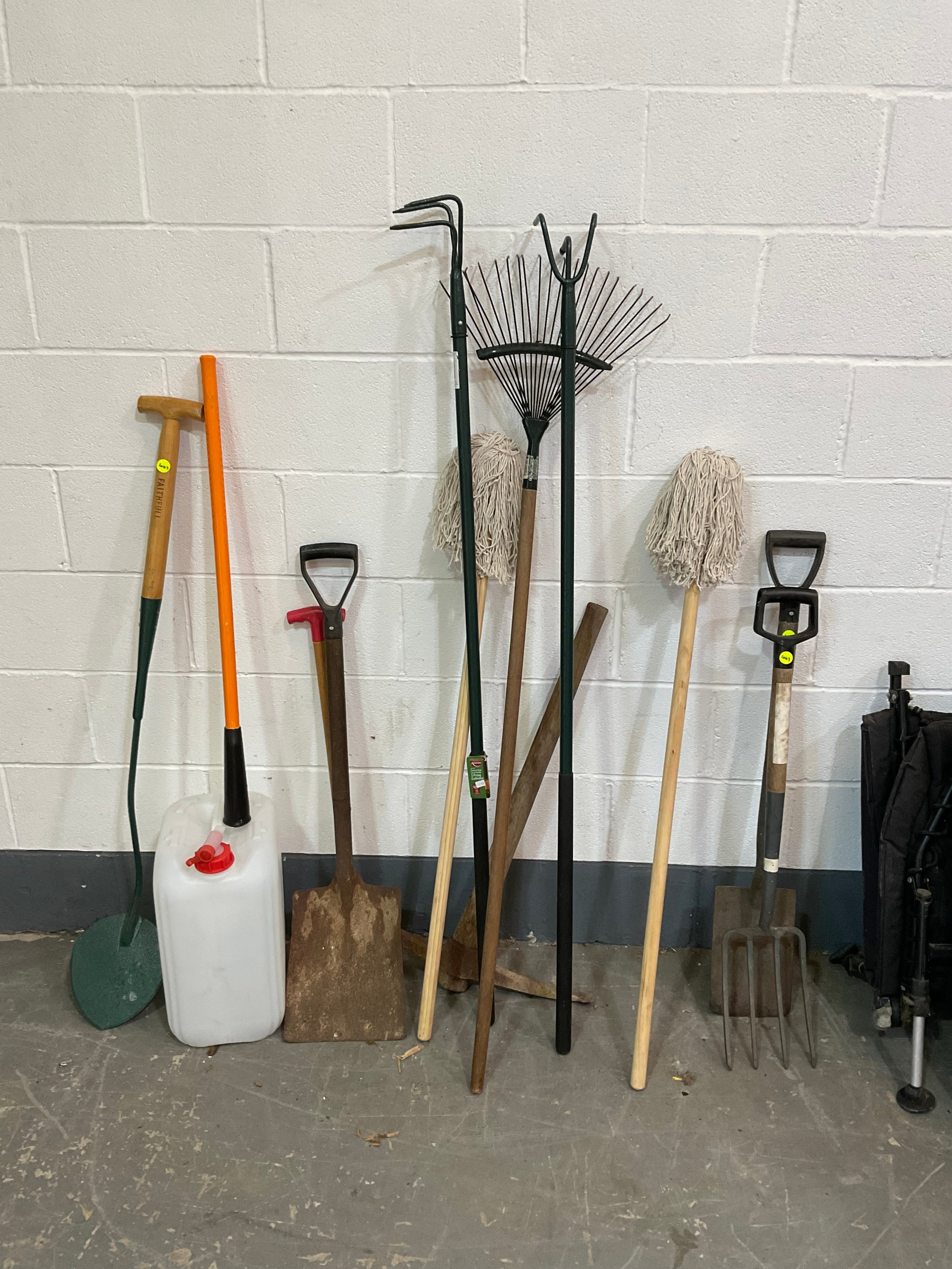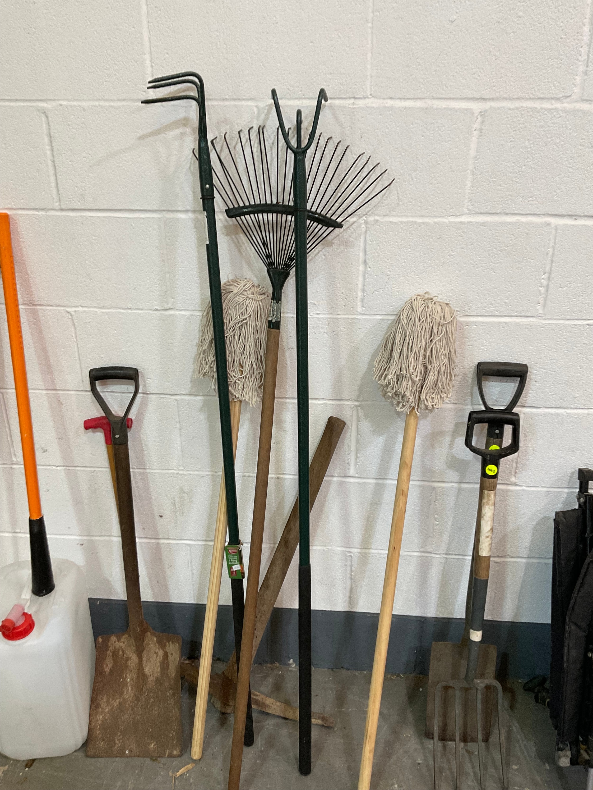 QTY OF GARDEN TOOLS -FORK,SHOVEL,RAKE ETC