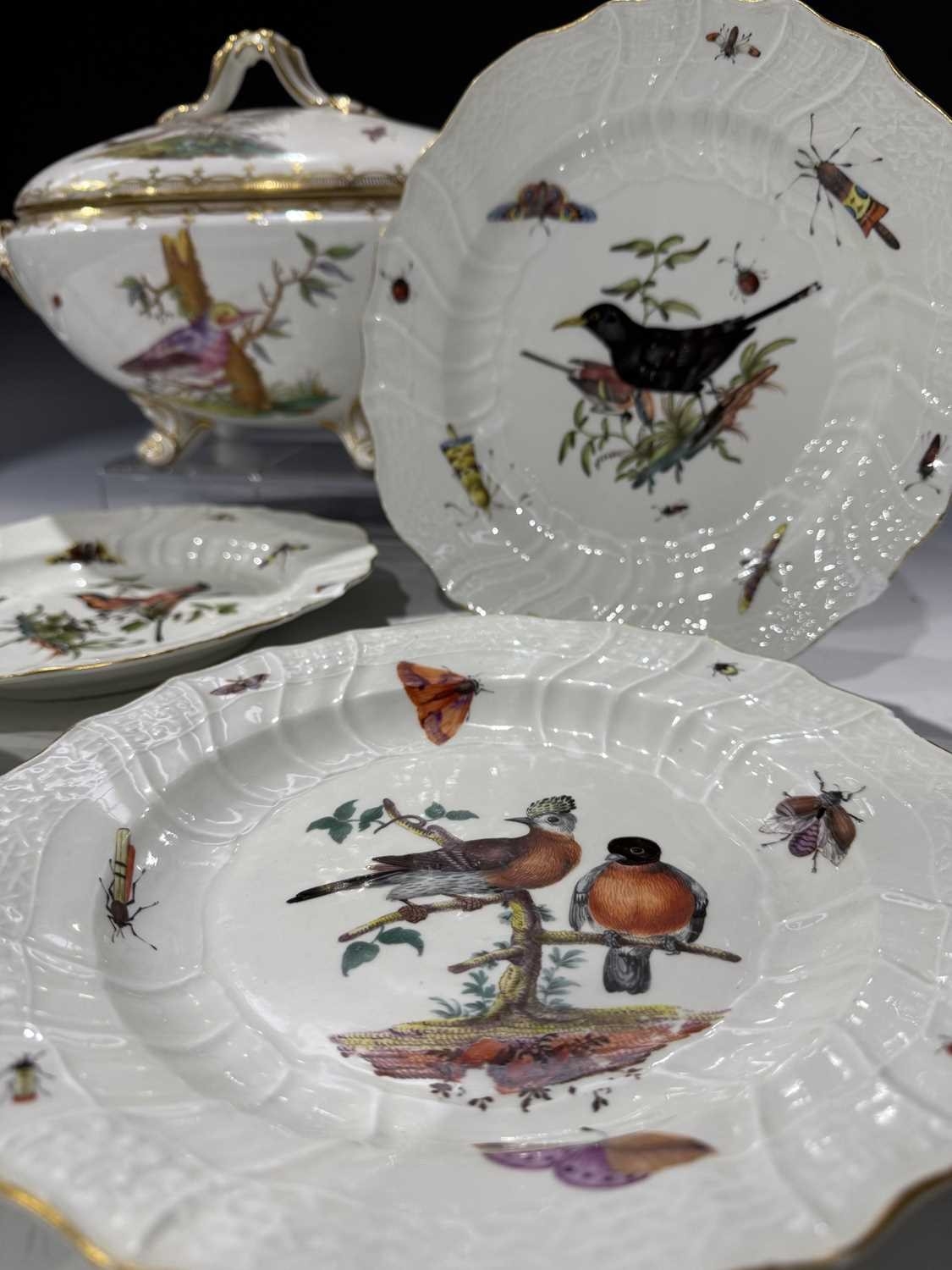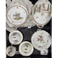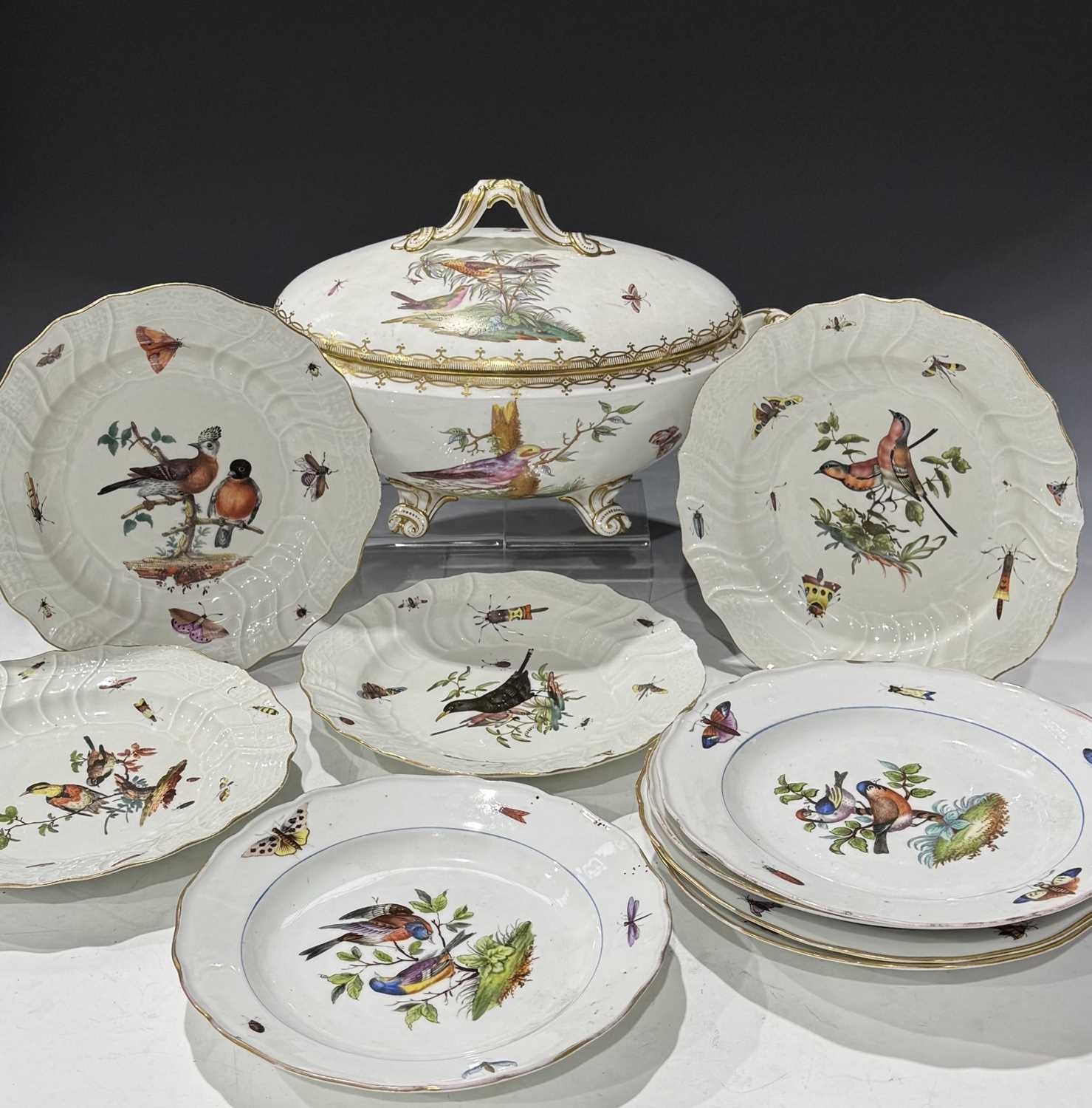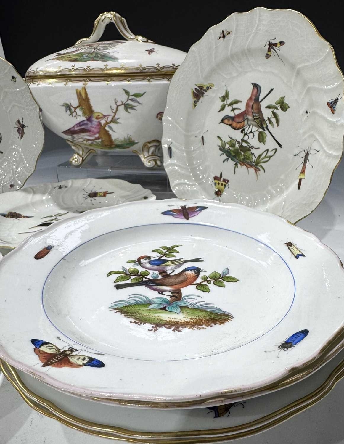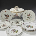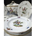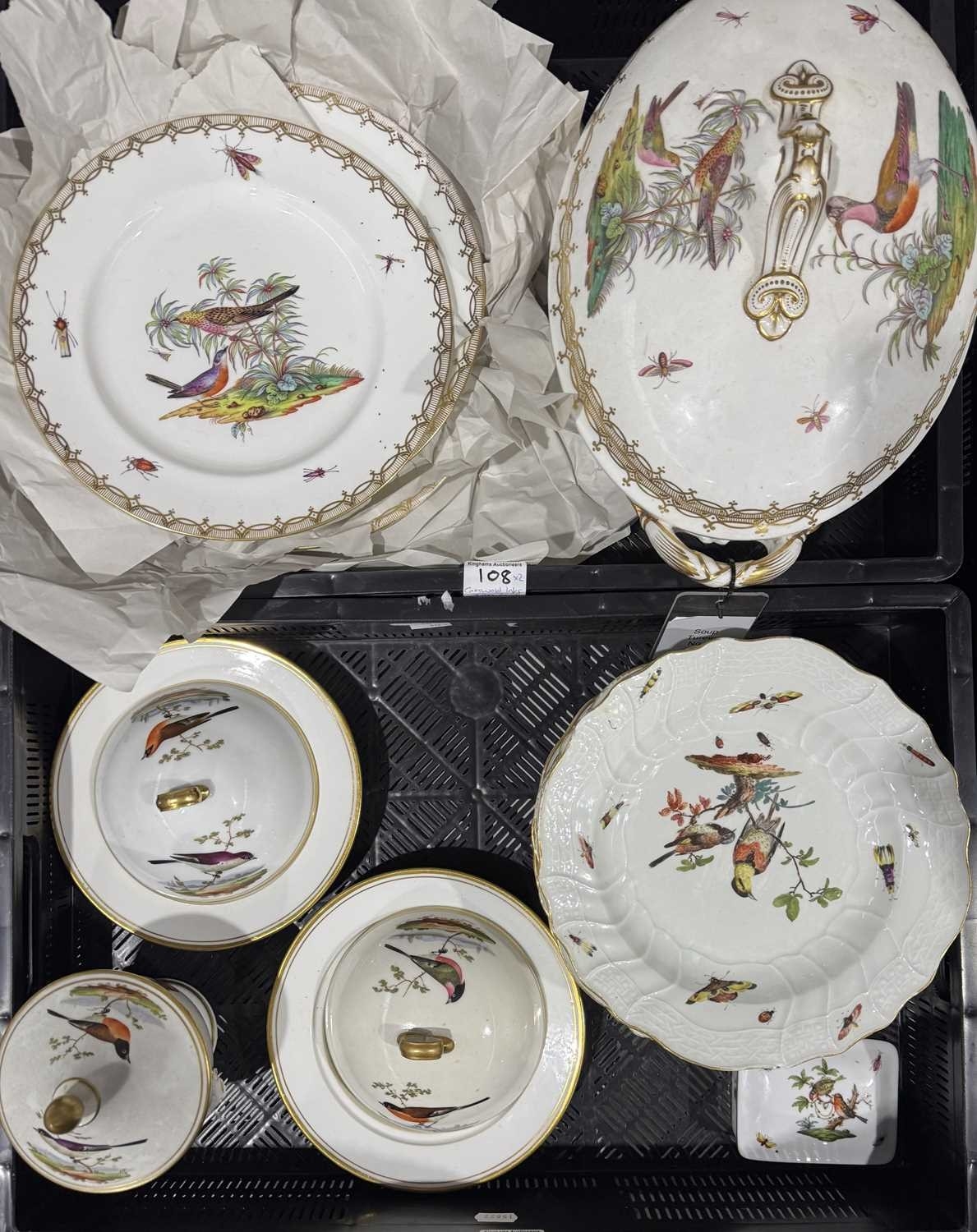 A matched set of Meissen dinner plates, each painted with ornithological studies, insects and butterflies, crossed blue sword marks to the underside, together with a collection of painted and printed porcelain in a similar manner; a Herend lidded box, a lidded pot, lidded muffin dishes, dinner plates, tureen (2 trays)