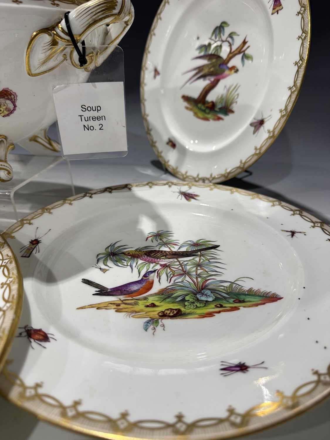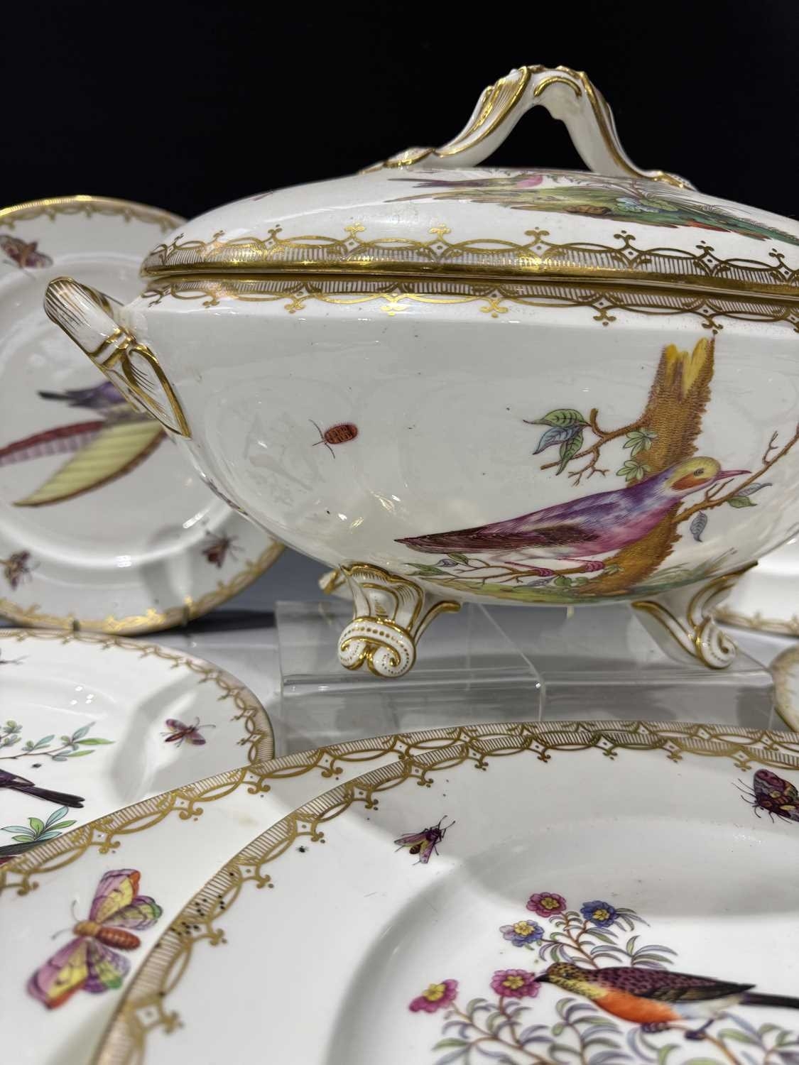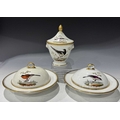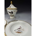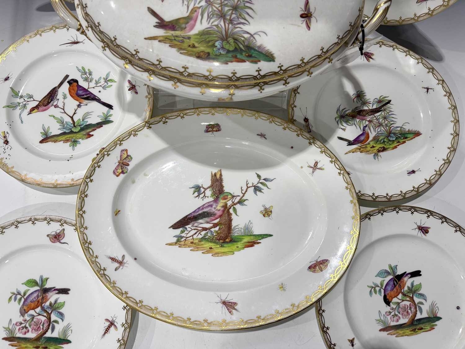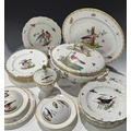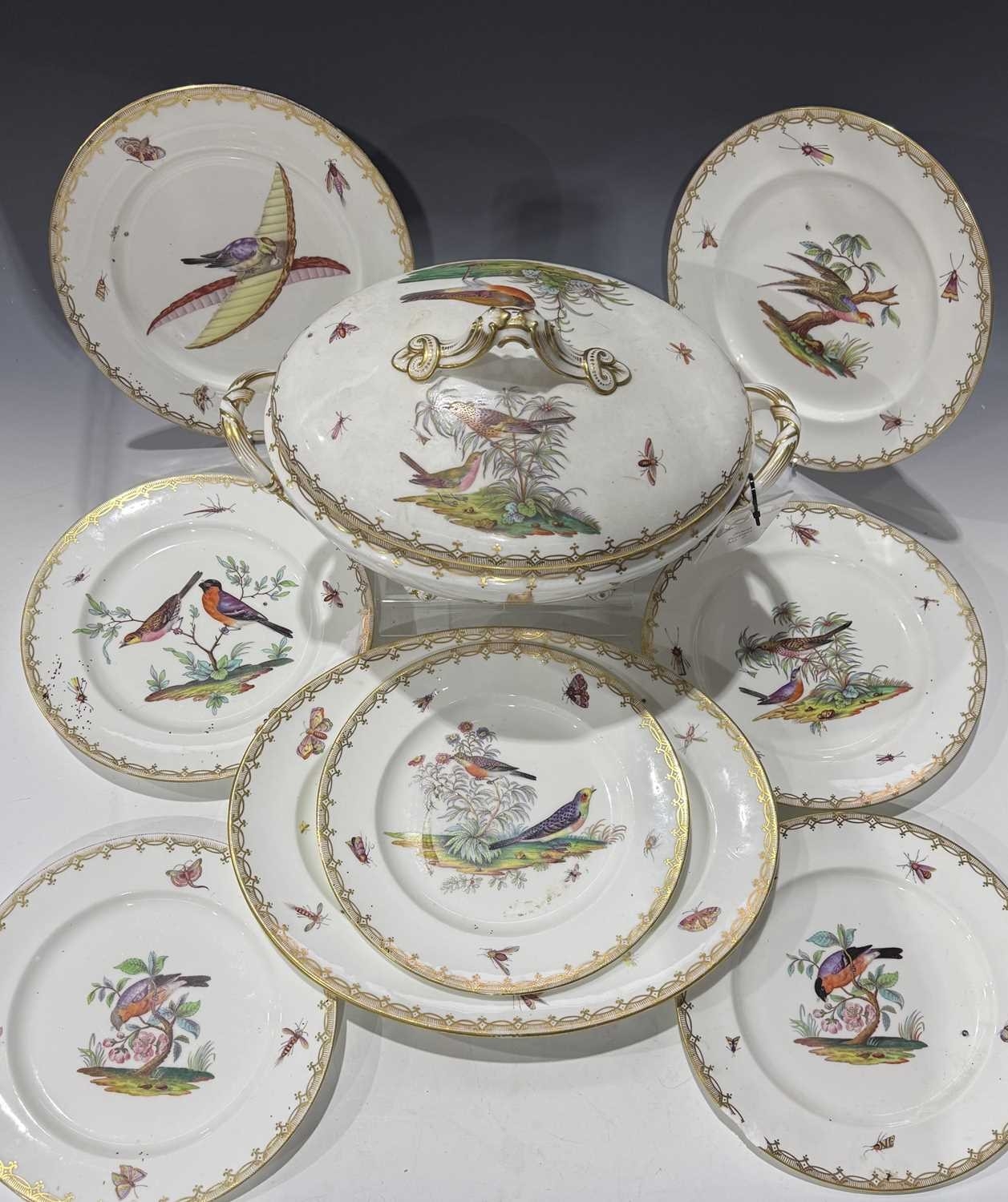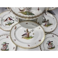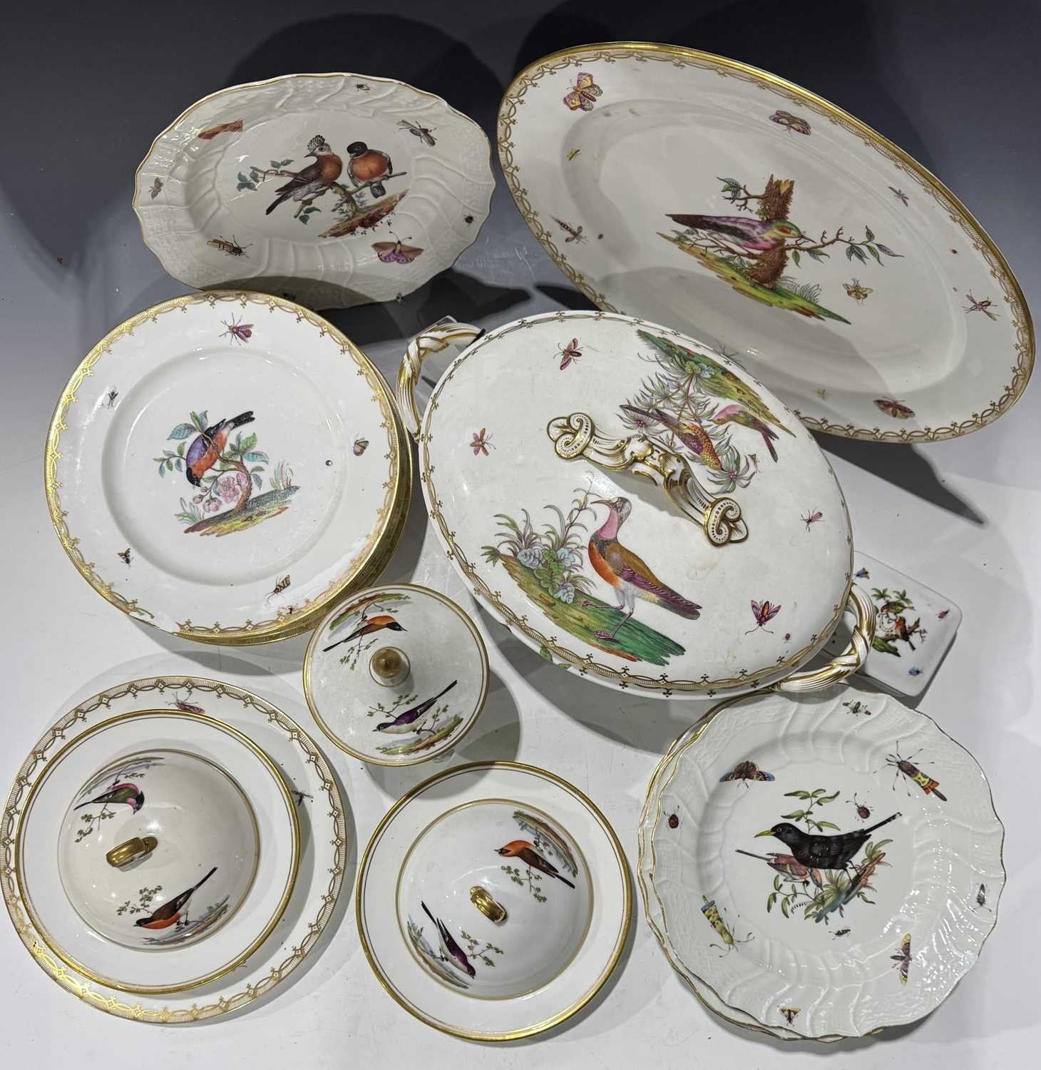 A matched set of Meissen dinner plates, each painted with ornithological studies, insects and butterflies, crossed blue sword marks to the underside, together with a collection of painted and printed porcelain in a similar manner; a Herend lidded box, a lidded pot, lidded muffin dishes, dinner plates, tureen (2 trays)