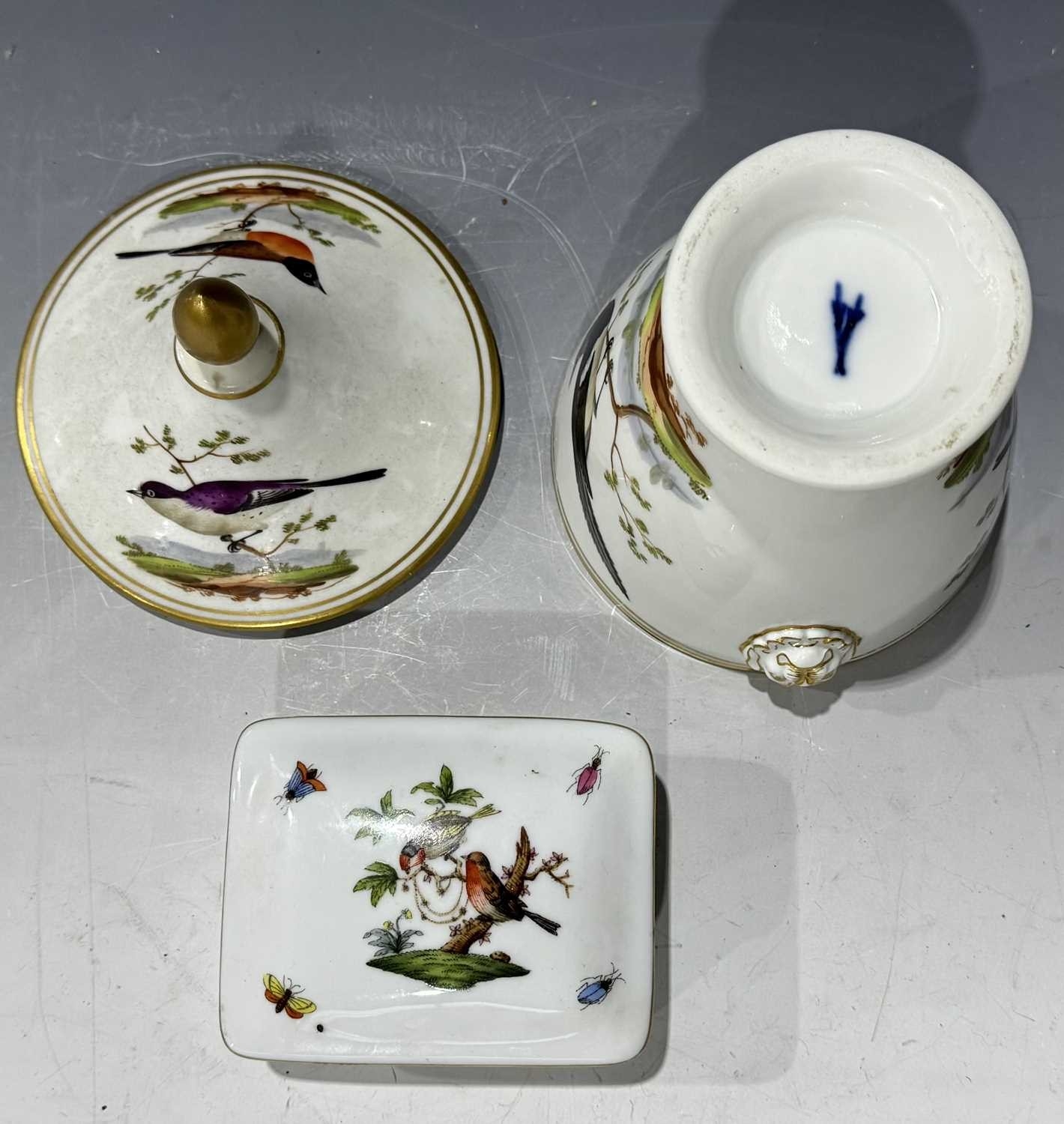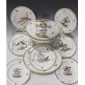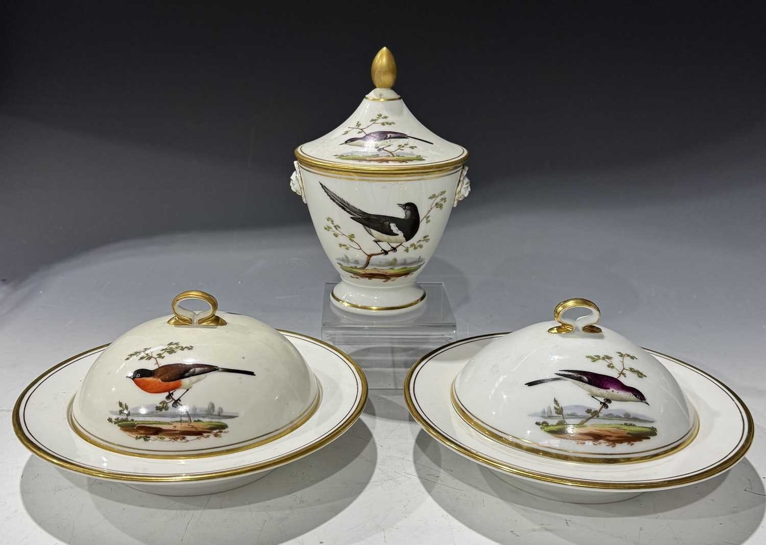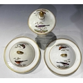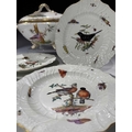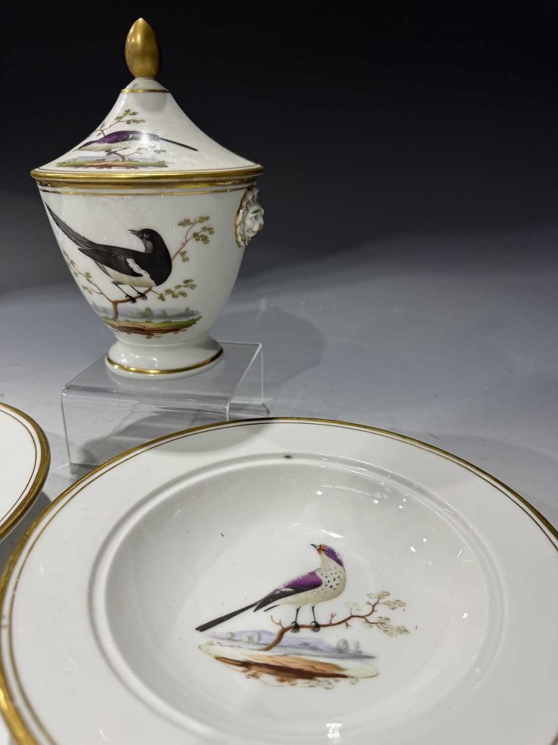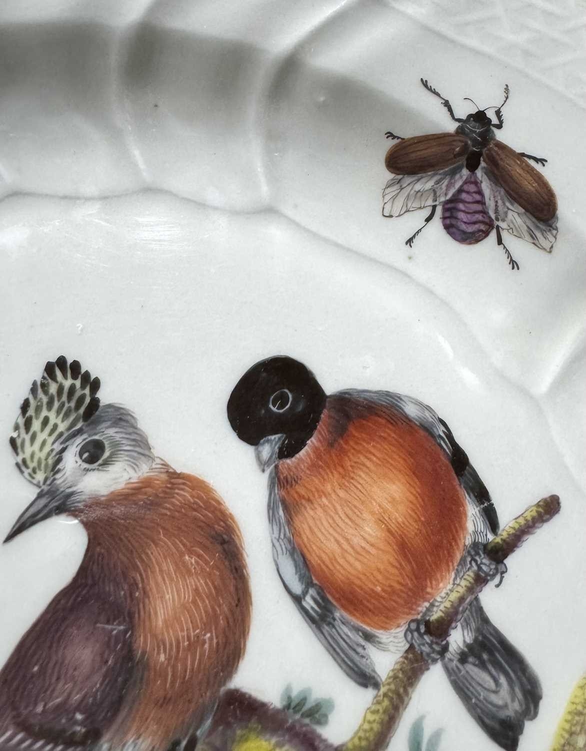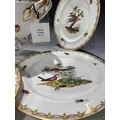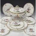A matched set of Meissen dinner plates, each painted with ornithological studies, insects and butterflies, crossed blue sword marks to the underside, together with a collection of painted and printed porcelain in a similar manner; a Herend lidded box, a lidded pot, lidded muffin dishes, dinner plates, tureen (2 trays)