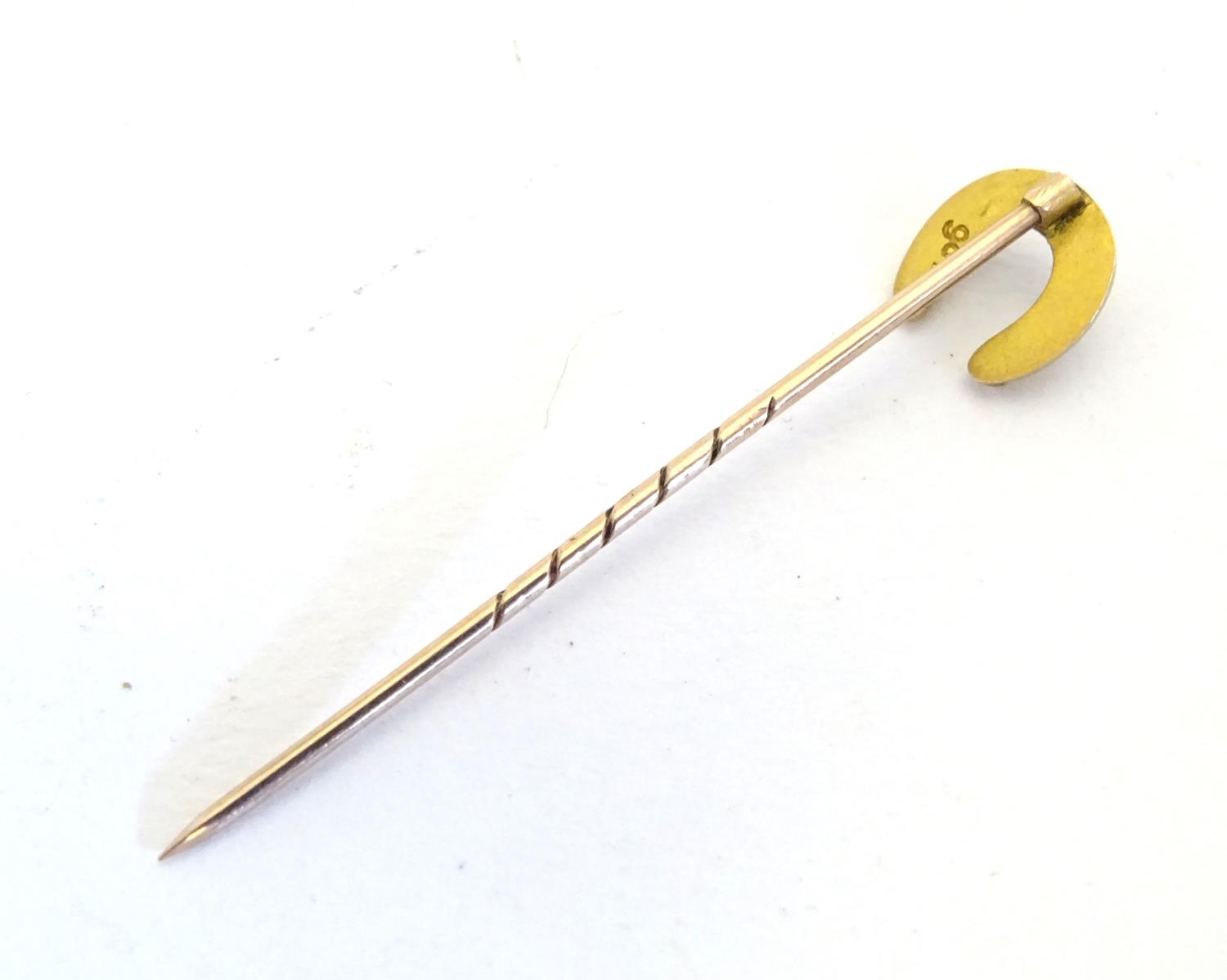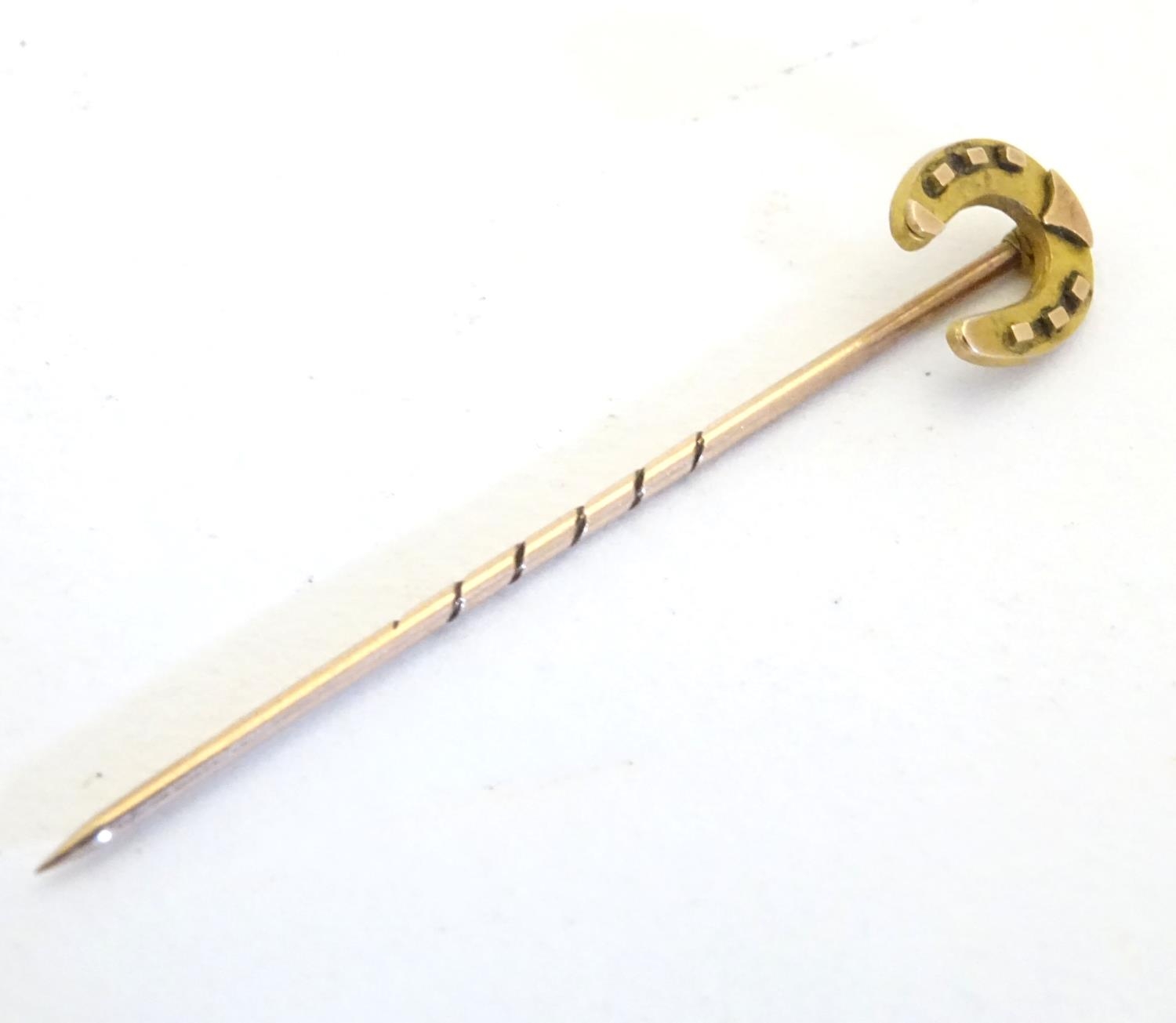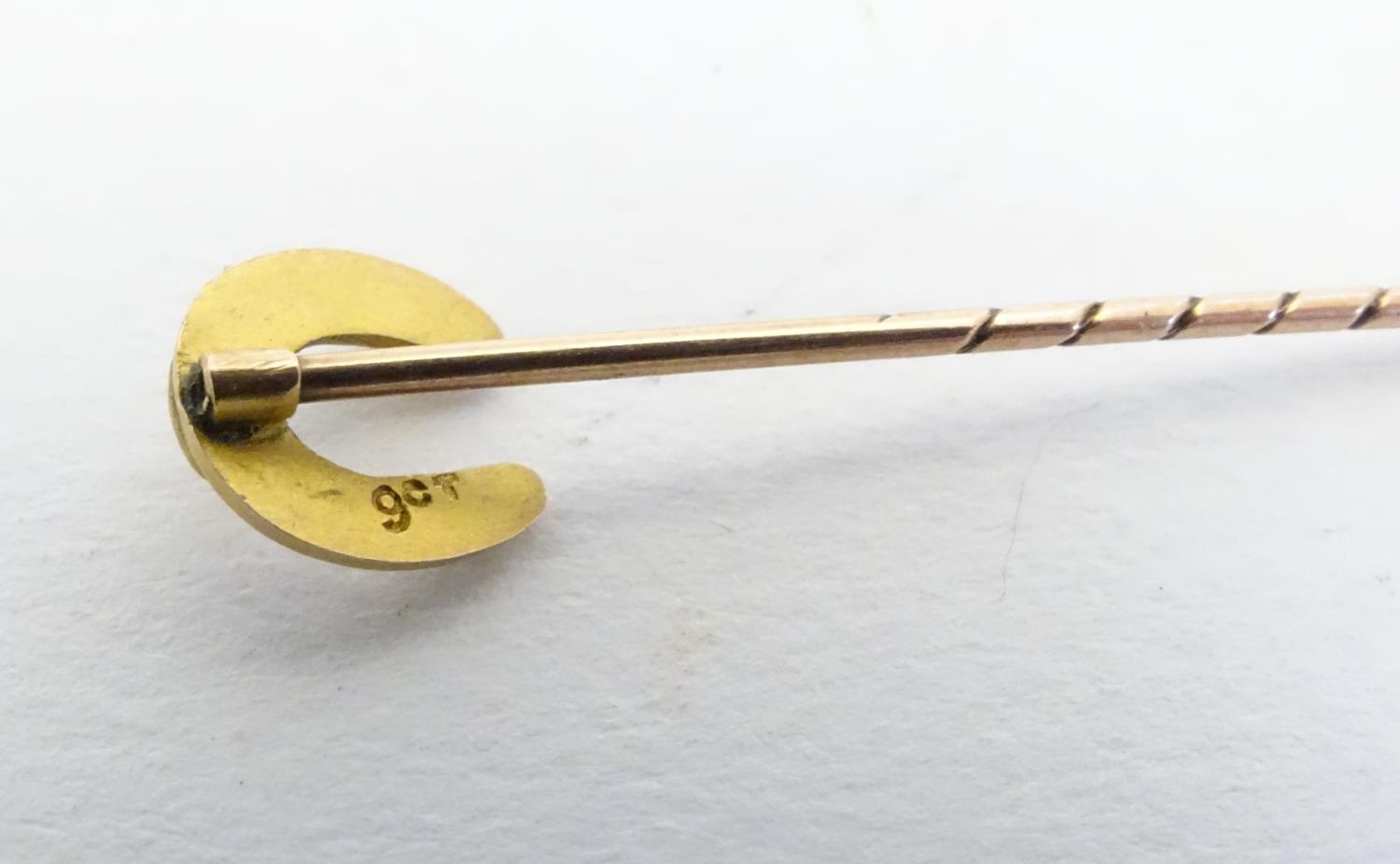 A 9ct gold stick pin with horseshoe decoration to top 1 1/2"...