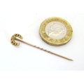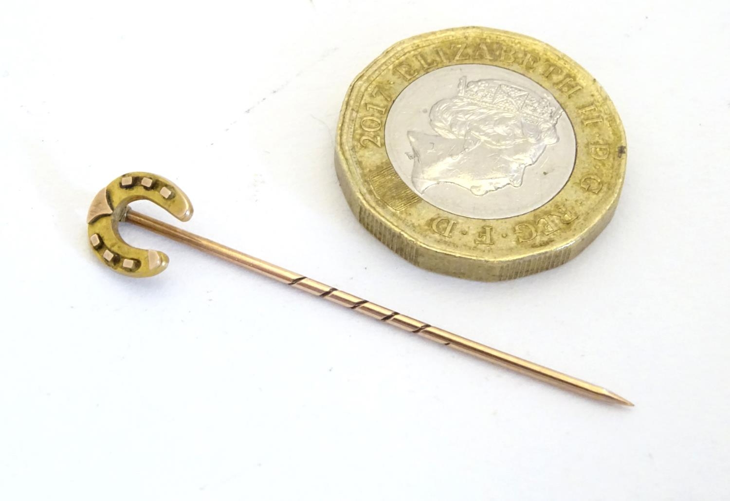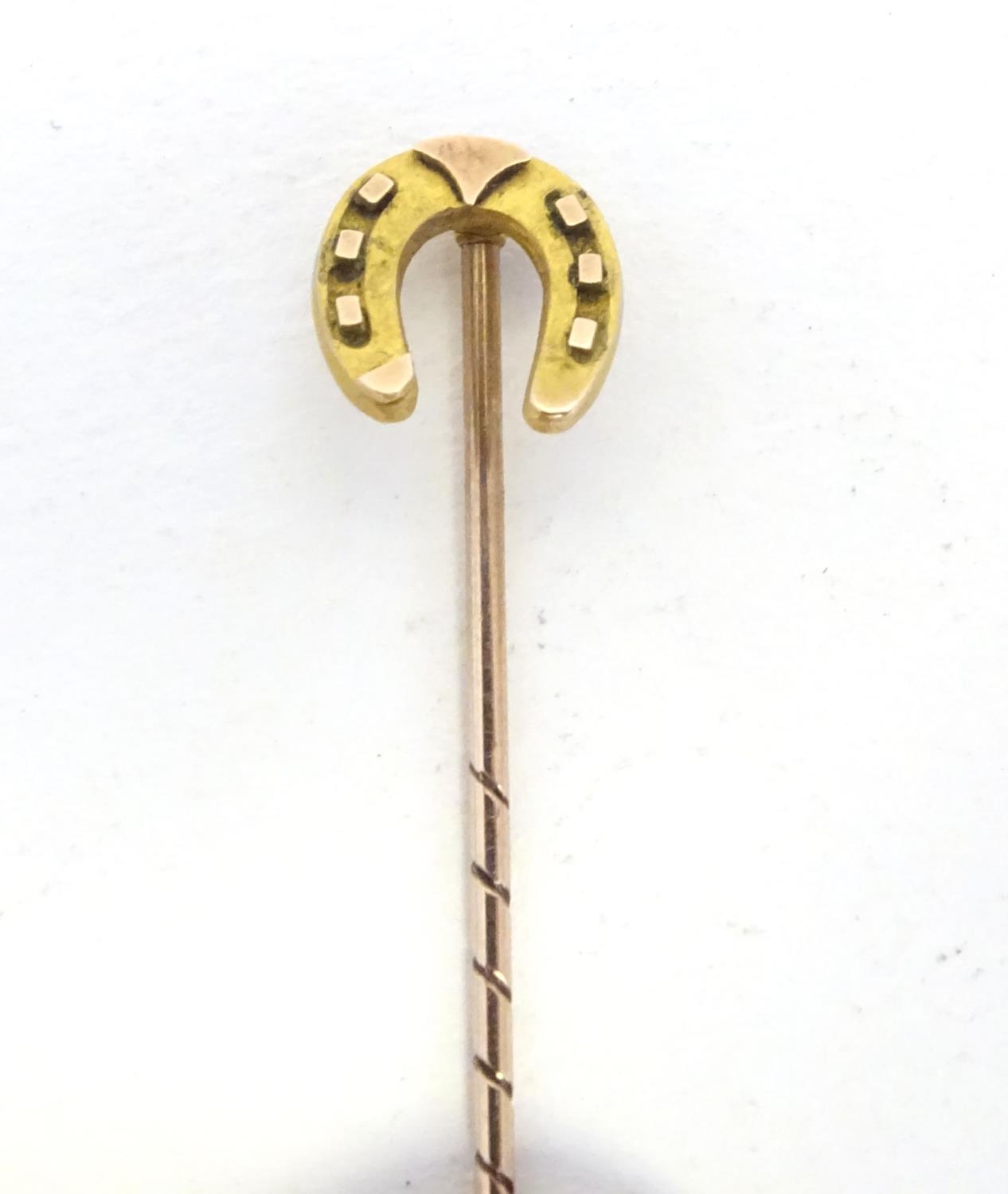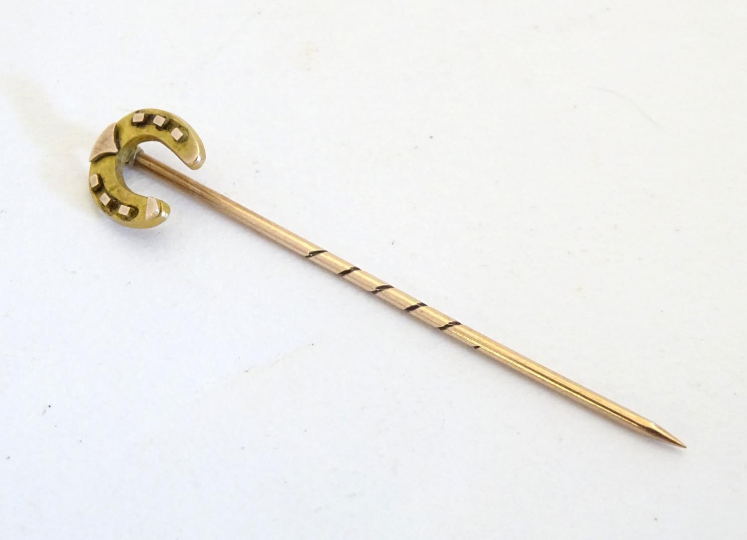 A 9ct gold stick pin with horseshoe decoration to top 1 1/2"...