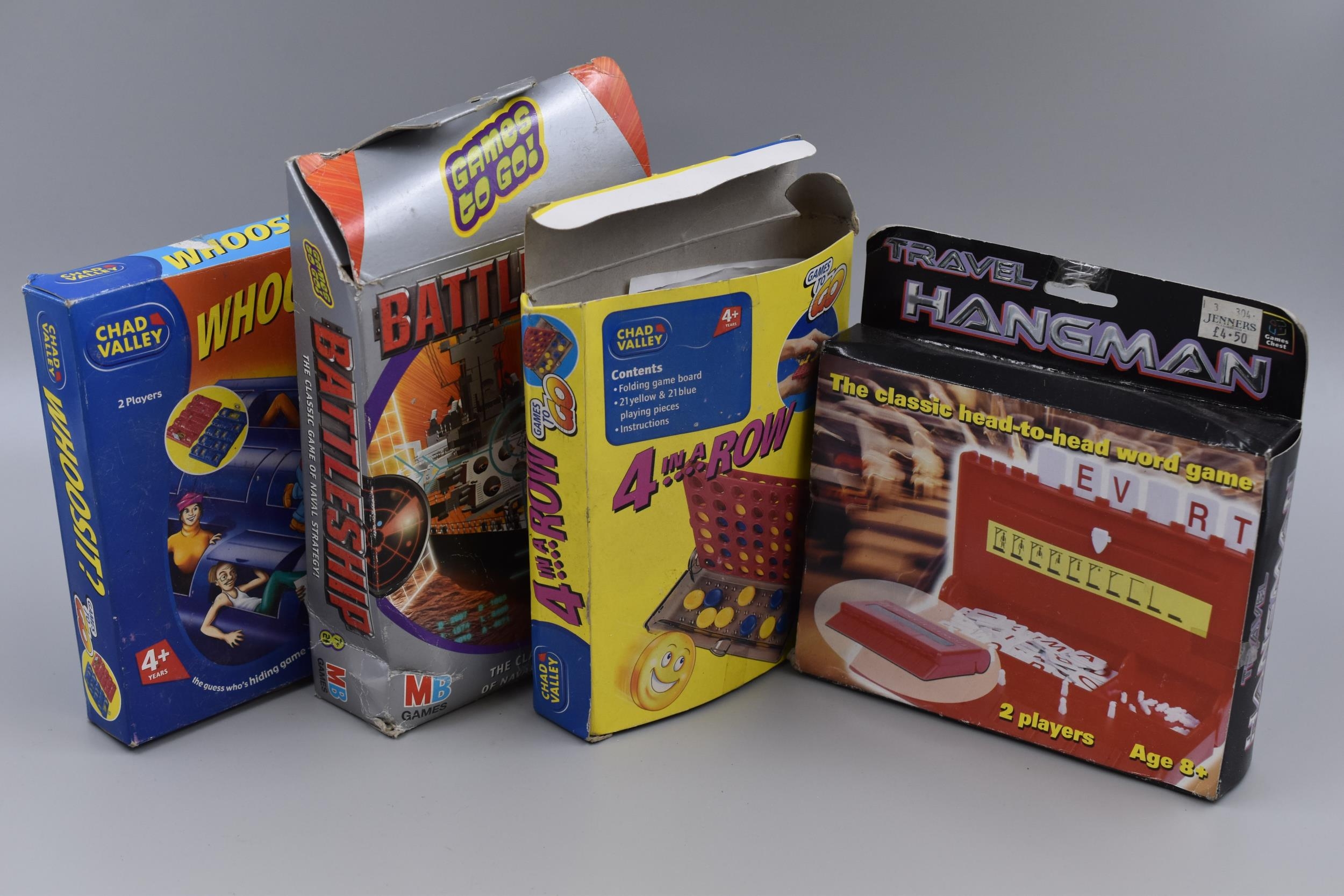Collection of Vintage Boxed Travel Gamesto include MB Games Battleship, Whoosit, Hangman, and Chad Valley 4 In A Row