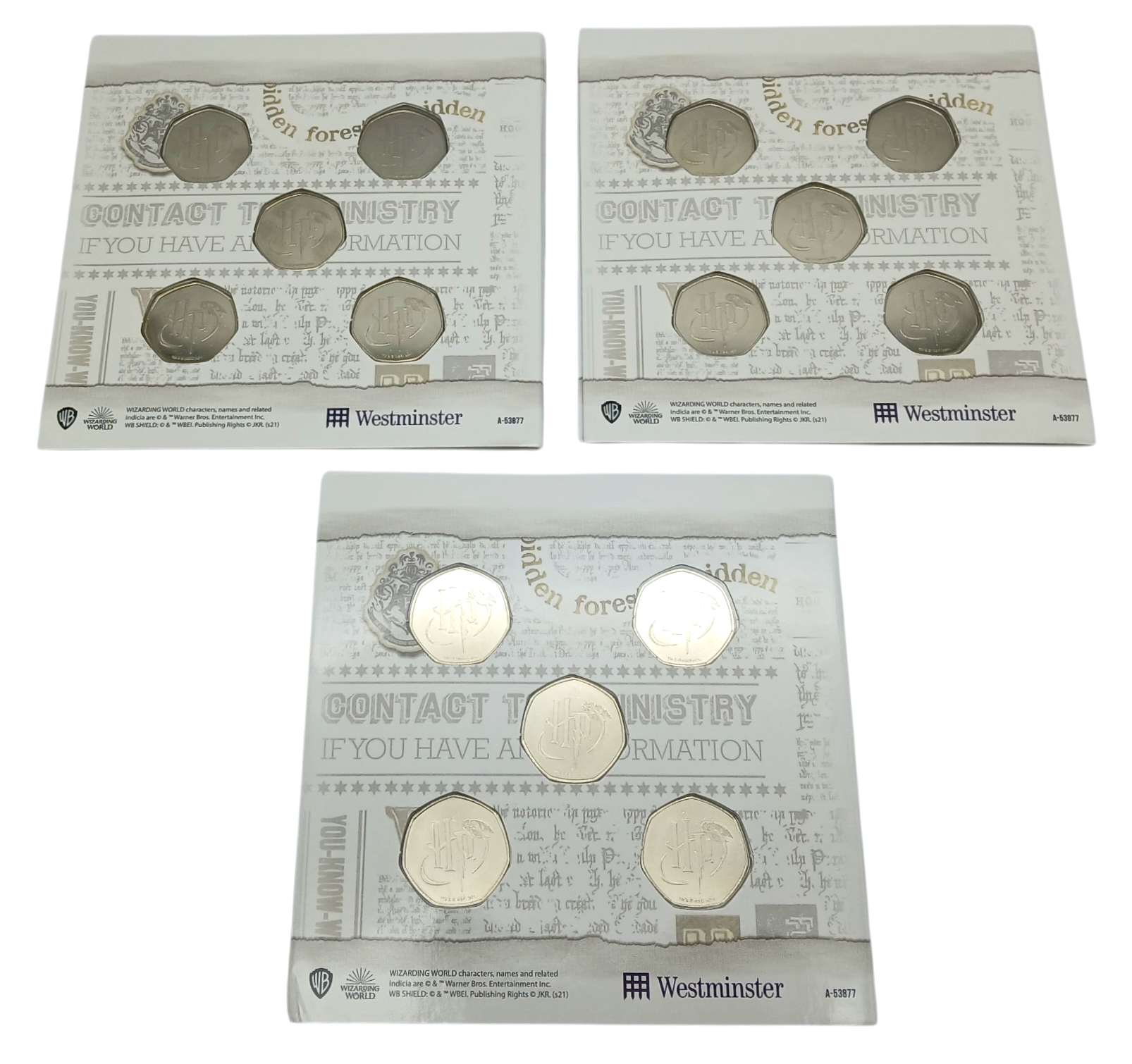 Three Westminster Mint Harry Potter Collectible 50p Coin Sets. Fifteen coins in total. Sealed in original packaging.