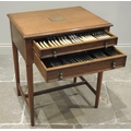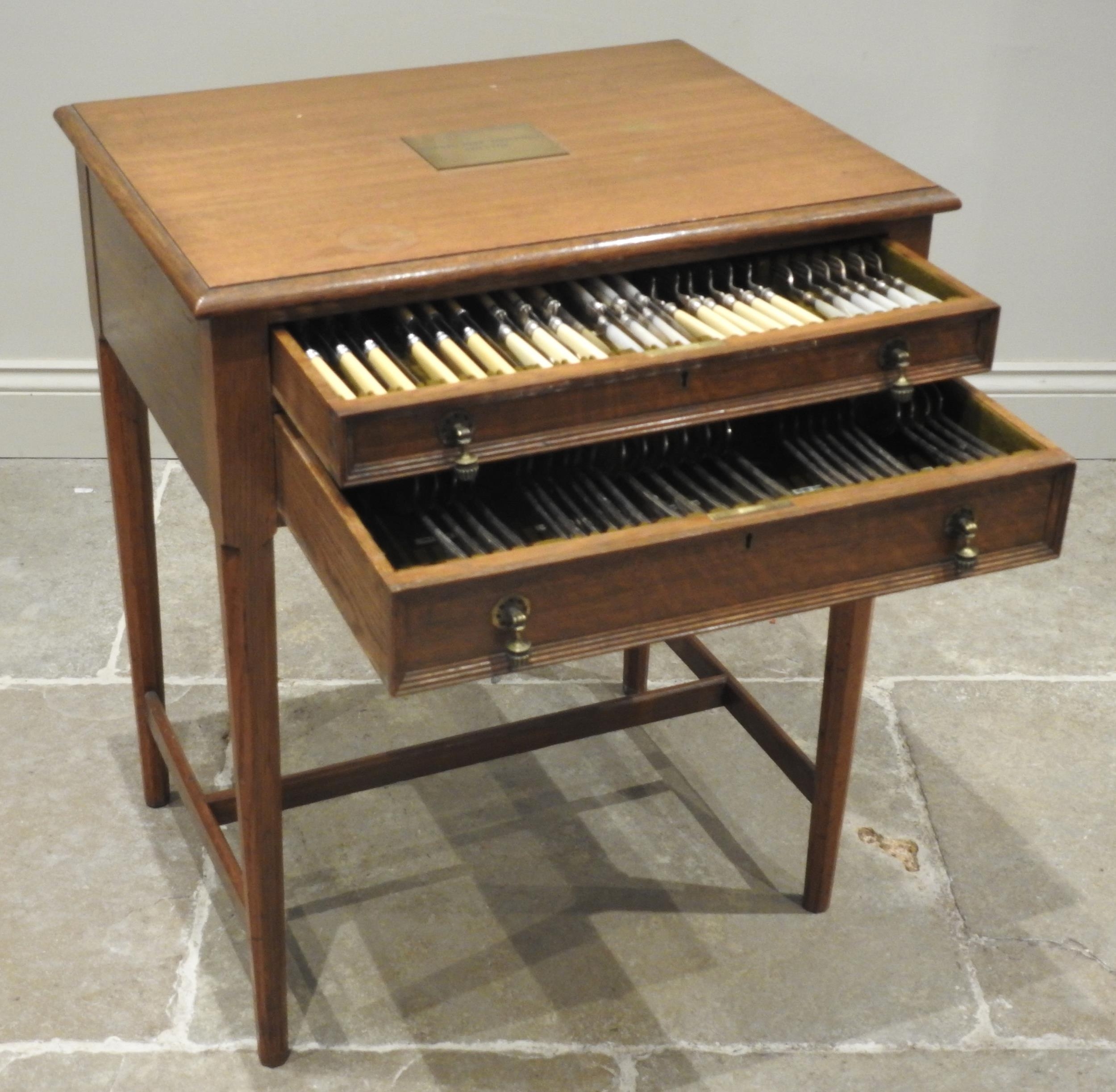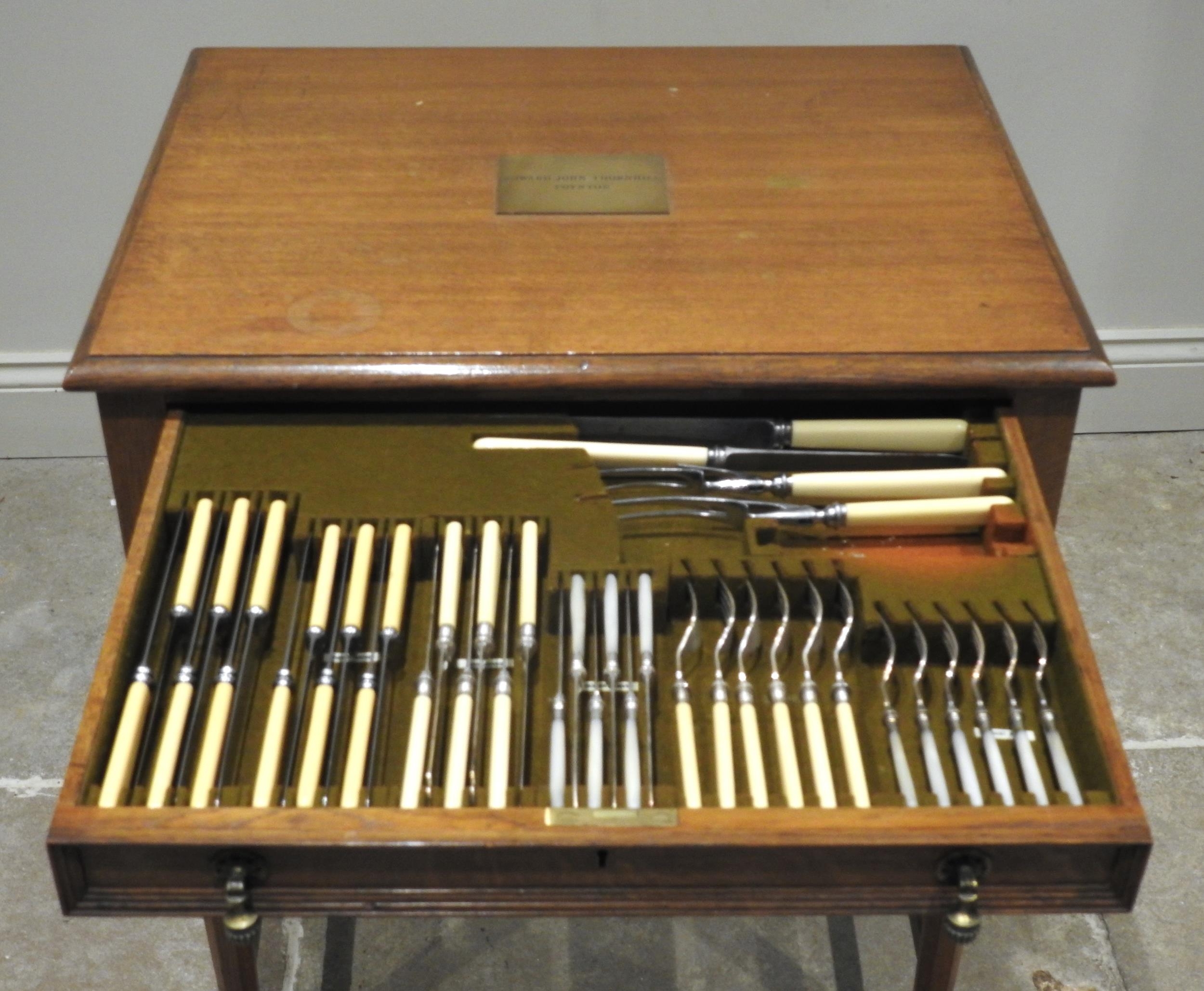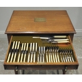 An early 20th century Mappin and Webb silver plated canteen of flatware, comprising Grecian style table spoons, soup spoons, dessert forks, teaspoons, etc, all to a fitted two drawer oak canteen, with associated flatware included (qty)