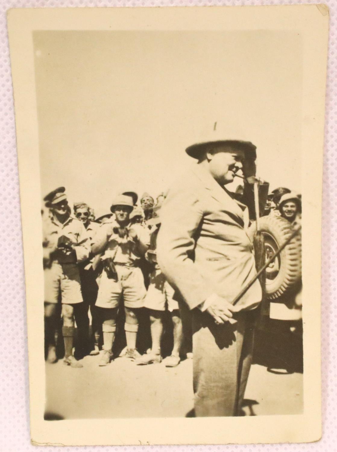 Winston Churchill, WWII period candid photograph of Churchill meeting troops in tropical uniforms, undated, inscribed verso. P&P Group 1 (£14+VAT for the first lot and £1+VAT for subsequent lots)
