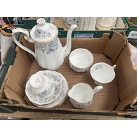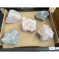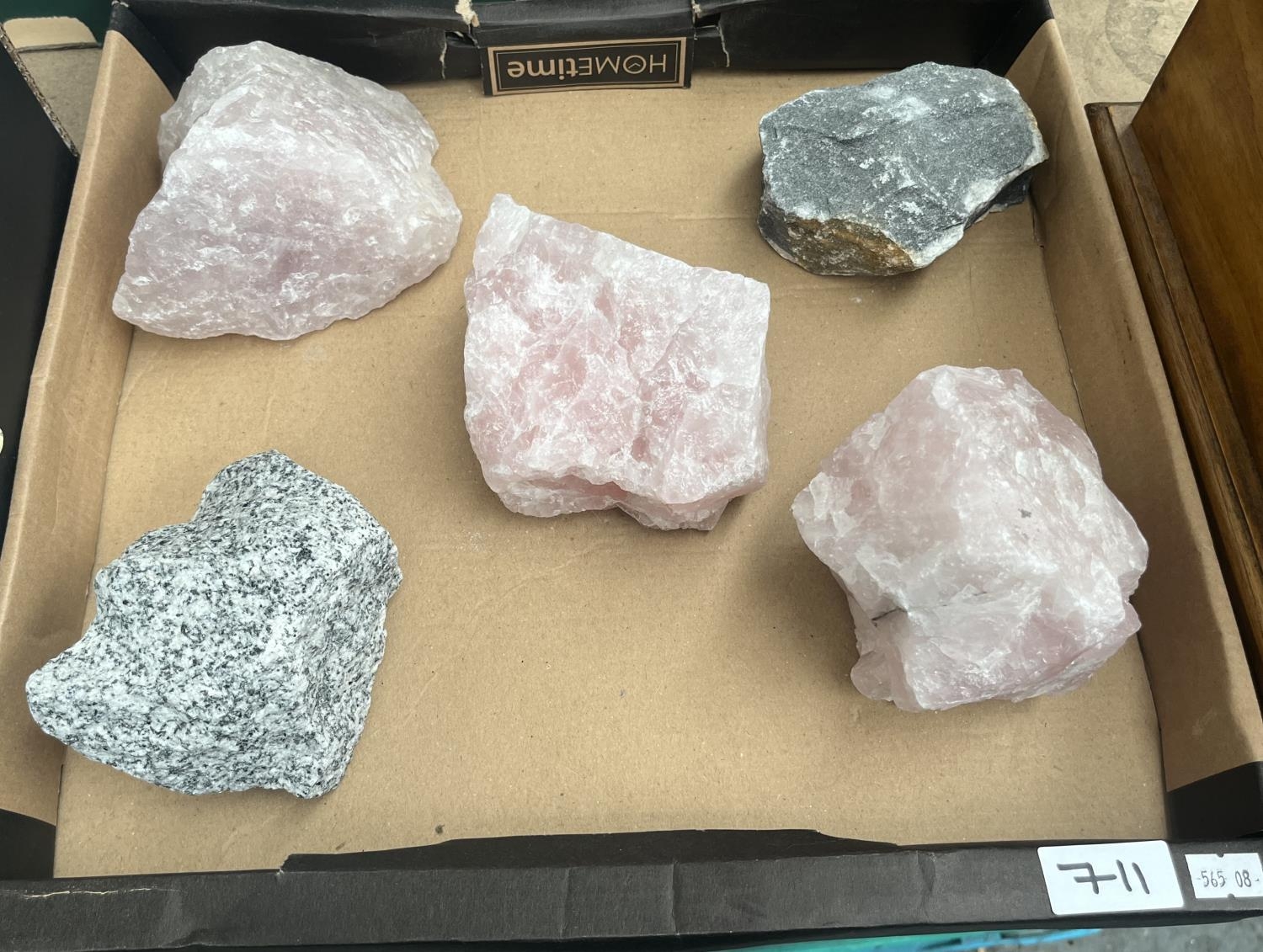Box containing a quantity of raw mineral specimens including Rose Quartz