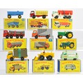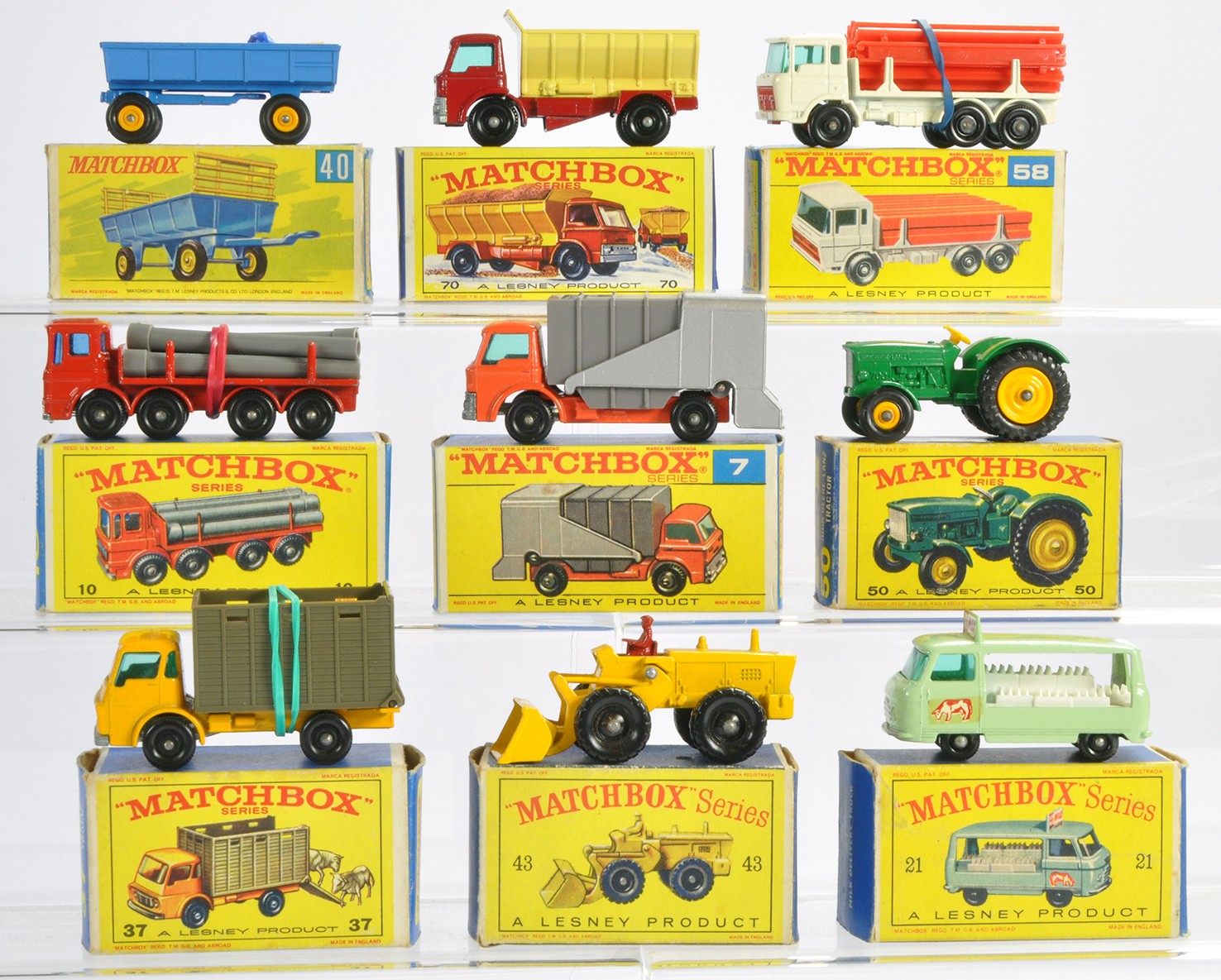 Matchbox Regular wheels comprising nine boxed issues as shown. Gritter Lorry, Tractor, Pipe Truck etc. Mostly very good or excellent in some good but mostly very good/excellent boxes. Generally Ex-Shop Stock.