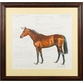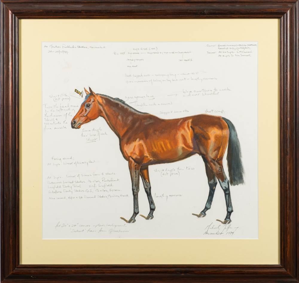 * Michael Jeffery [b.1965] - Racehorse High Rise, at Moulton Paddocks Stable, Newmarket, October 1999,: signed and dated bottom right, further inscribed with detailed notes, pastel and pencil drawing, 46 x 49cm.