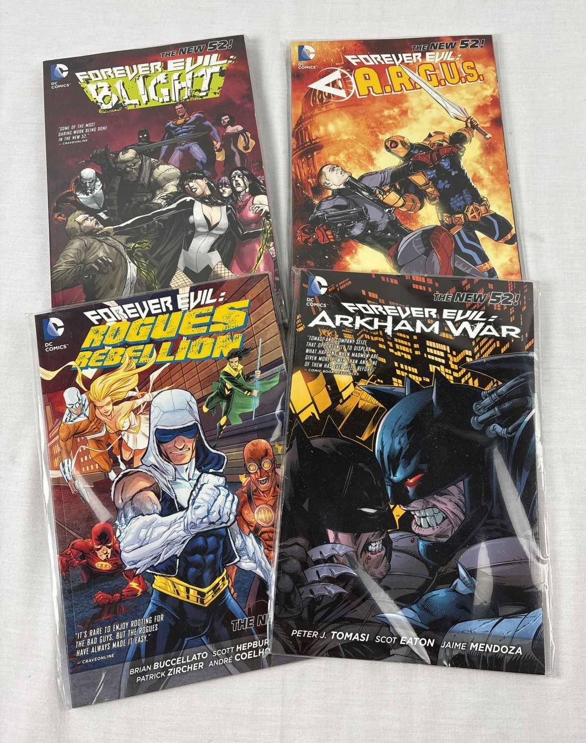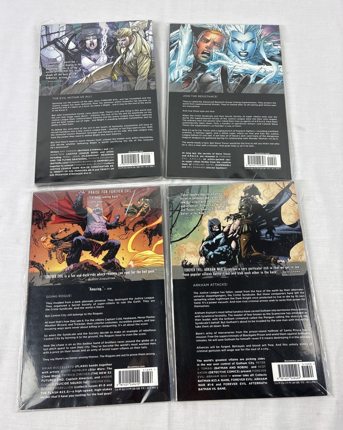 4 Forever Evil (The New 52!) graphic novels from DC Comics. Rogues Rebellion, Arkham War, A.R.C.U.S. and Blight. All in cellophane packaging.