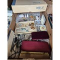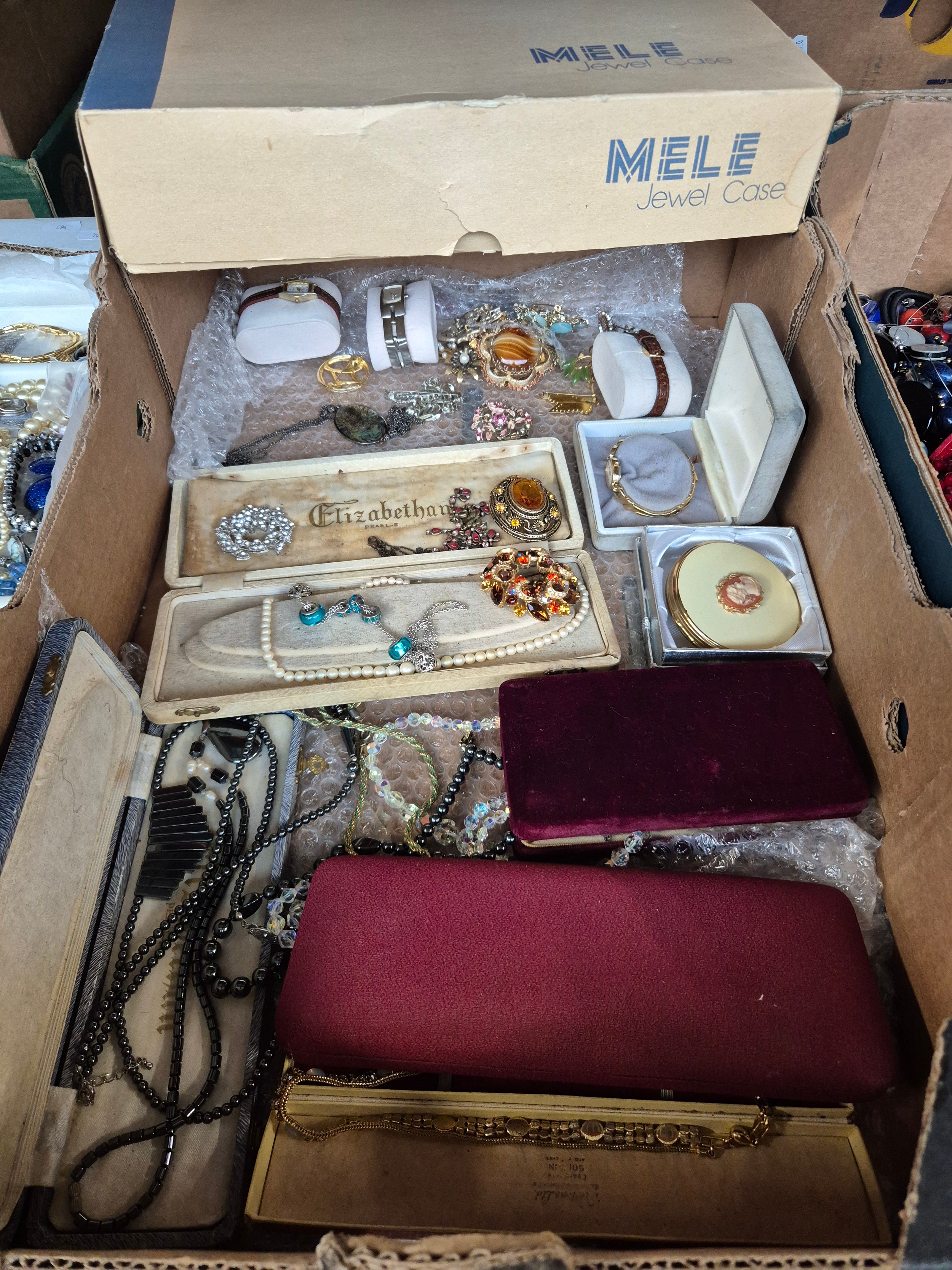 A box of assorted vintage costume jewellery & watches to include sphinx brooch, Art Deco hematite necklace together with Mele 1950s jewel case.
