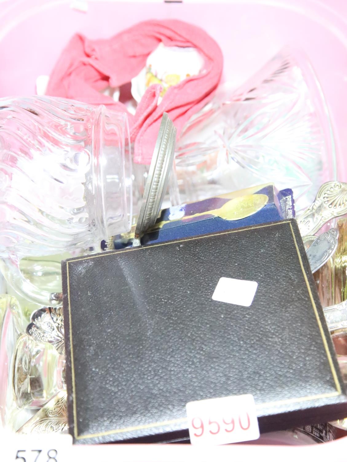Quantity of mixed glass silver plated items and ceramics including Wedgwood and Aynsley. Not available for in-house P&P.