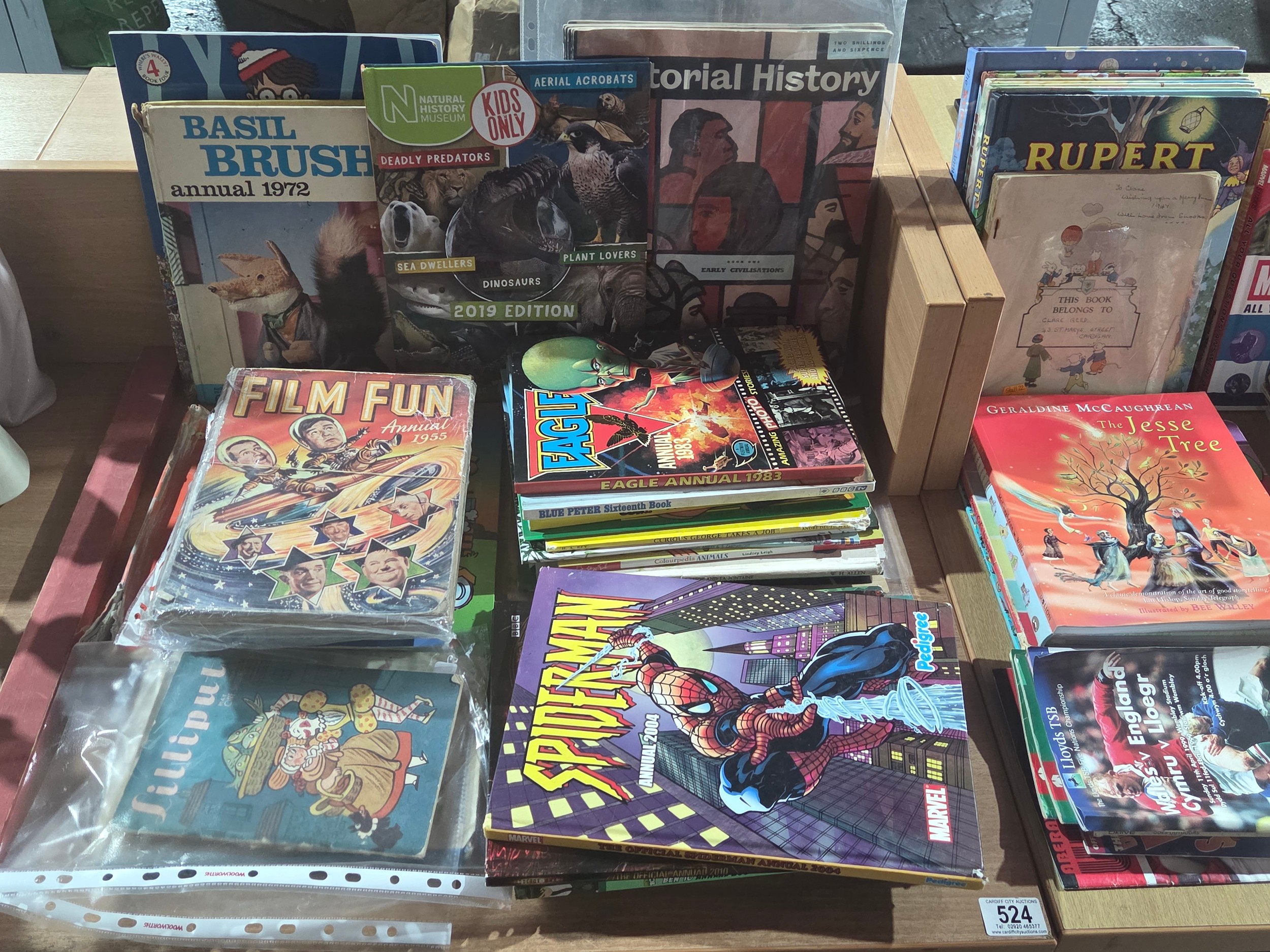 A selection of vintage Rupert the Bear, Spiderman, Doctor Who and other vintage annuals