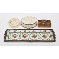 Group of boxes and snuff boxes, including: a bone gilt-metal mounted oval box and cover; 19th century tortoiseshell trinket box and cover; a painted alabaster circular snuff box and cover; a Versailles porcelain gilt-metal mounted Sevres-style pen tray (4)