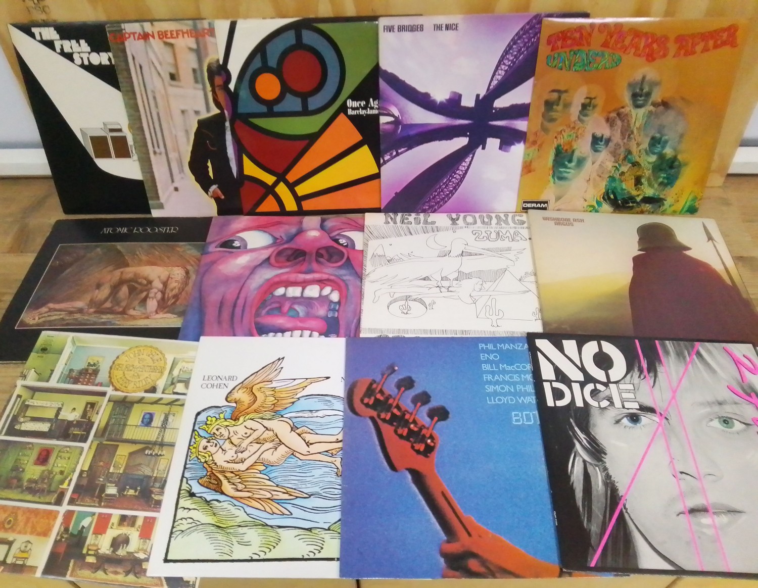 Thirteen assorted rock and pop LPs including John Cale, Leonard Cohen, 801 Live, No Dice, Wishbone Ash, Neil Young, King Crimson, Atomic Rooster, Undead etc.