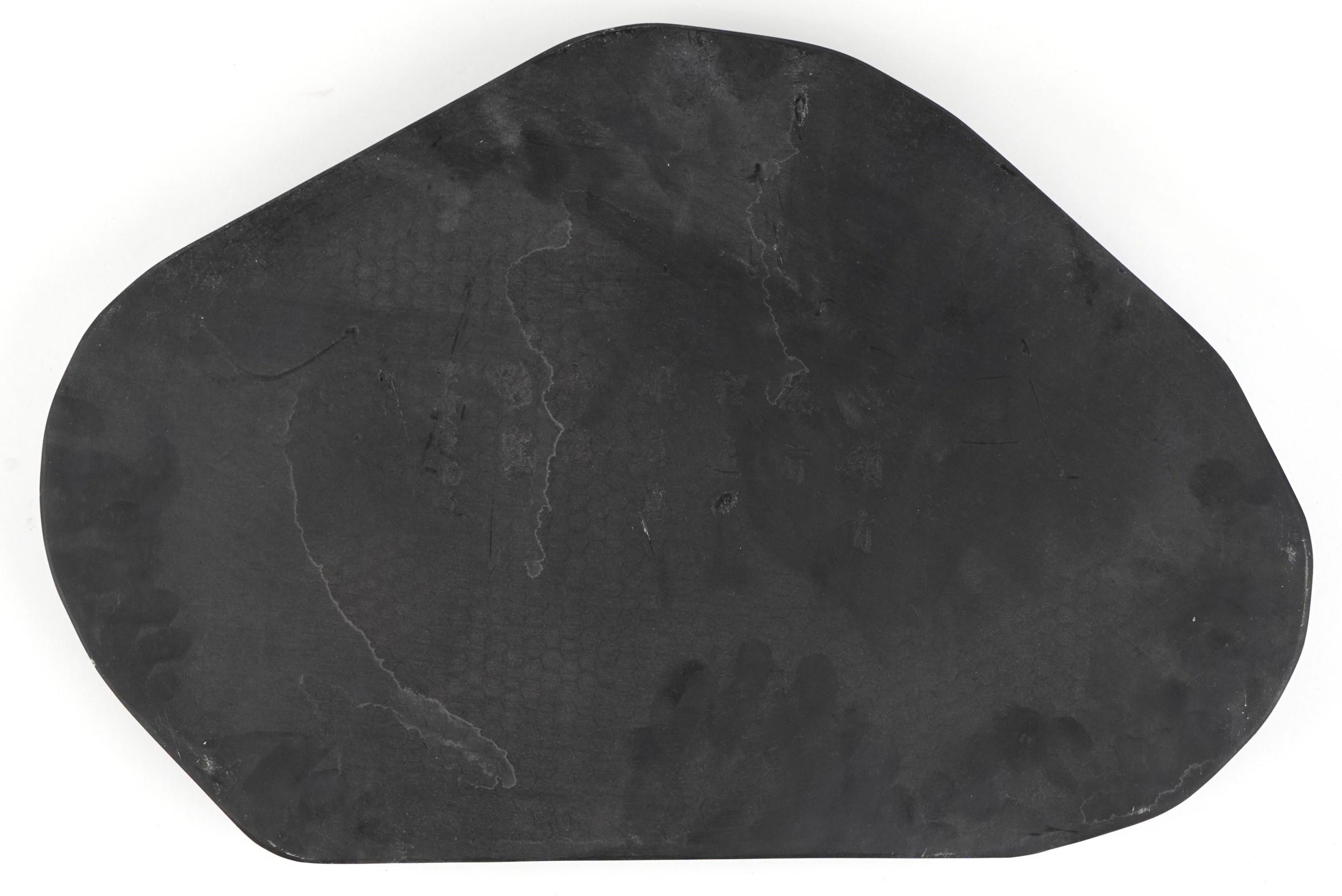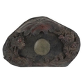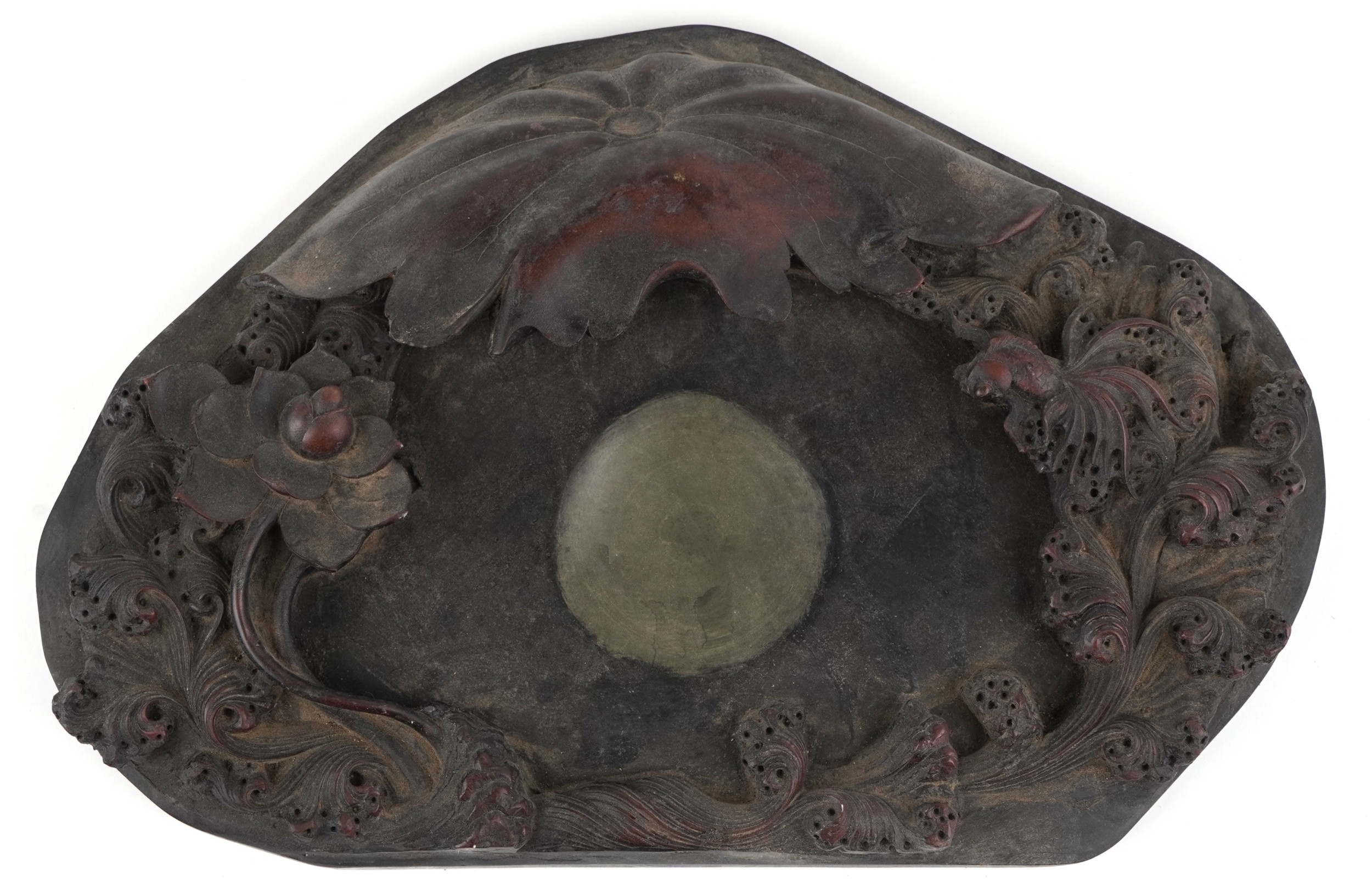 A Chinese scholar's inkstone carved with a fish amongst waves, 49cm wide.