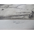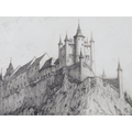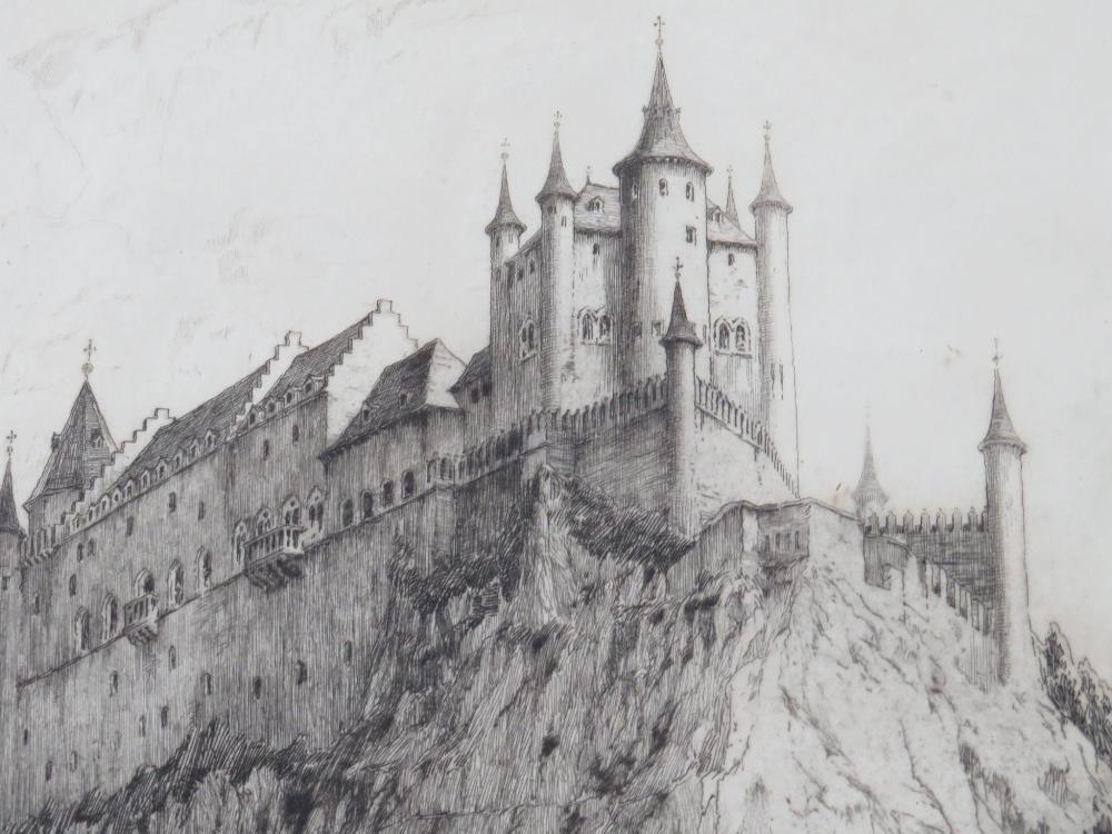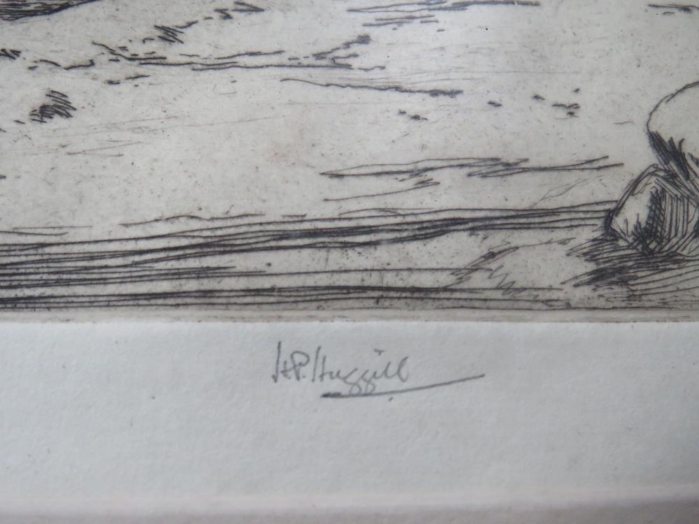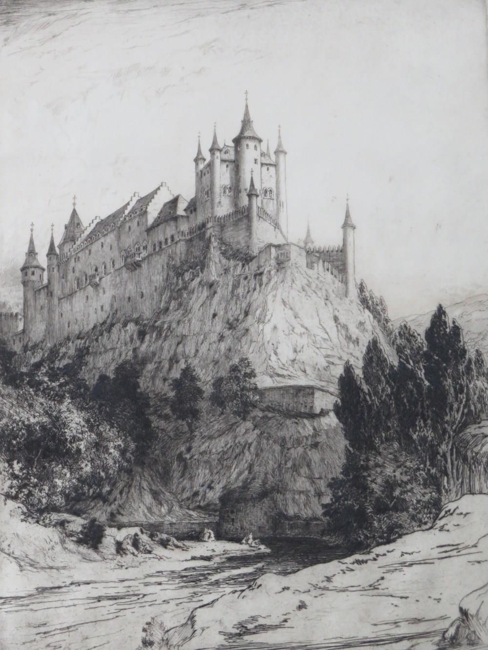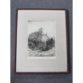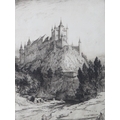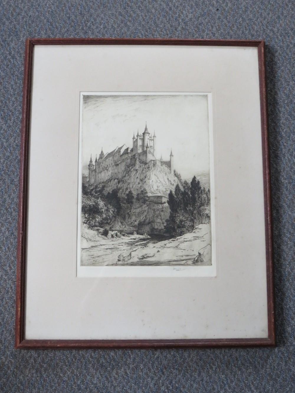 HENRY PERCY HUGGILL (1886-1957). A Continental wooded river landscape with figures and hill top chateau, signed in pencil lower right, etching on paper, framed and glazed, 35 x 25 cm