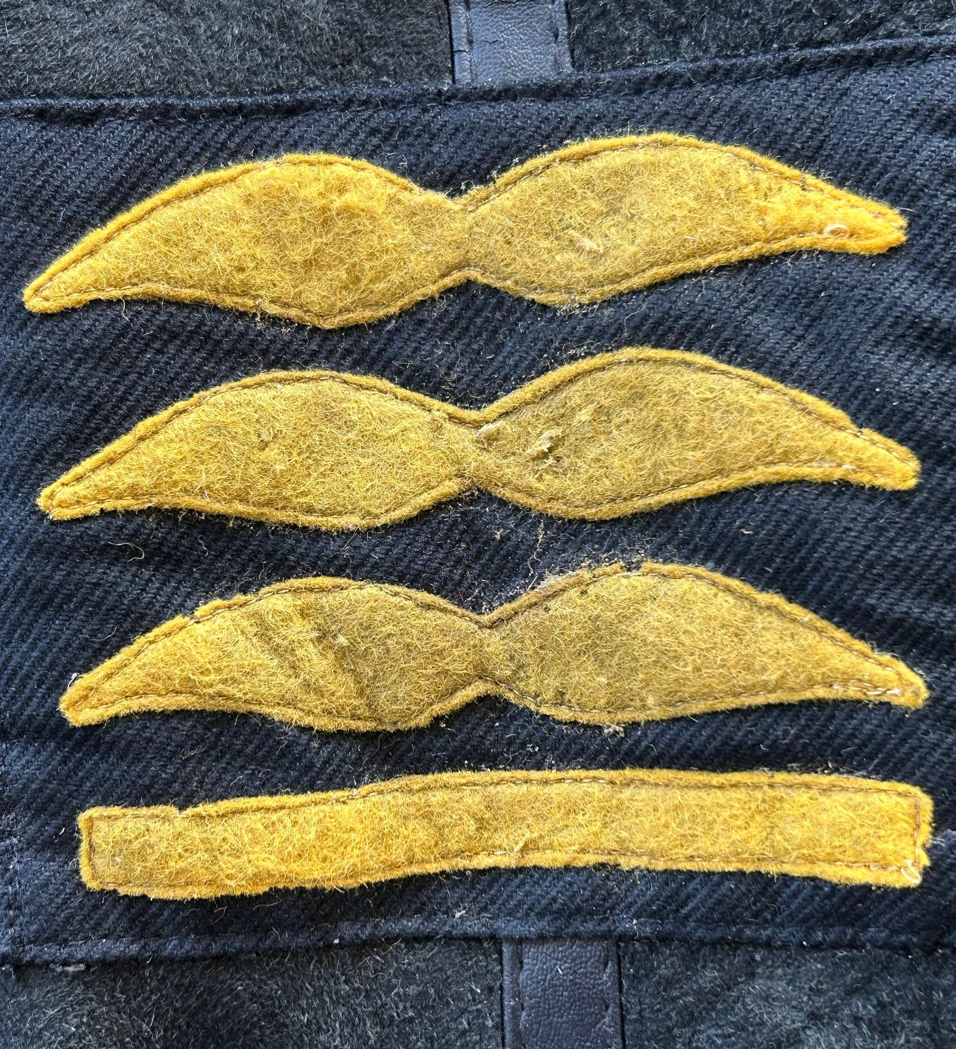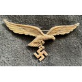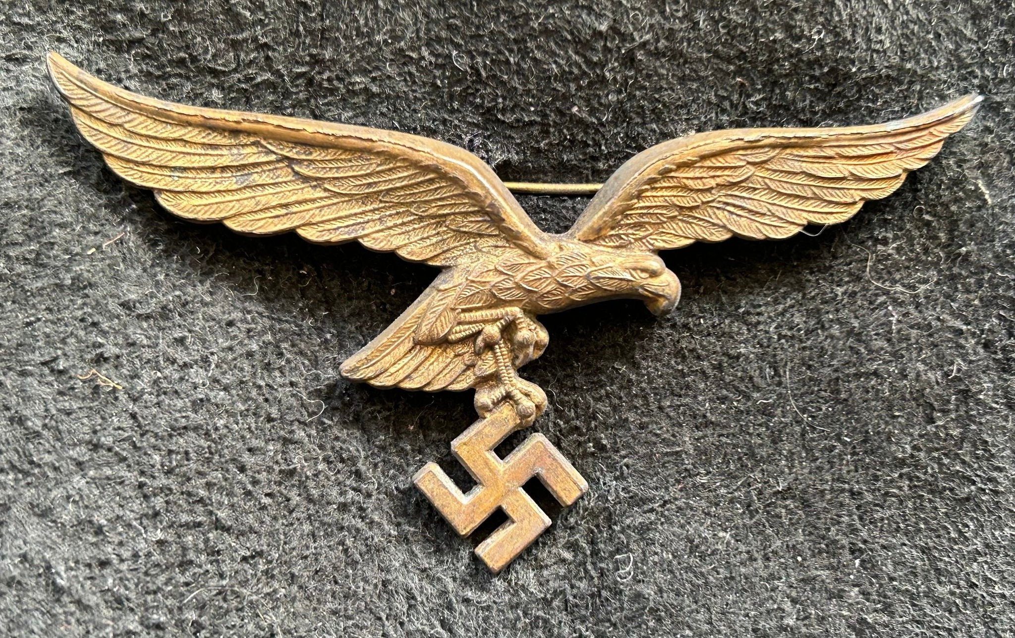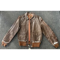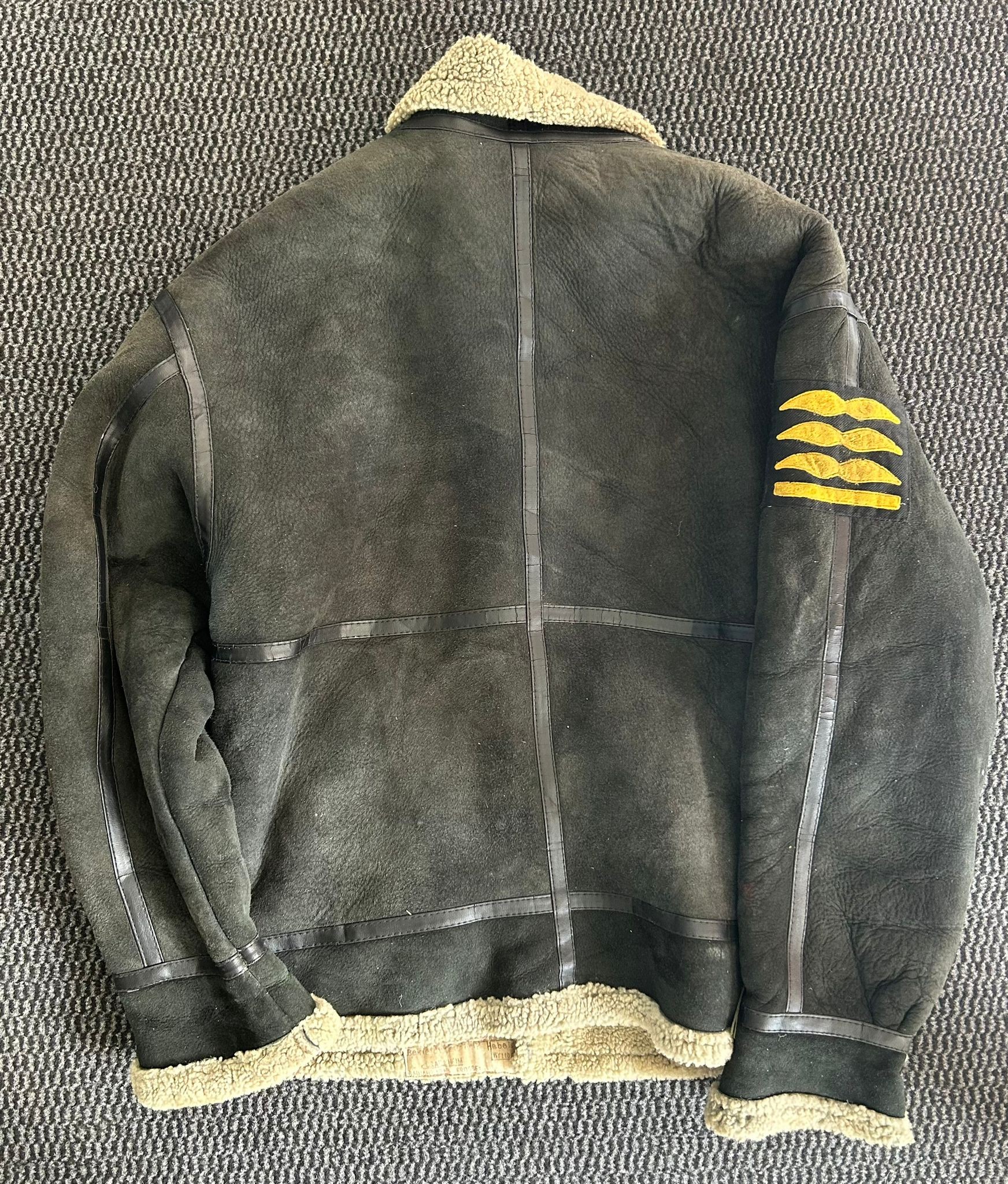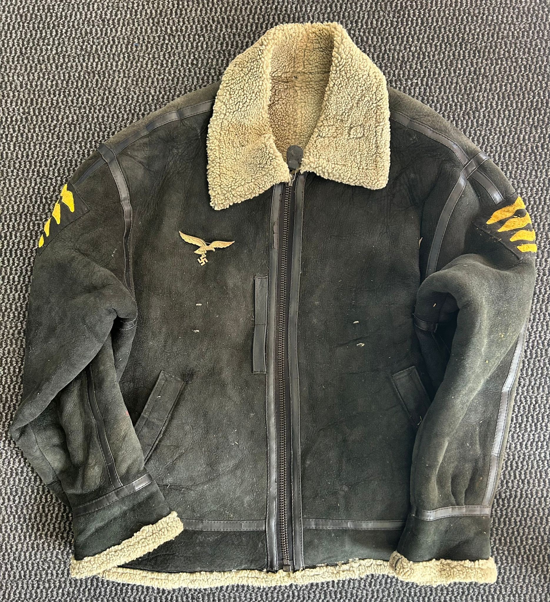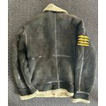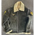 A shearling lined suede jacket in the style of a World War II German Luftwaffe pilot jacket with LT general arm boards and metal eagle attached to the chest, good condition.