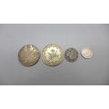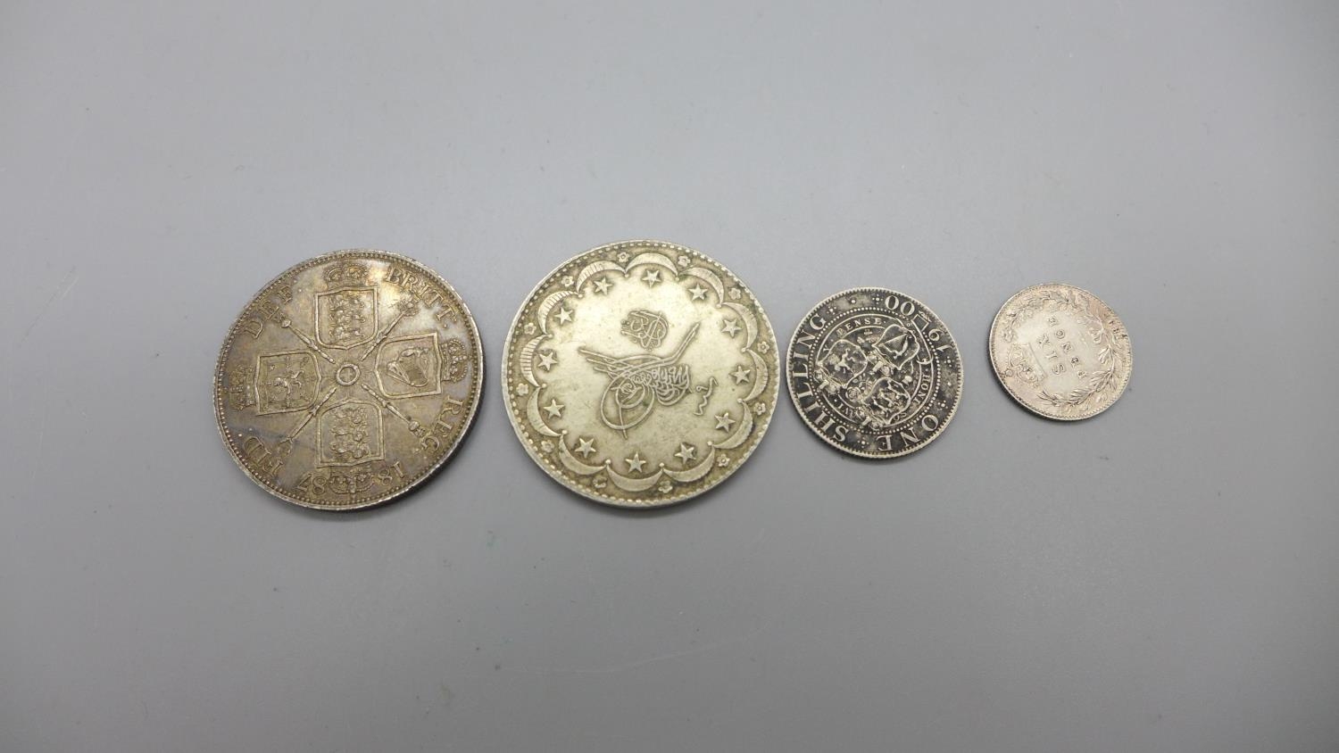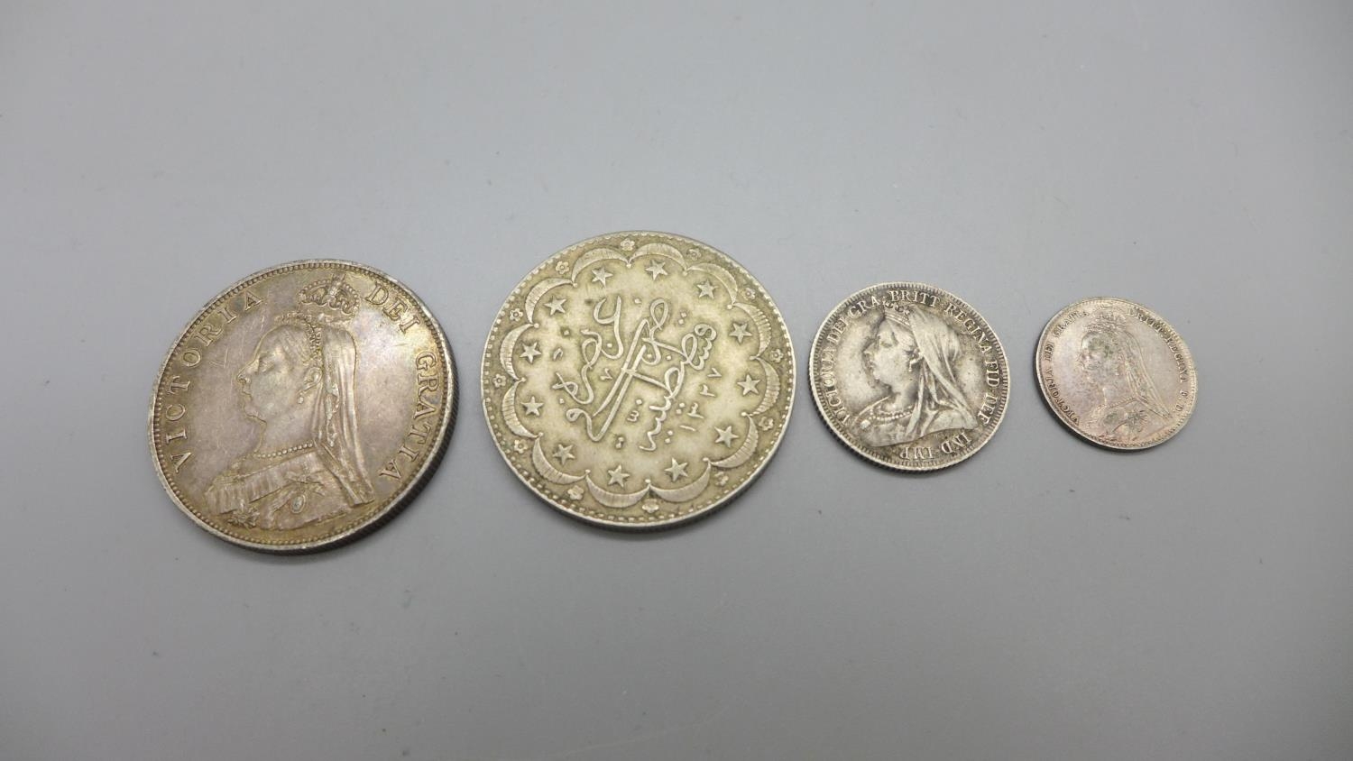 A Victorian 1887 double florin, two other Victorian coins and on other coin
