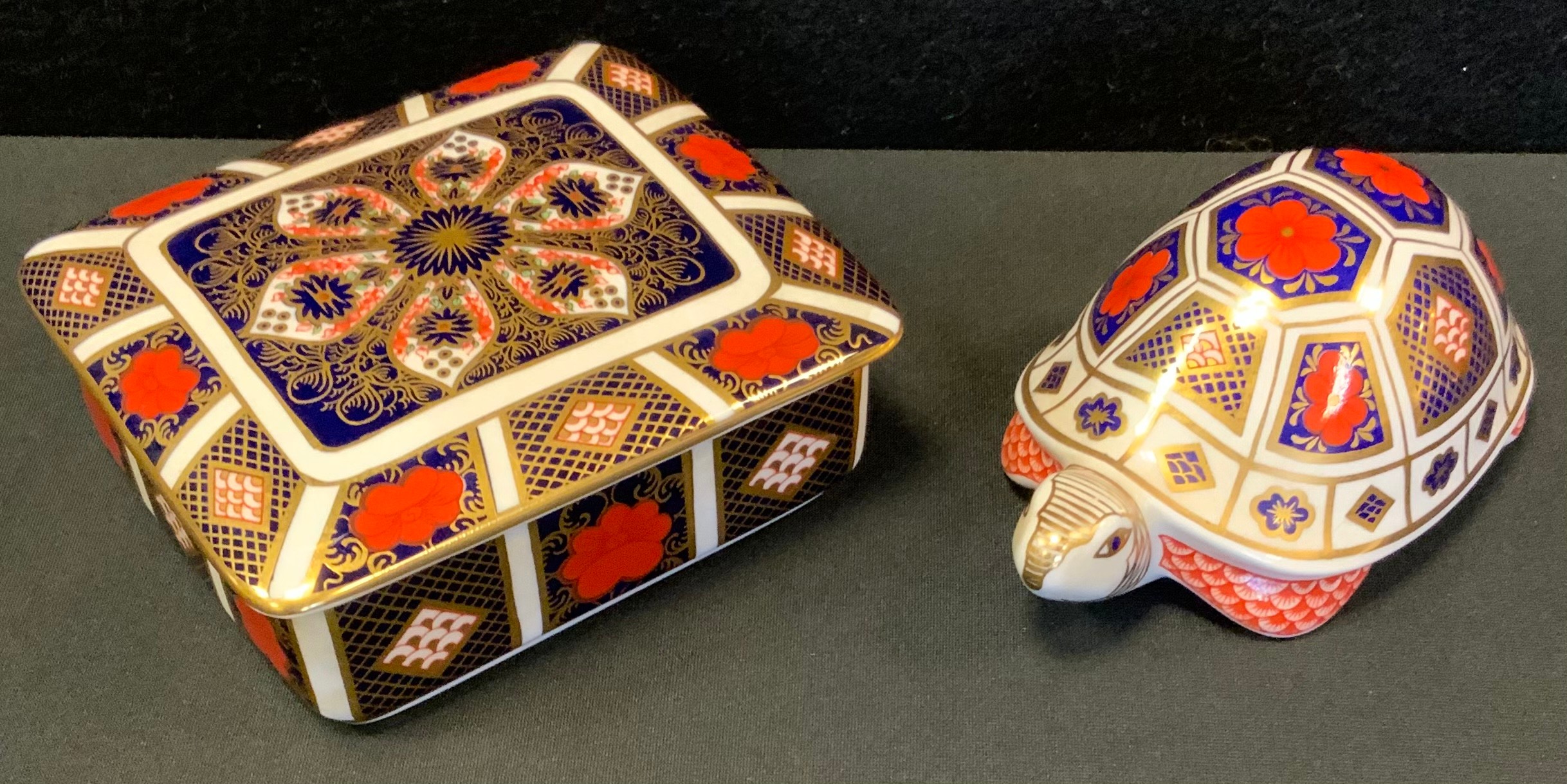 A Royal Crown Derby 1128 pattern rectangular trinket box and cover; a Royal Crown Derby paperweight, Tortoise, gold stopper (2)