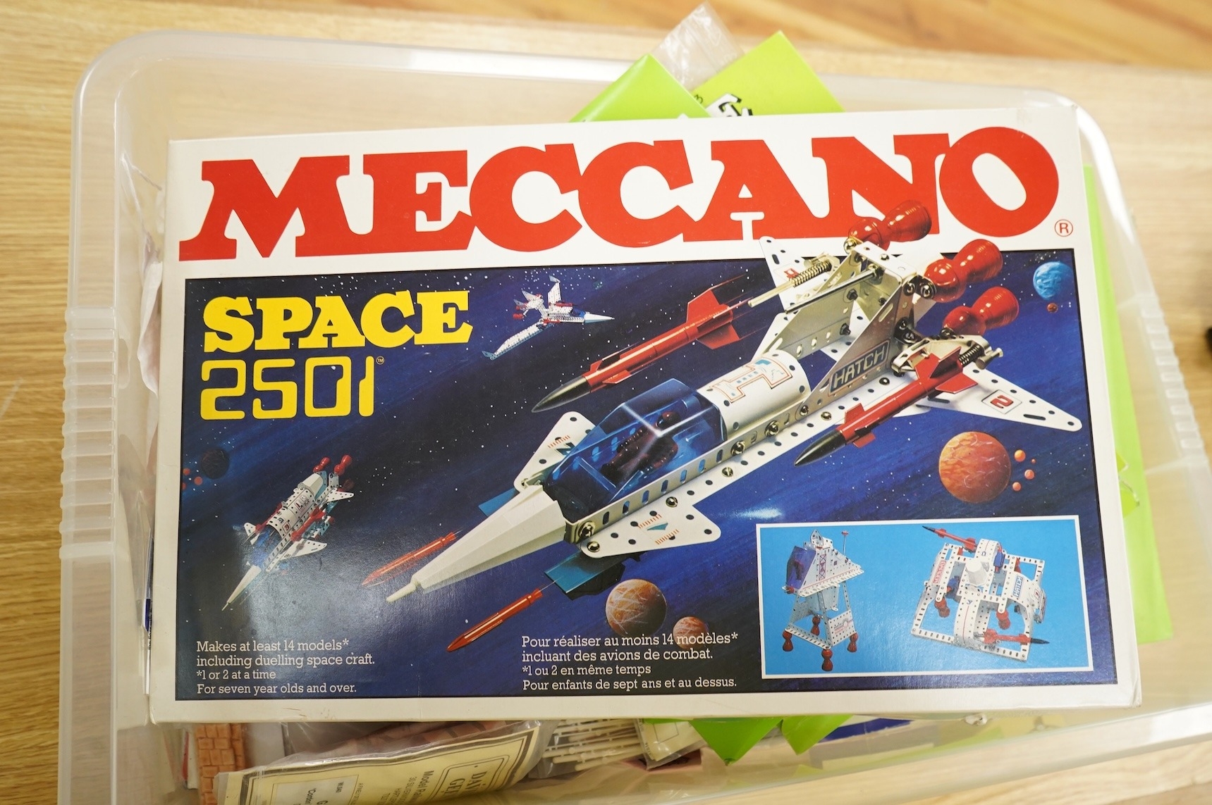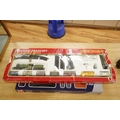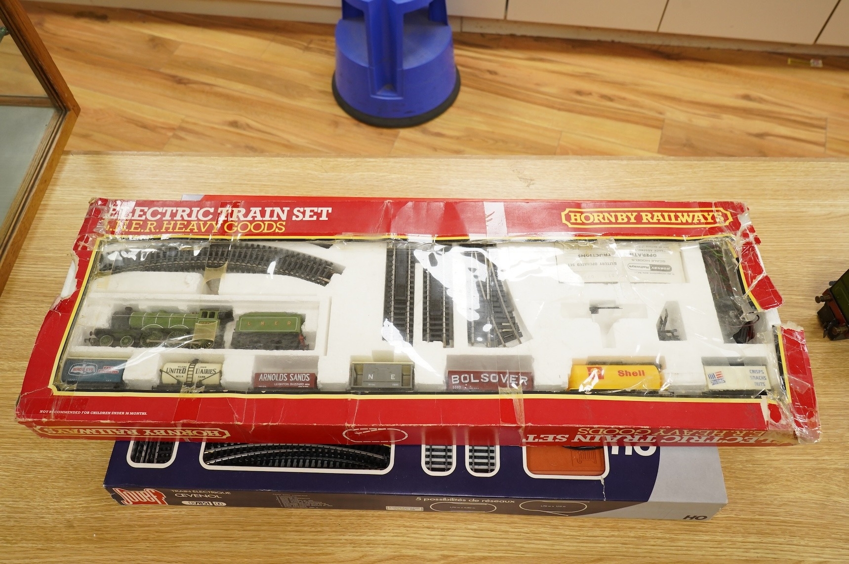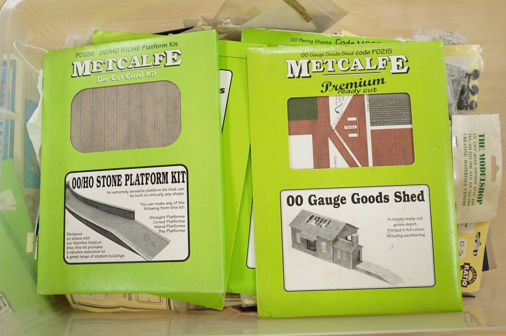 A collection of 00 gauge model railway, including three box train sets by Jouef, Mainline and Hornby, together with a large selection of unconstructed railway related plastic and metal kits and accessories, manufacturers including; Metcalfe buildings, Ratio plastic models, Cooper Craft, David Green, Dapol, Wills, etc., plus a boxed Meccano Space 2501 construction set