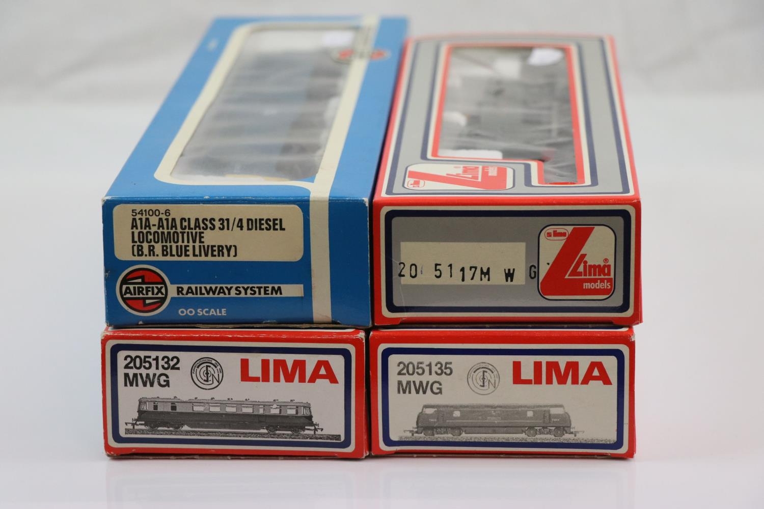 Four boxed OO gauge locomotives to include 3 x Lima (205135MWG Sharpshooter, 205117MWG GWR0-6-0 & 205132 MWG) and Airfix 54100-6 AIA-AIA Class 31/4 Diesel Locomotive