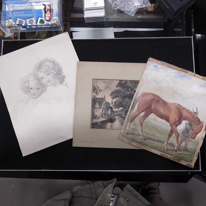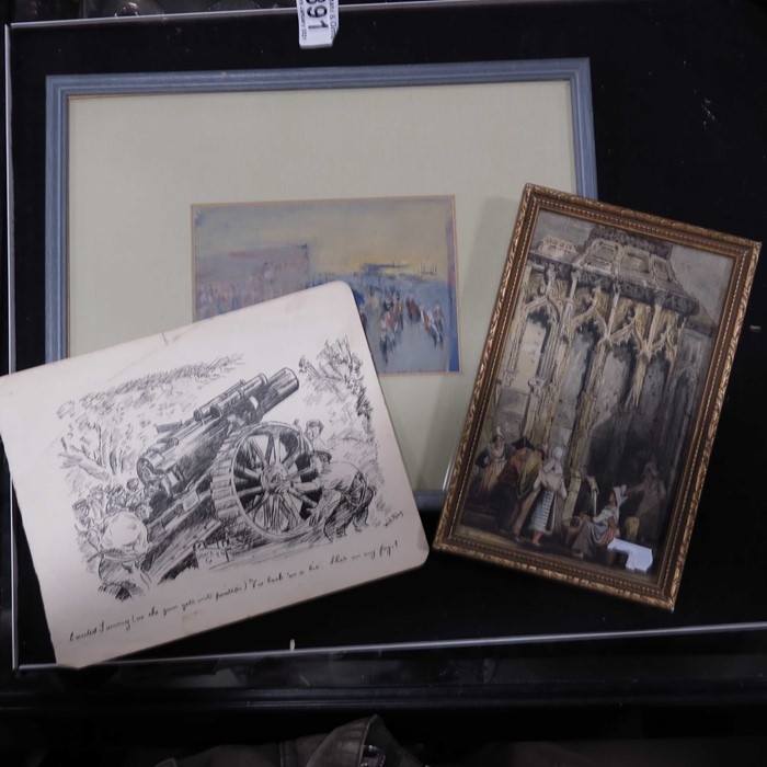 A selection of pictures, to include a William Riley world war cartoon print, a watercolour of a horse, and further items