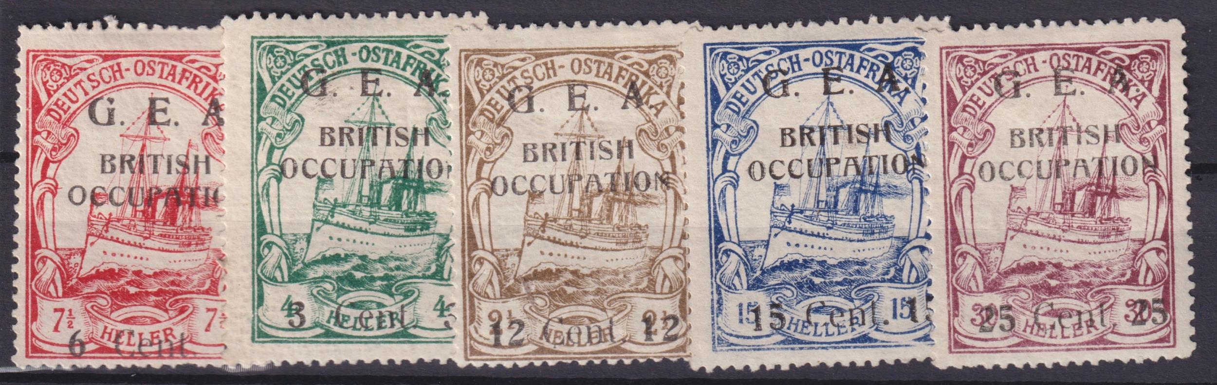 German East Africa 1918 bogus ‘Karissimbi Provisionals’ set of x5 mint Yacht issues comprising 3c/6c/12c/15c/25c, believed to be produced within the British propaganda executive during the period from 1916-1918, though there are competing theories that they are of Italian origin post-WWI, or produced as provisional issues by German forces in DOA during 1917.