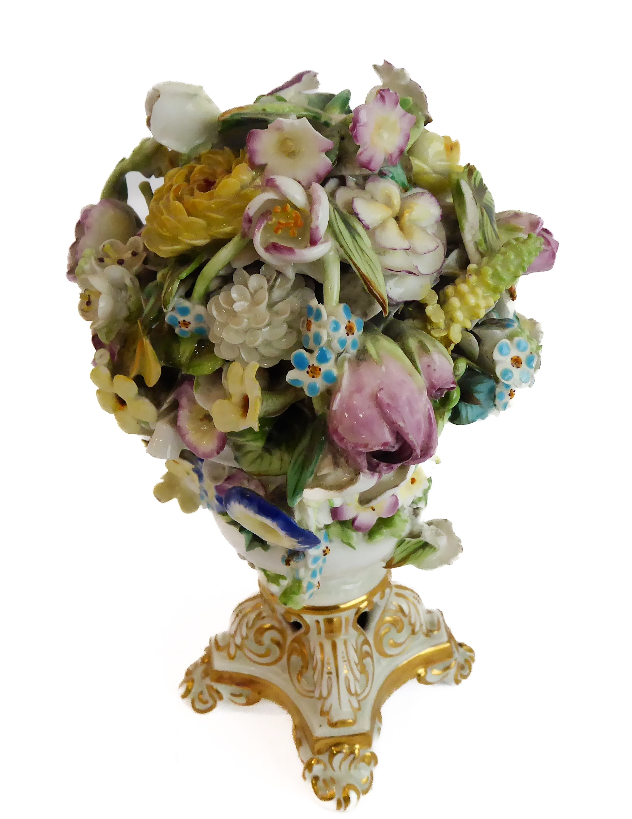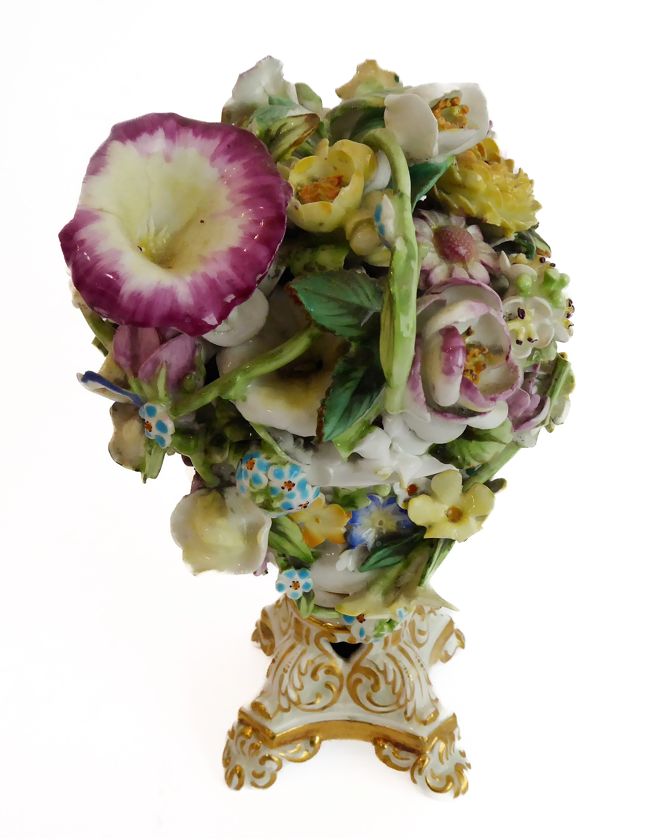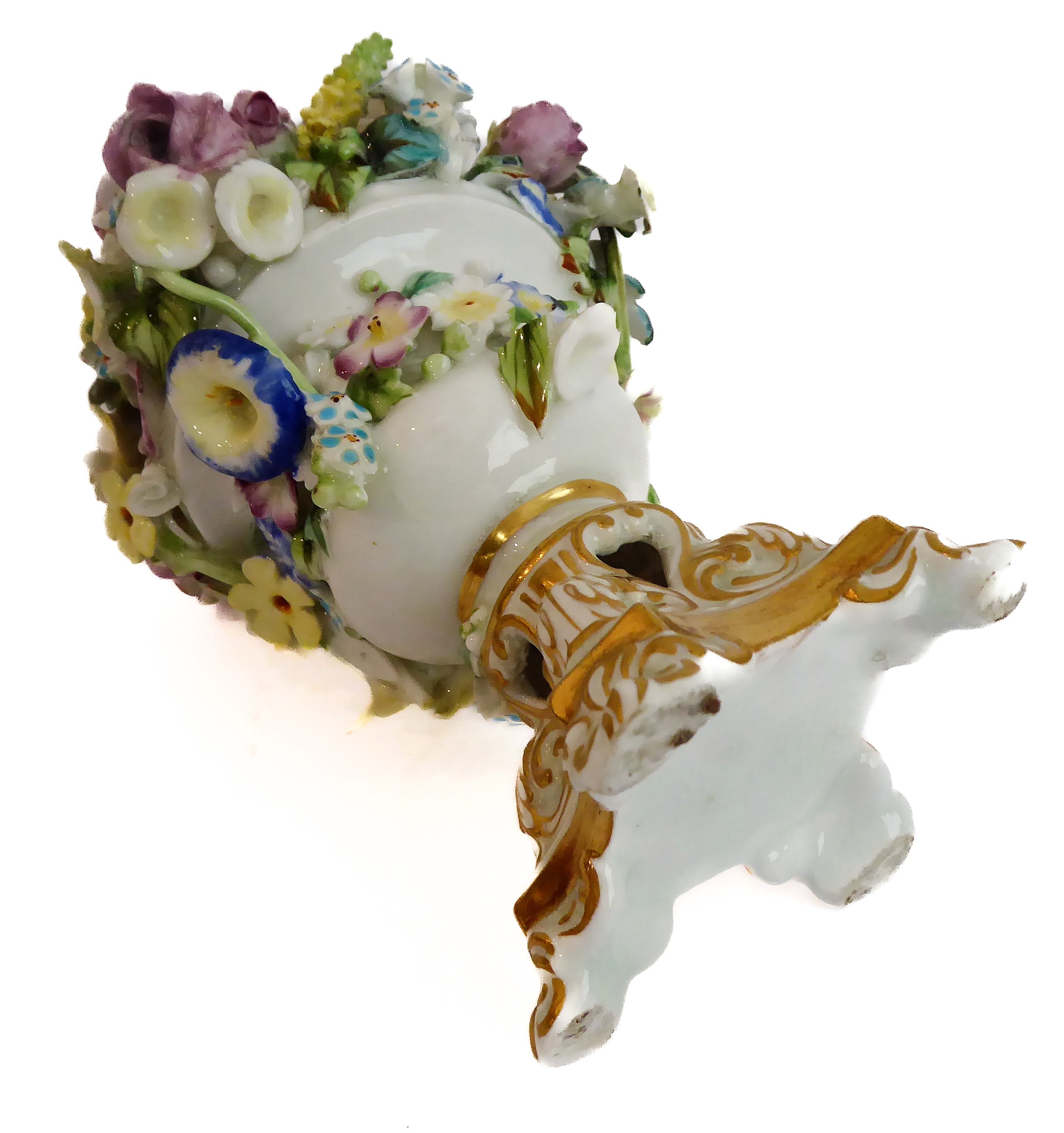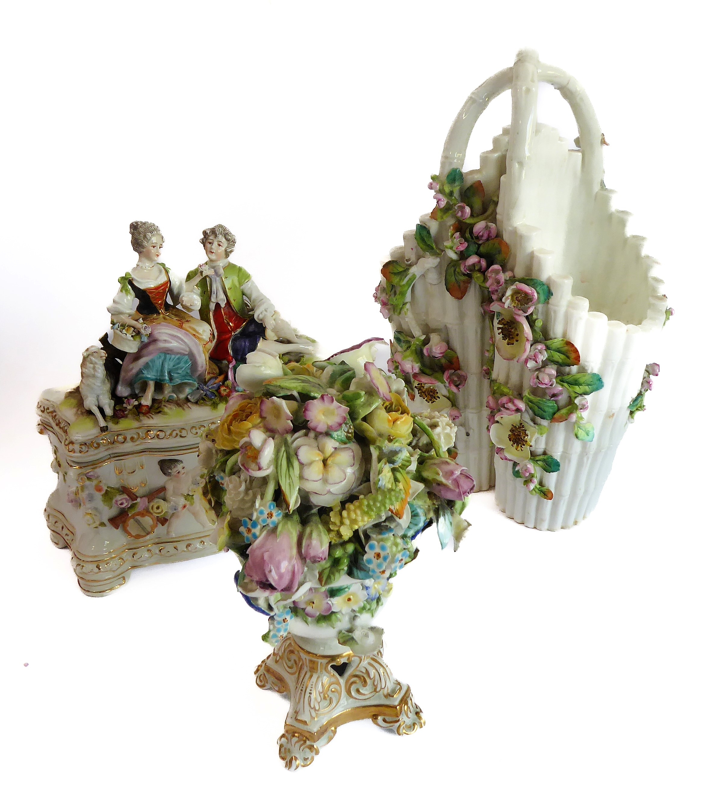 A small ceramic group to include a late 19th century double vase by Moore modelled as flower encrusted bamboo, a serpentine-sided continental casket: the cover finely decorated with seated figures in early dress with blue mark to underside and one further 19th century decorative piece as a classical-style urn encrusted with flowers with various hand-decorated flowers in Coalbrookdale style, raised on ornate gilded base (3)