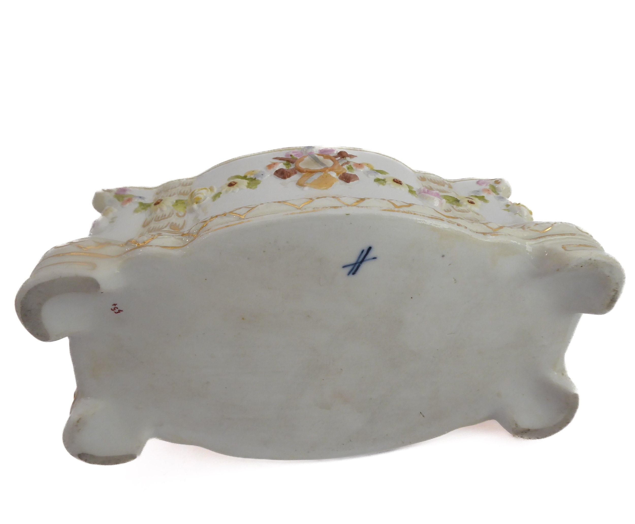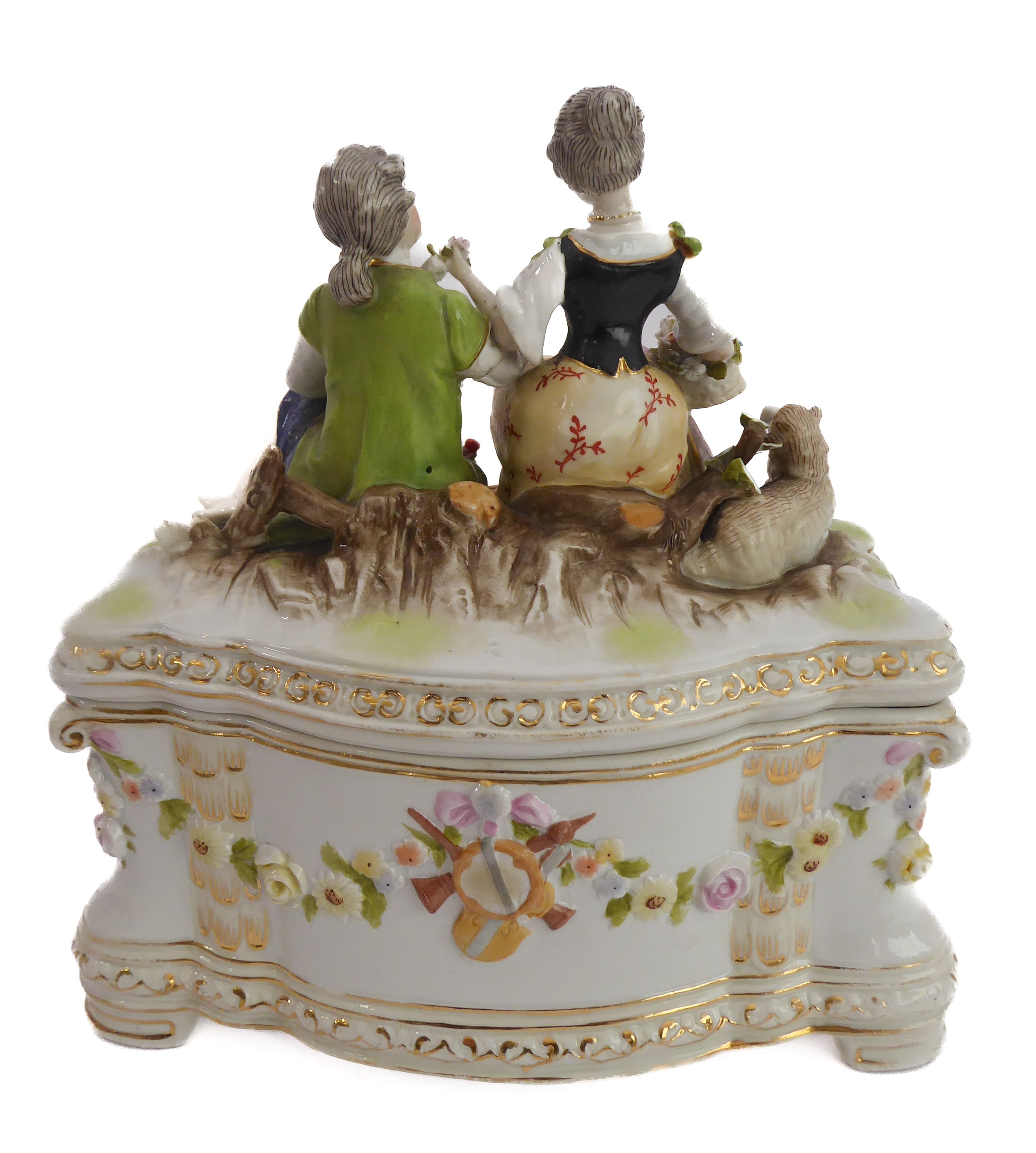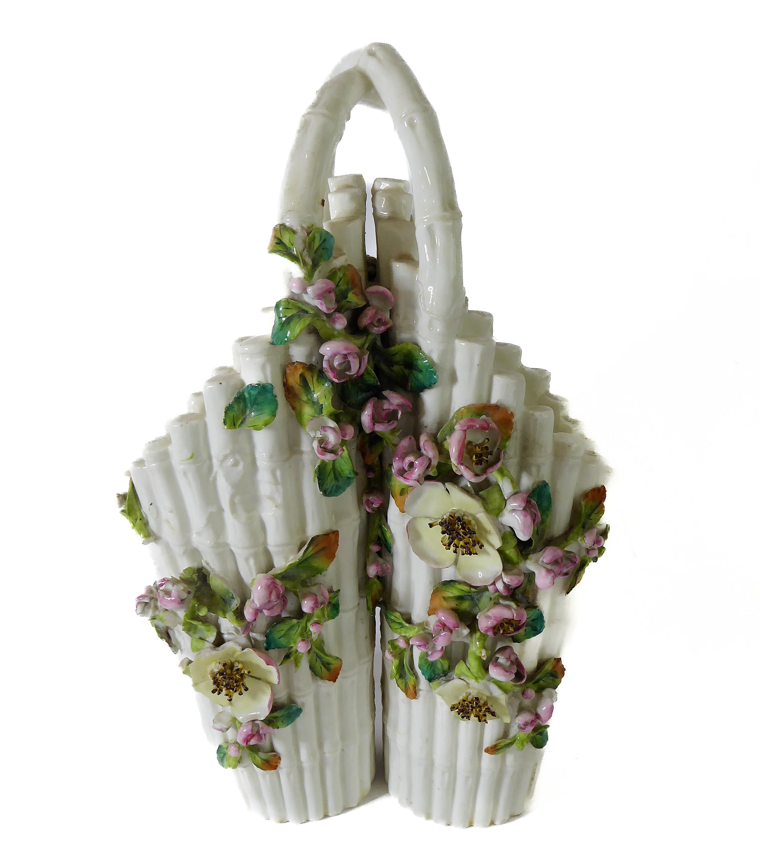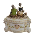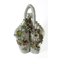 A small ceramic group to include a late 19th century double vase by Moore modelled as flower encrusted bamboo, a serpentine-sided continental casket: the cover finely decorated with seated figures in early dress with blue mark to underside and one further 19th century decorative piece as a classical-style urn encrusted with flowers with various hand-decorated flowers in Coalbrookdale style, raised on ornate gilded base (3)