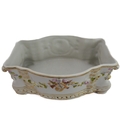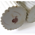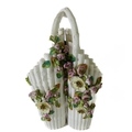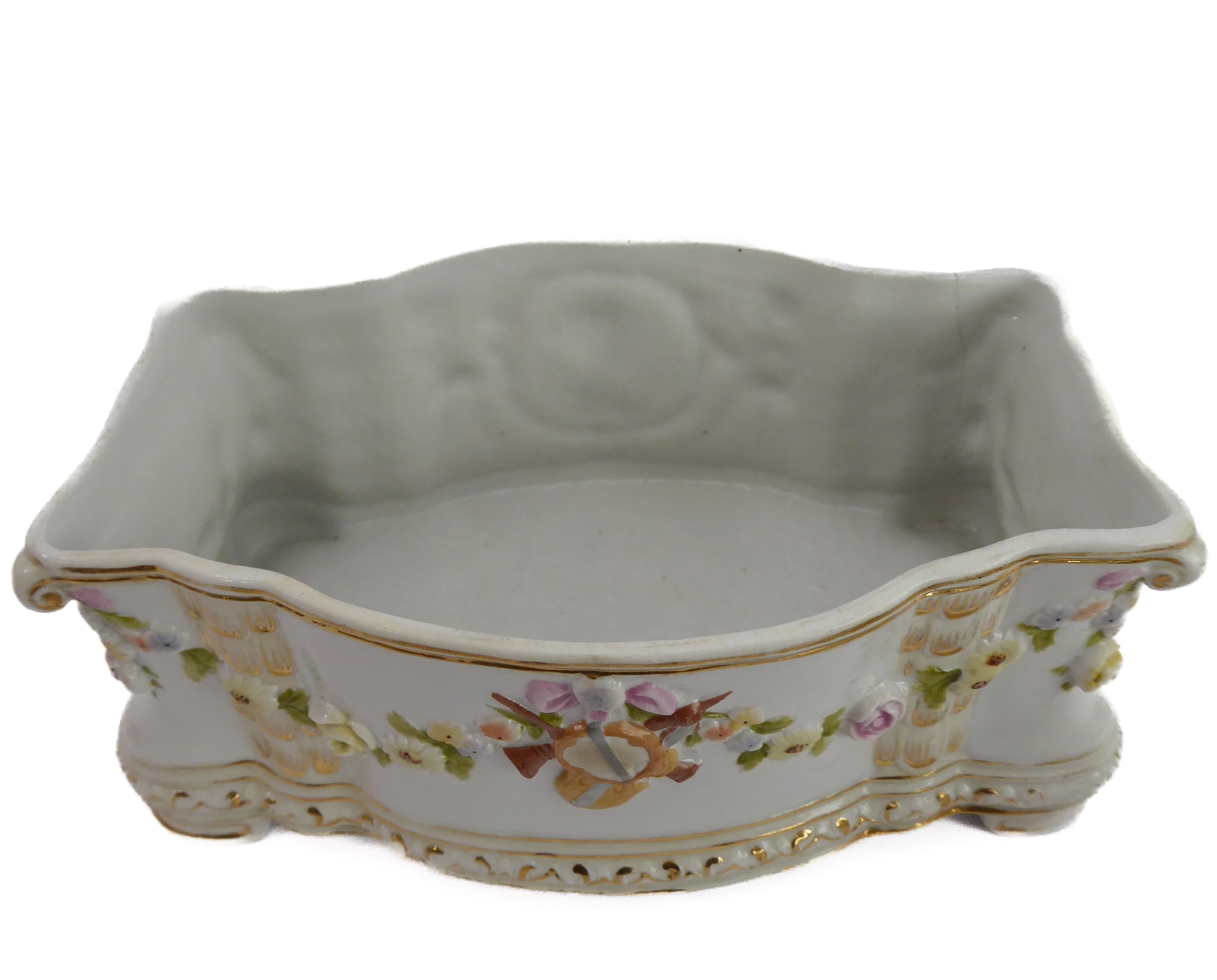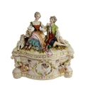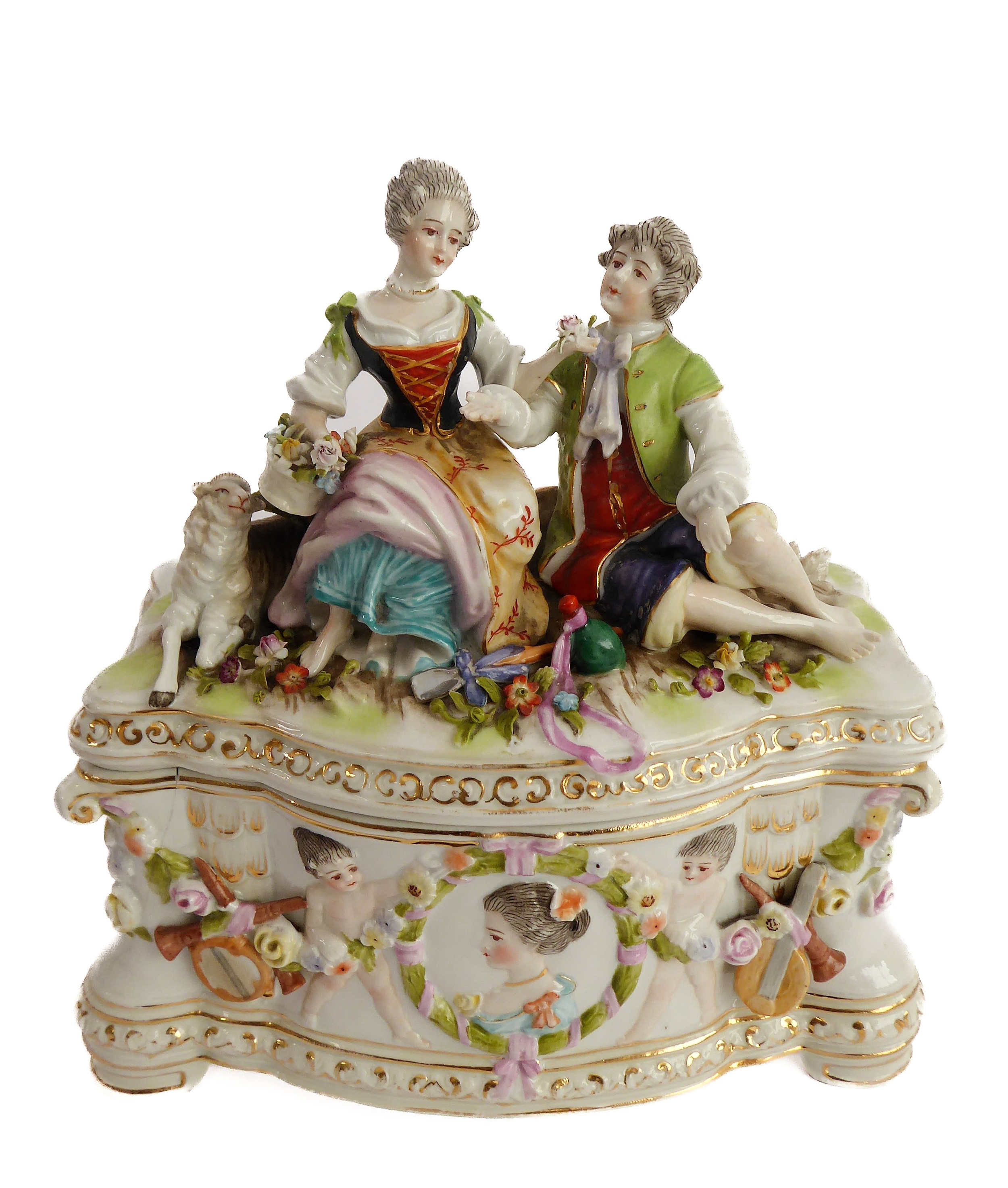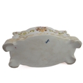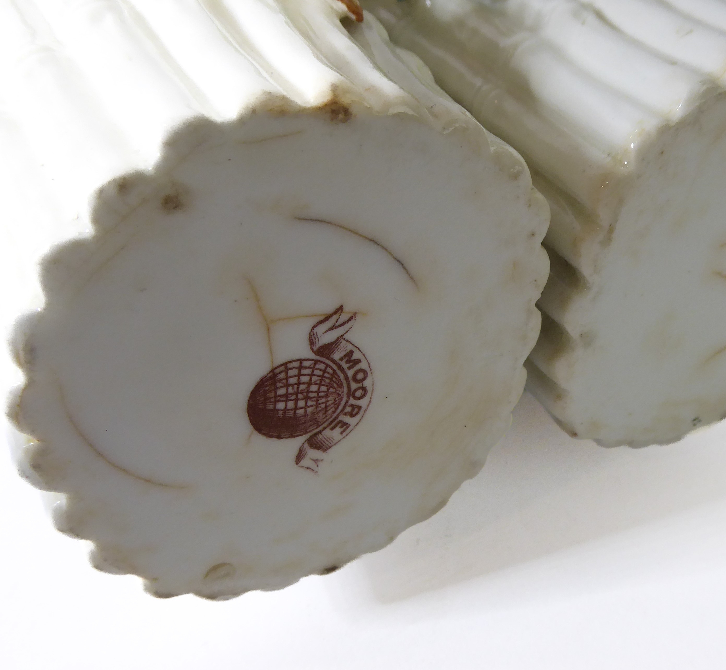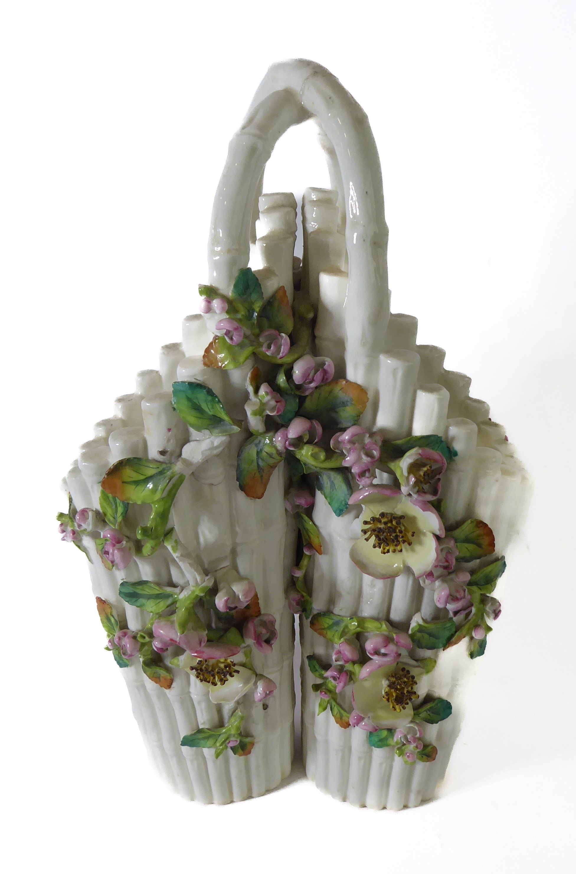 A small ceramic group to include a late 19th century double vase by Moore modelled as flower encrusted bamboo, a serpentine-sided continental casket: the cover finely decorated with seated figures in early dress with blue mark to underside and one further 19th century decorative piece as a classical-style urn encrusted with flowers with various hand-decorated flowers in Coalbrookdale style, raised on ornate gilded base (3)