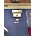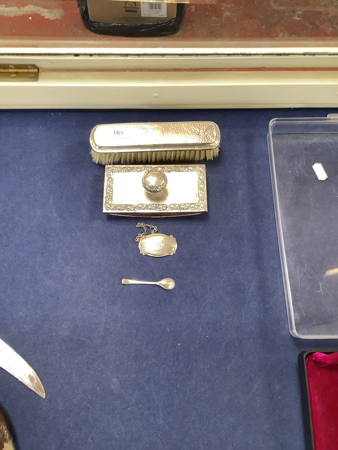 Four pieces of silver ware to include a desk blotter, a dressing table brush, a Port decanter label and a salt spoon