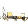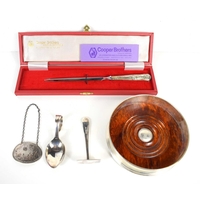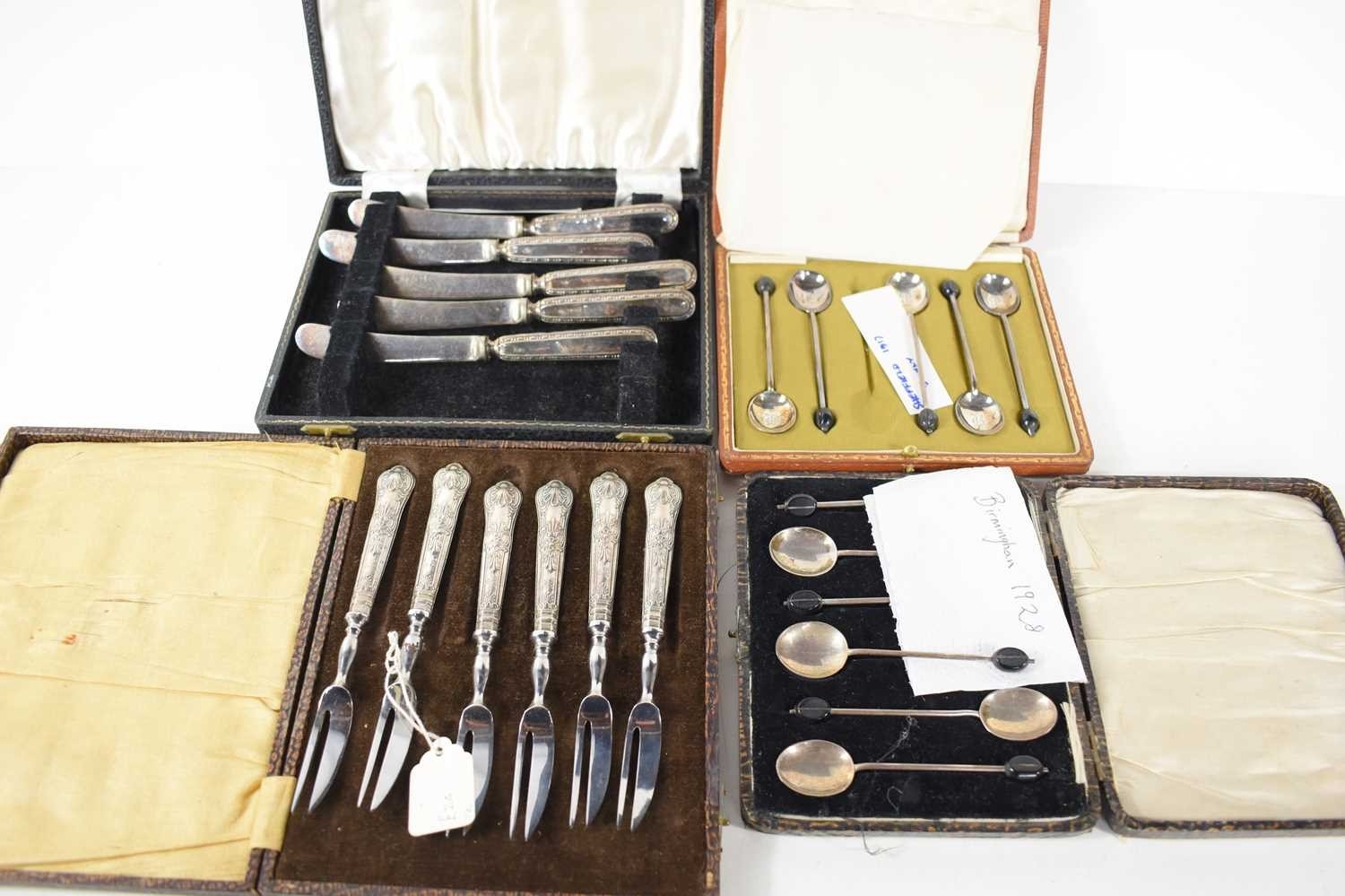 A group of silver and silver plate to include two sets of silver coffee spoons, a silver match box holder, a set of silver handled pastry forks and a Walker & Hall silver plated tea pot, cream jug and sugar bowl.