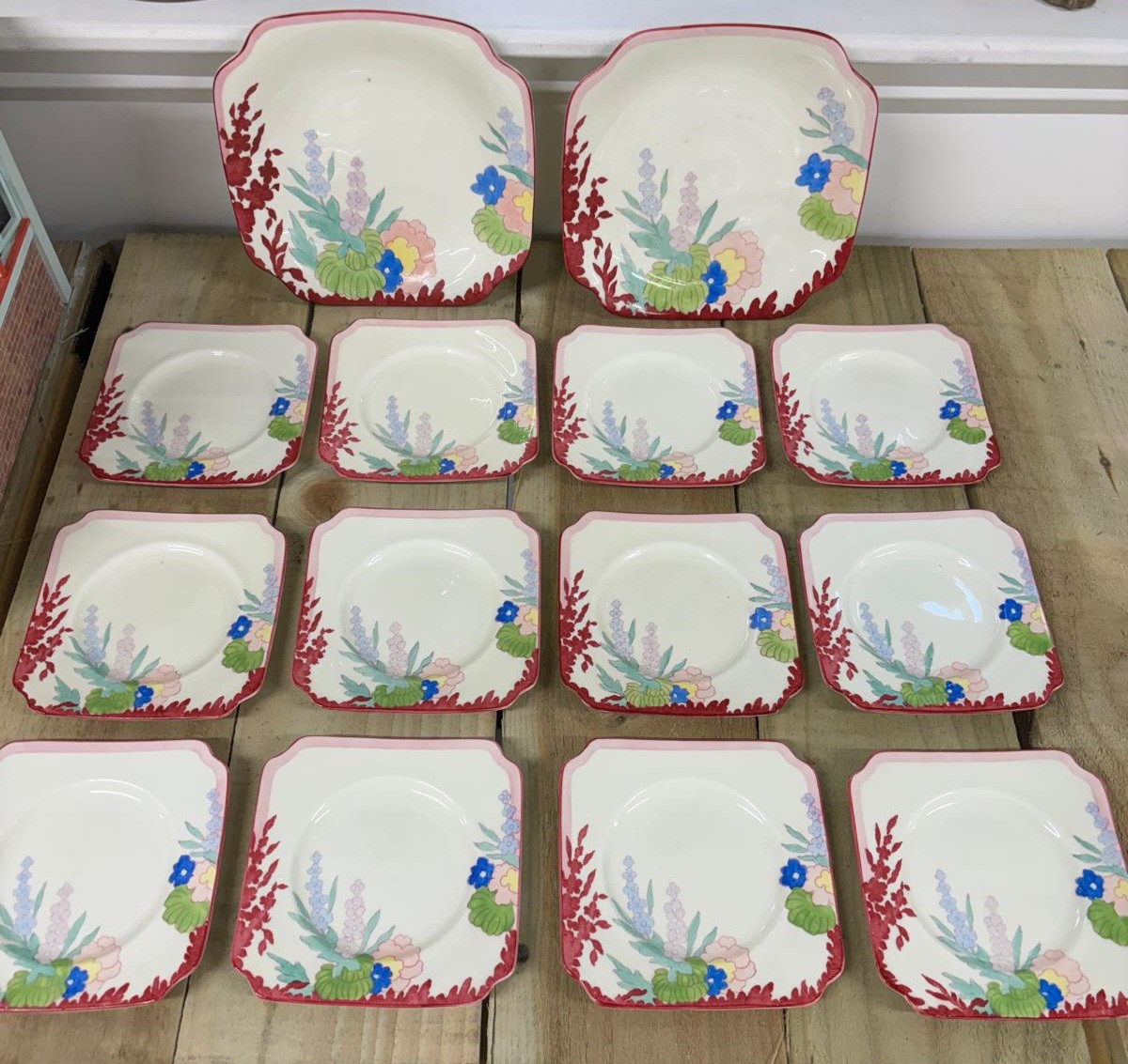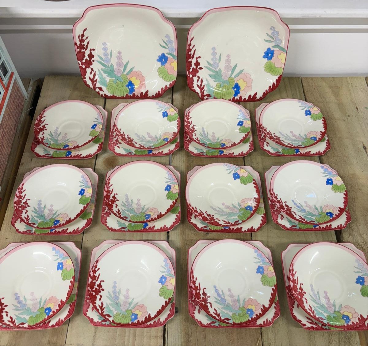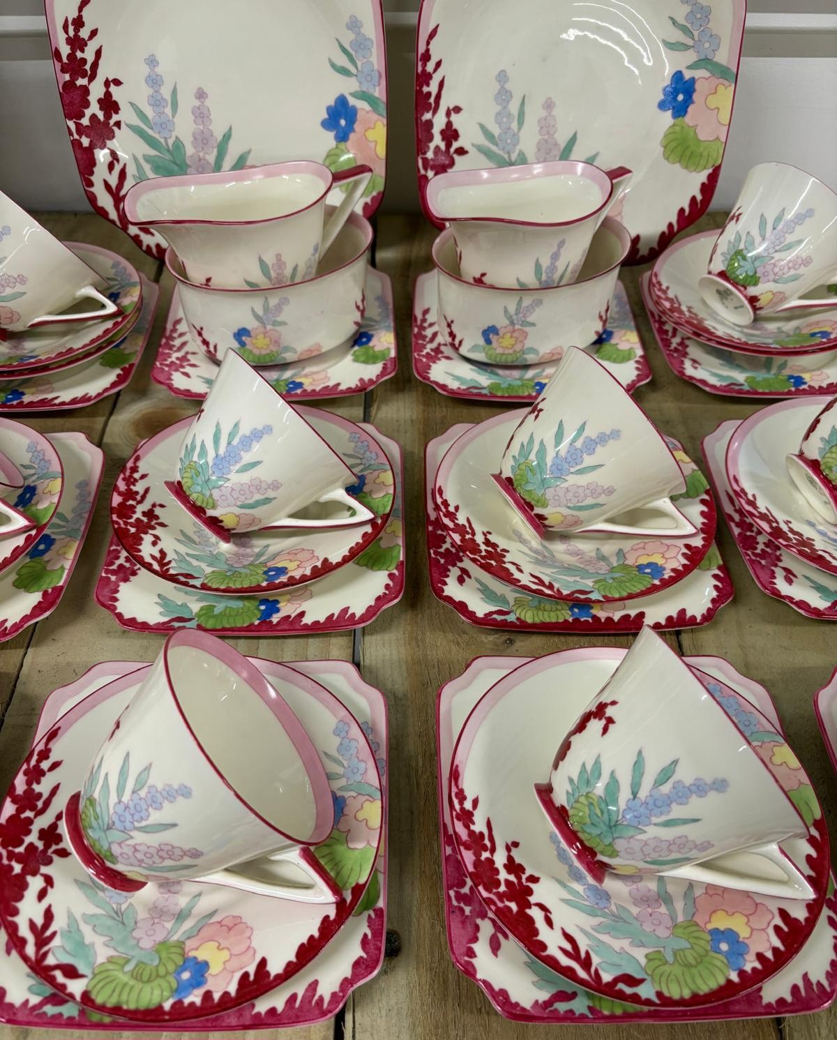 Art Deco design Royal Doulton "Ella" pattern tea set with two cake plates, two sugar and cream dishes. 40 pieces.