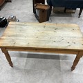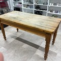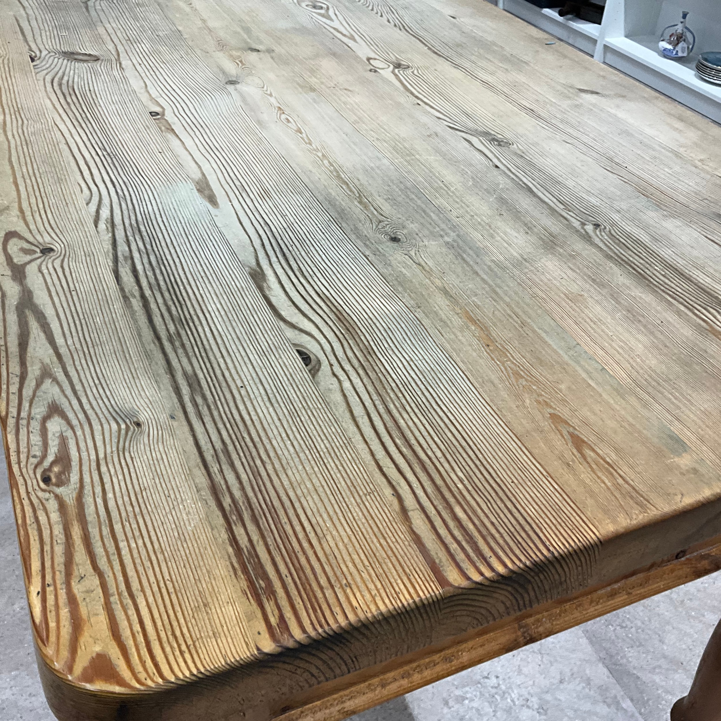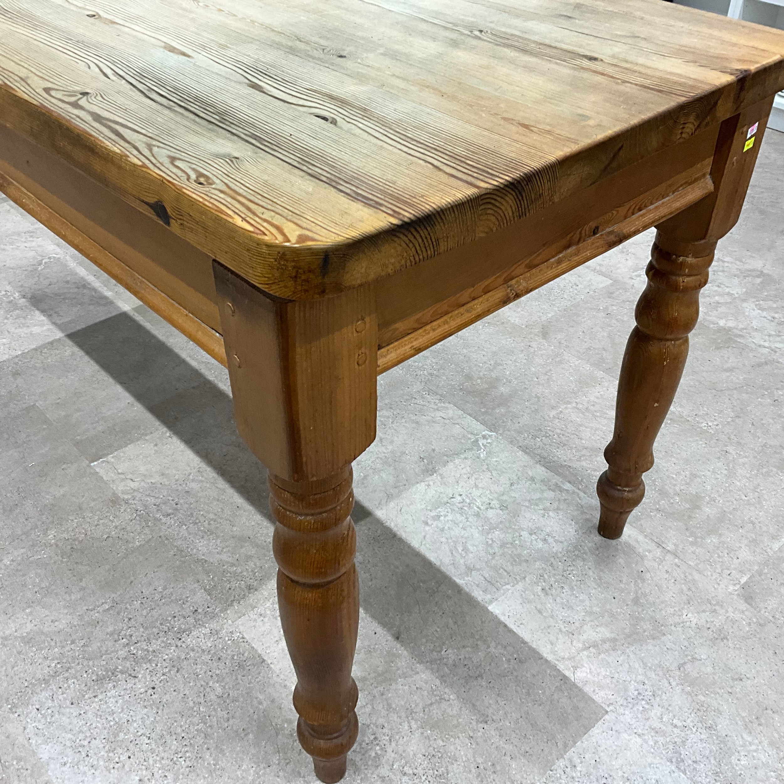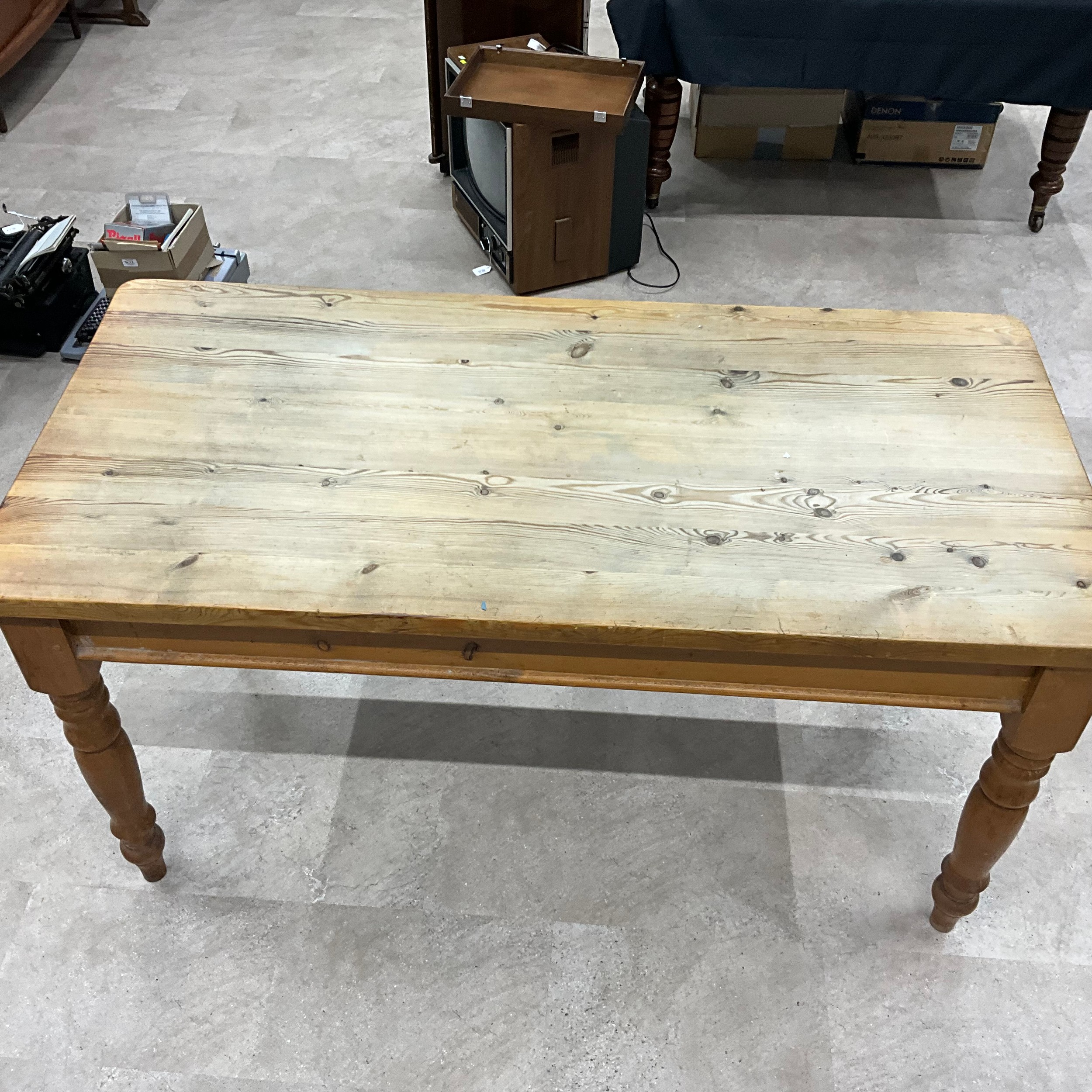 20th-century pine, scrubbed plank-top kitchen table, raised on turned supports. H79cm x W152cm x D73.5cm.