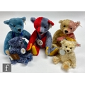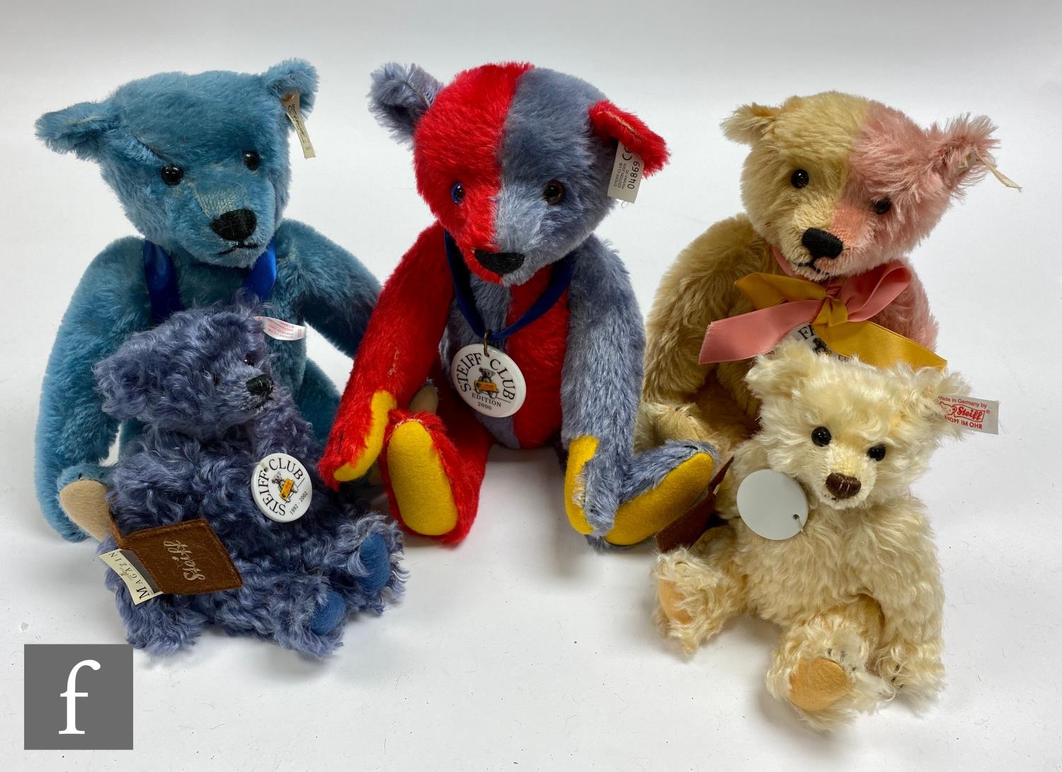 Five Steiff Club Edition teddy bears, comprising 1999 Millennium Bear, white tag 420184, with gold and rose mohair, height 30cm, 2000 Harlequin 1925 Replica Bear, white tag 420214, red and blue mohair, 1994 Blue 1908 Replica Bear, white tag 420047, blue mohair, and 2002 Jubilee Set, white tag 420306, blue mohair bear and cream mohair bear, each with bag with miniature Steiff magazine, all with porcelain tags. (5)