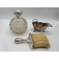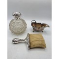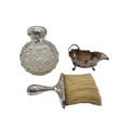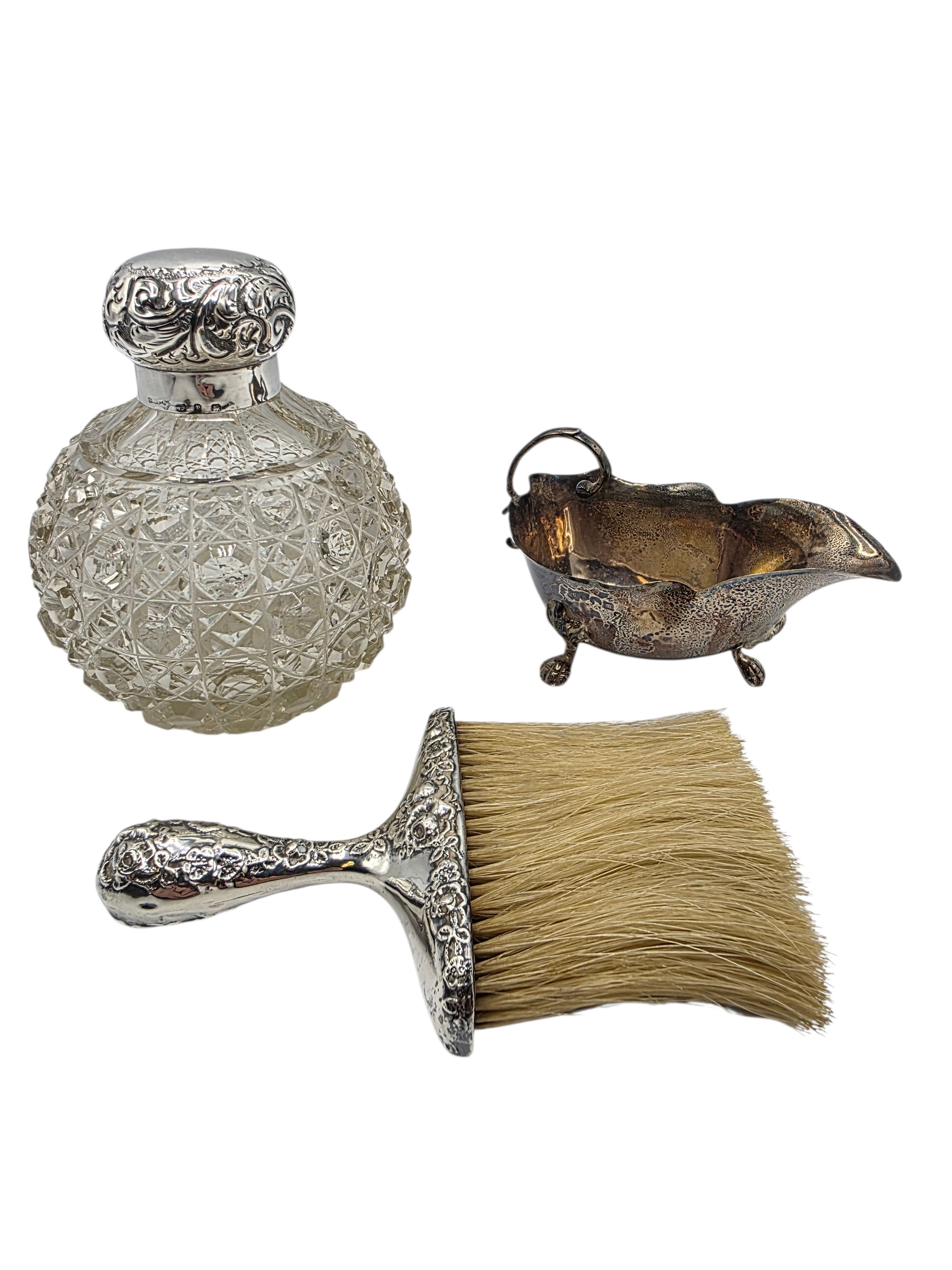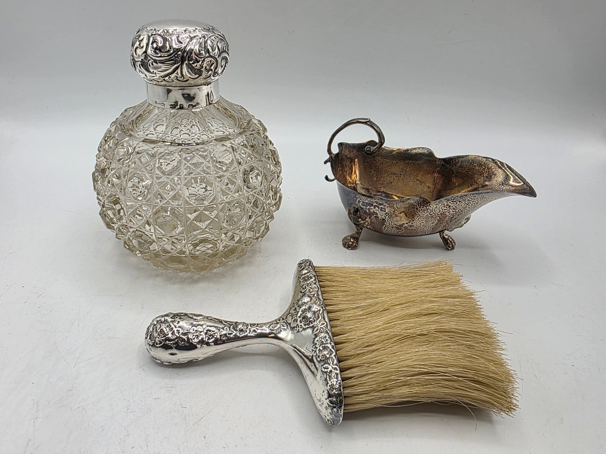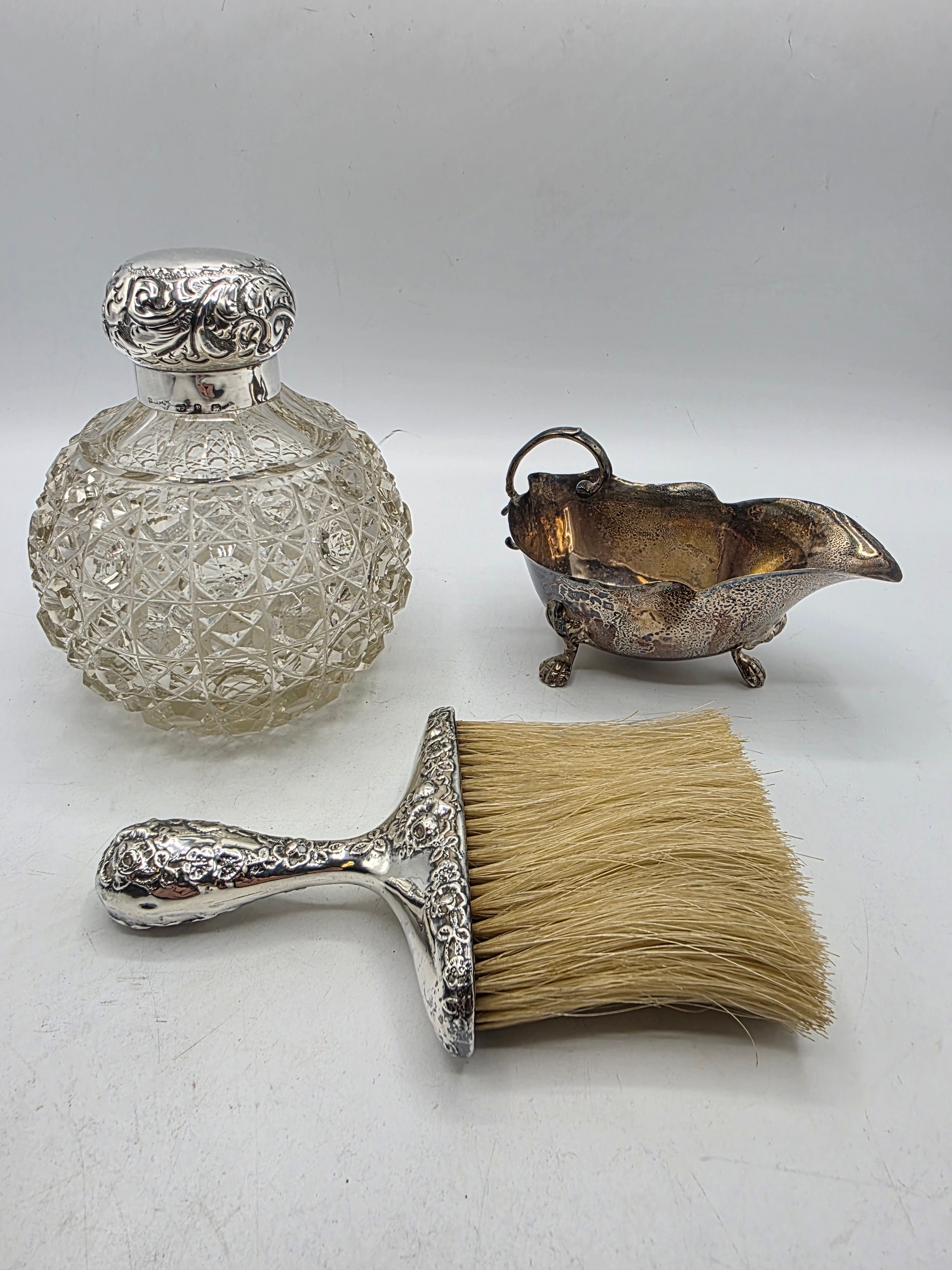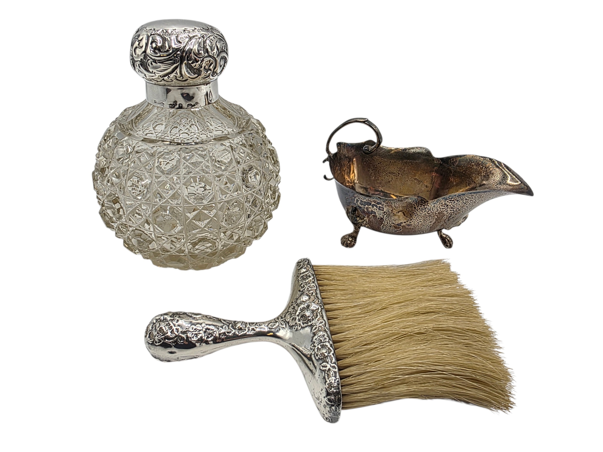 A collection of sterling silver items to include small sauceboat, silver topped glass scent bottle & white metal topped brush
