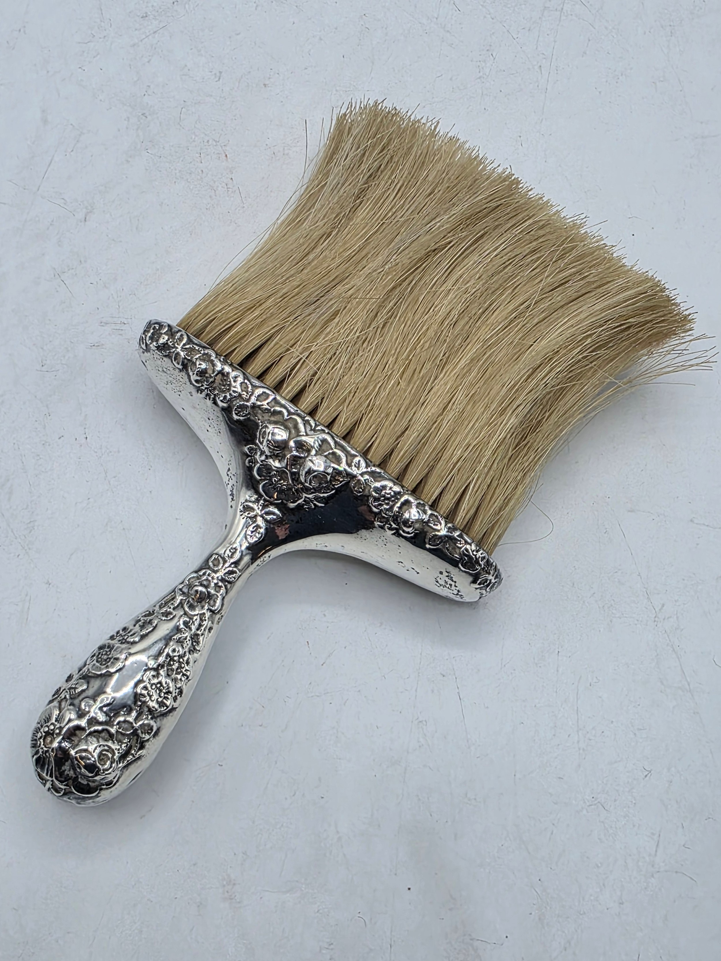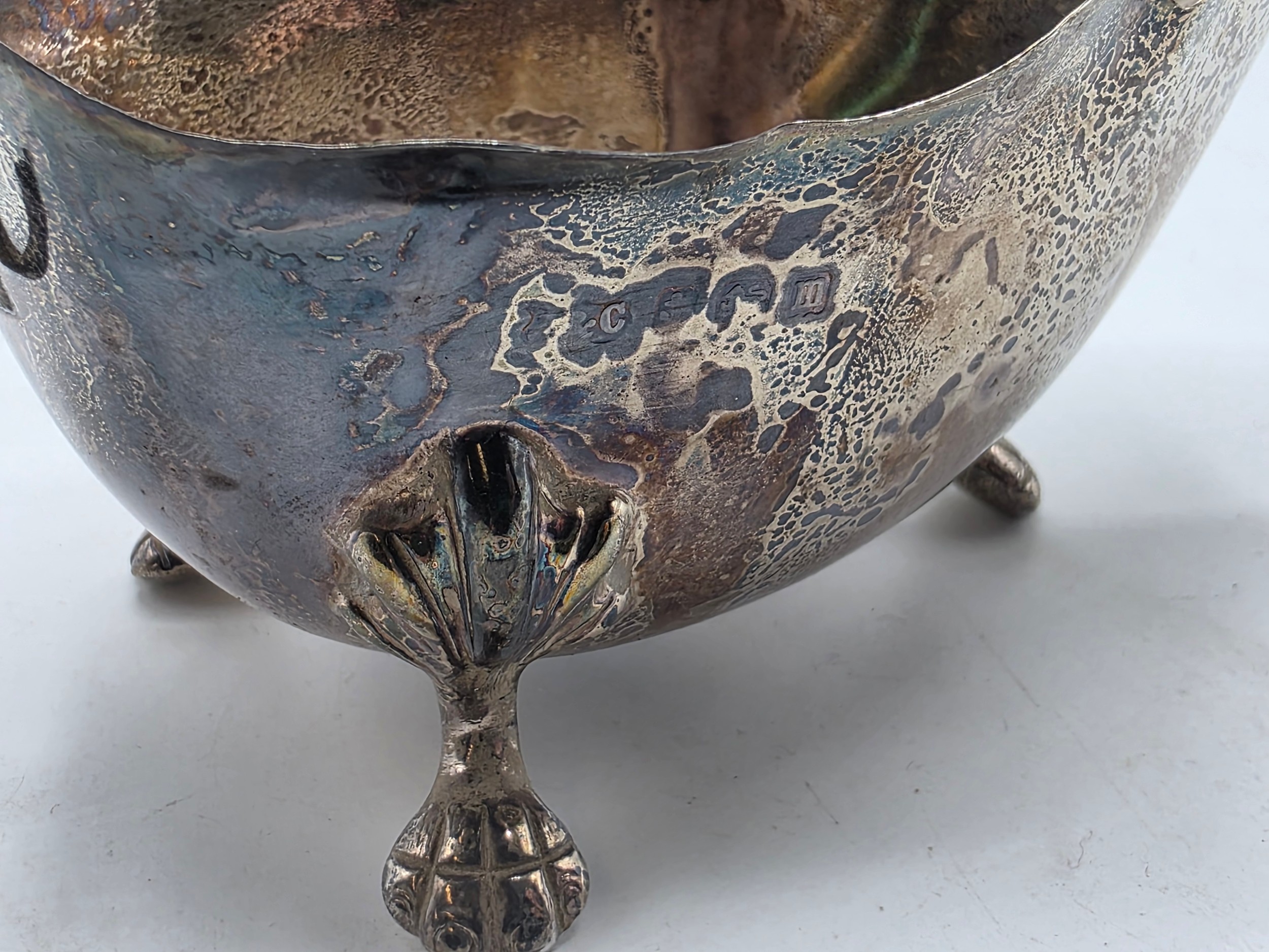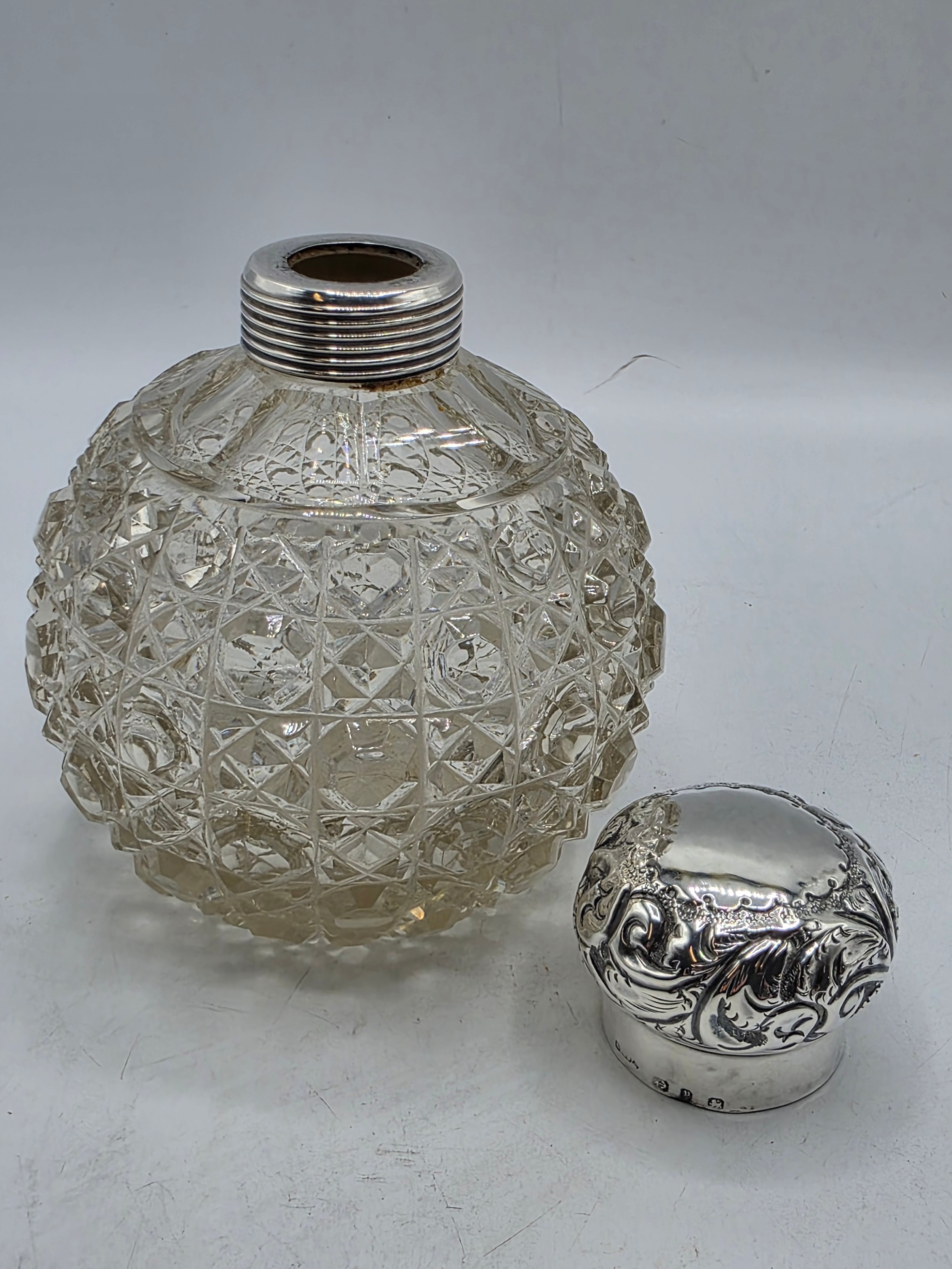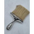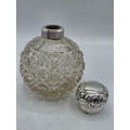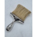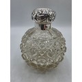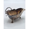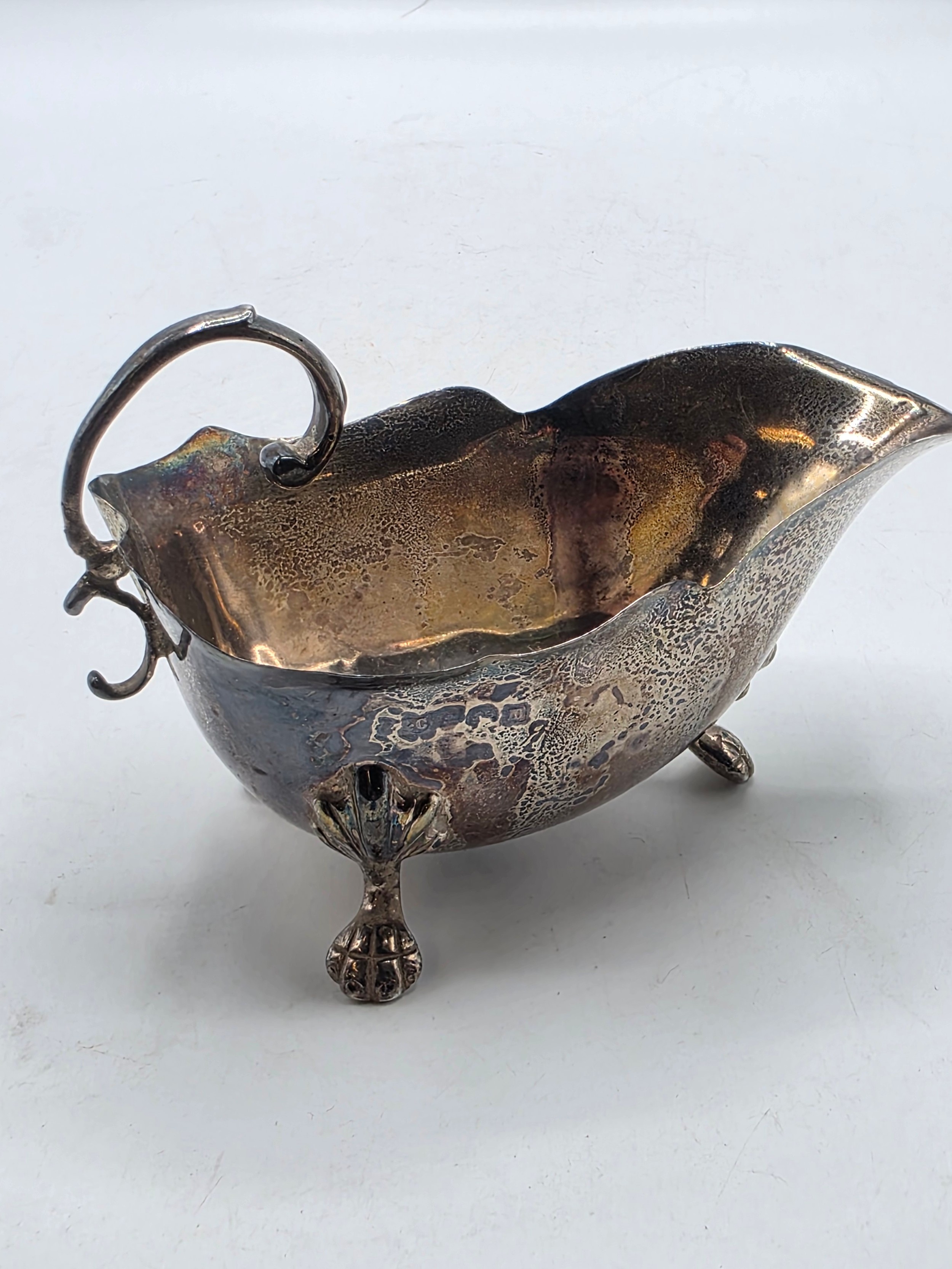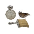 A collection of sterling silver items to include small sauceboat, silver topped glass scent bottle & white metal topped brush