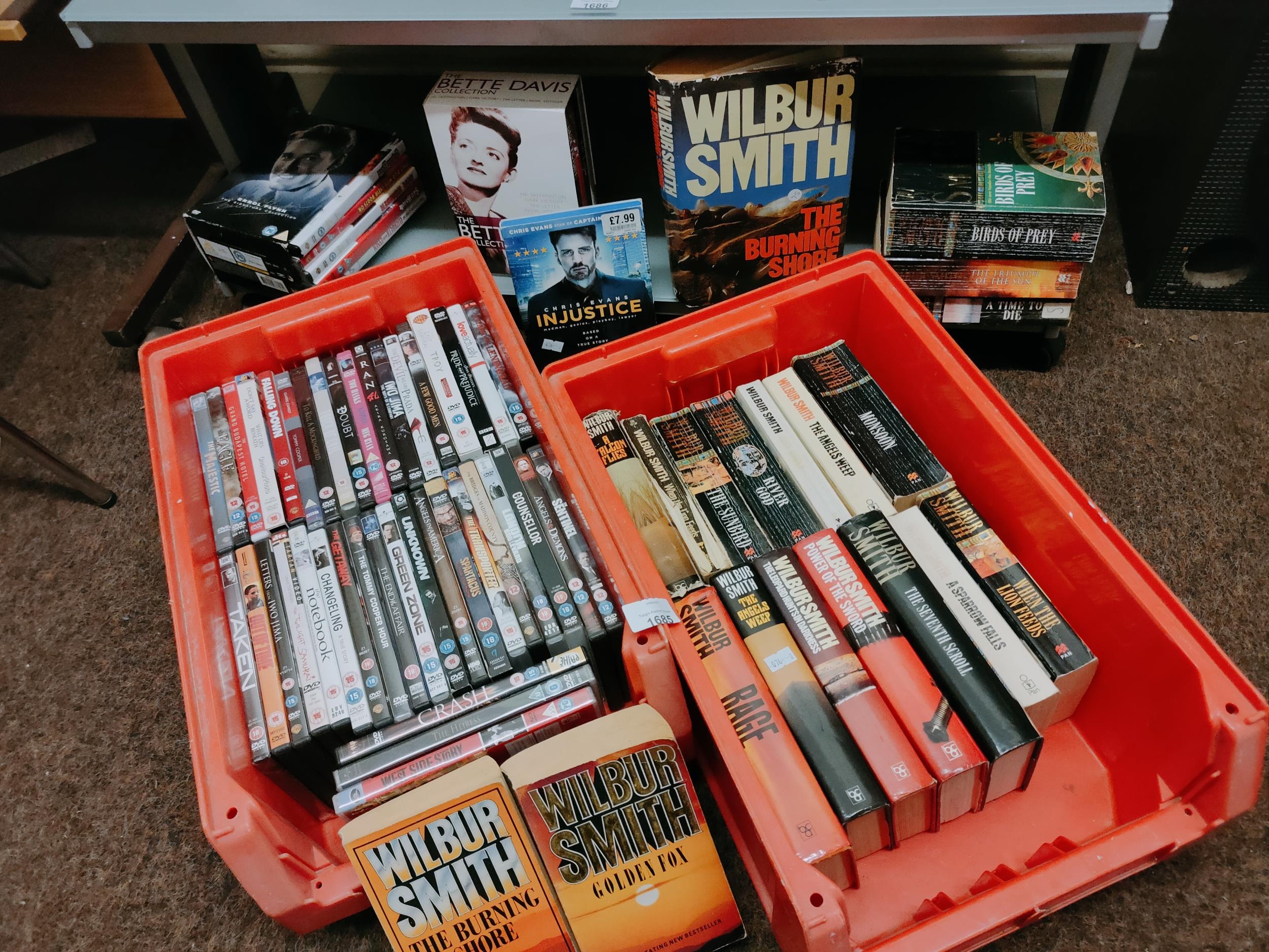 Large collection of Wilbur Smith novels together with a huge selection of DVD's including an Errol Flynn collection