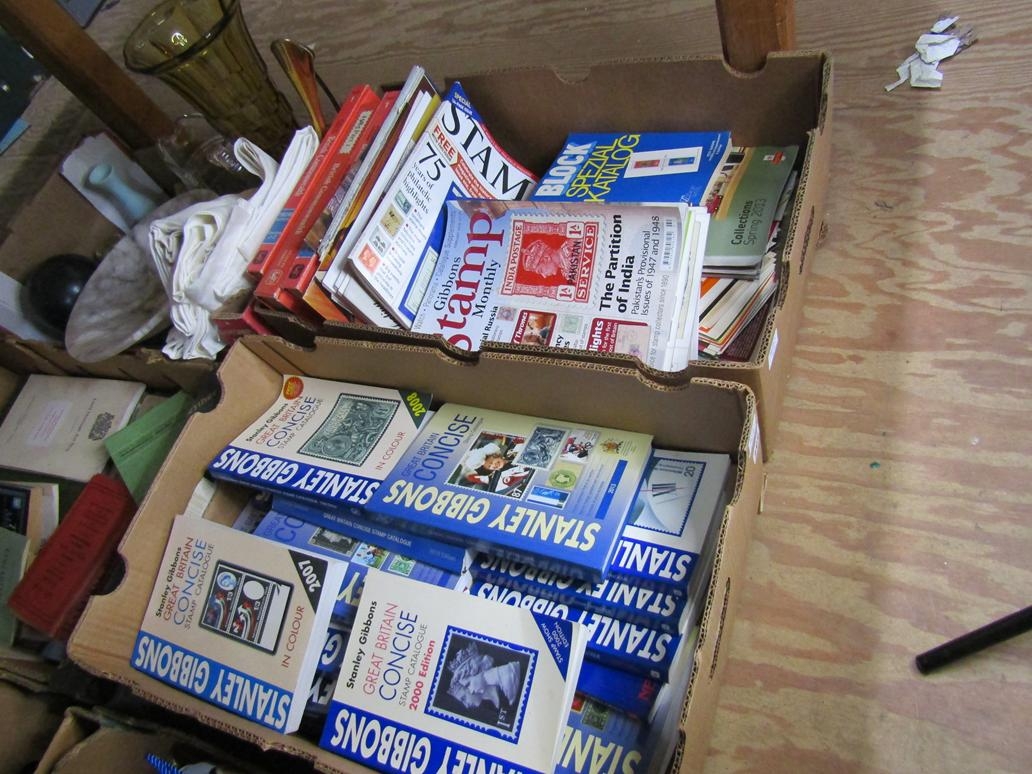 TWO BOXES OF STAMP BOOKS AND MAGAZINES